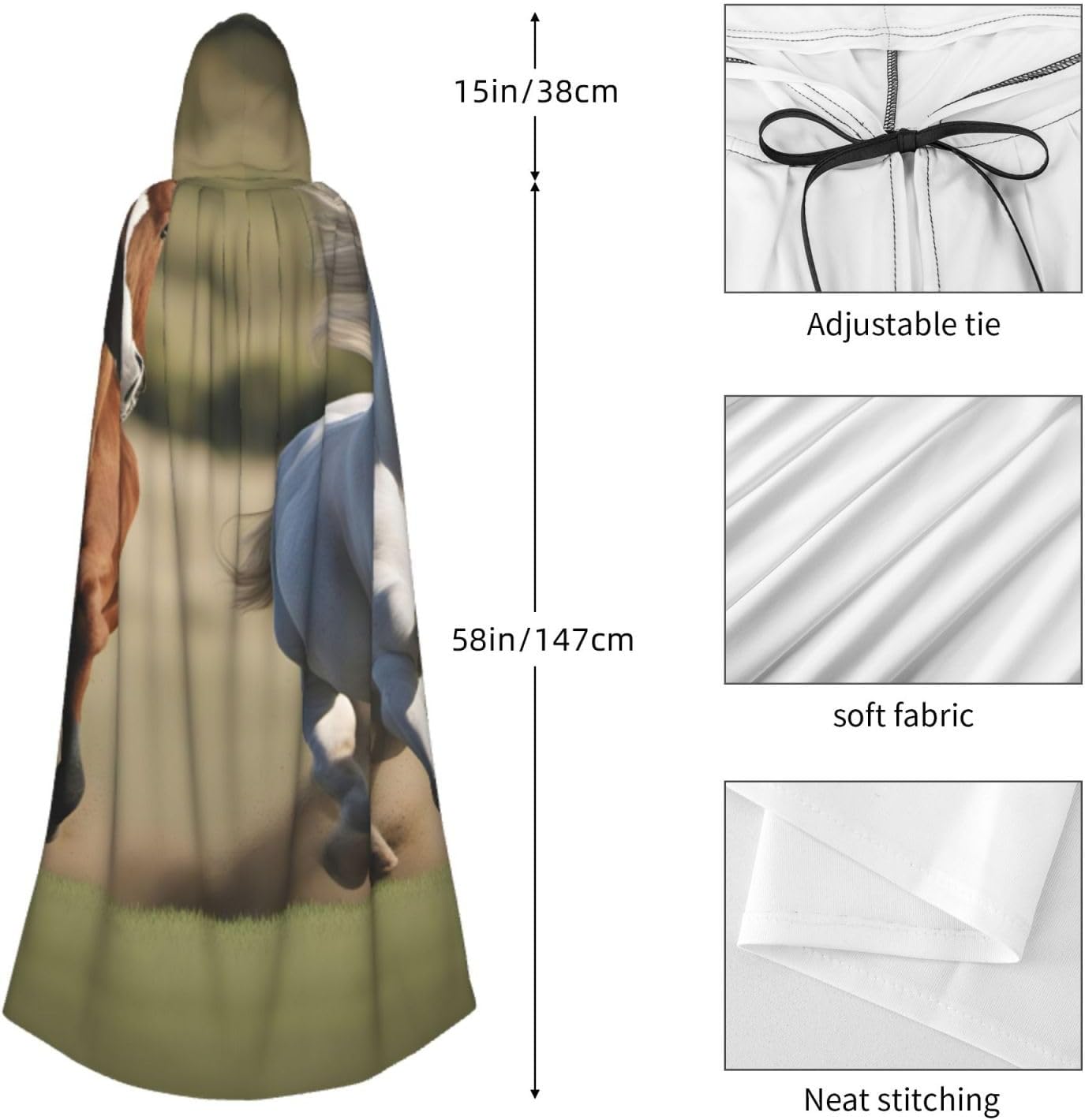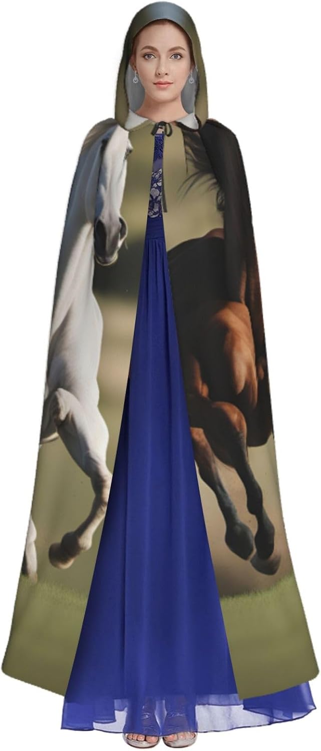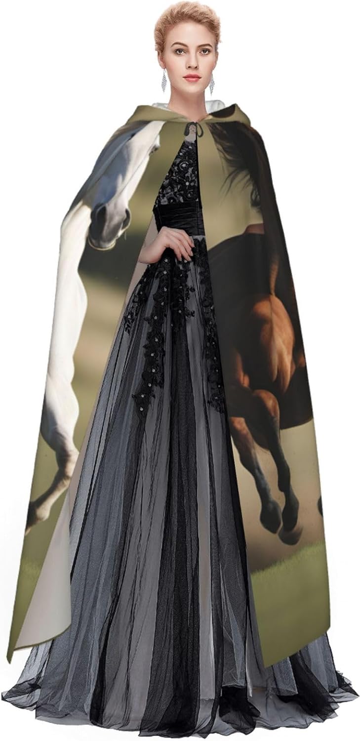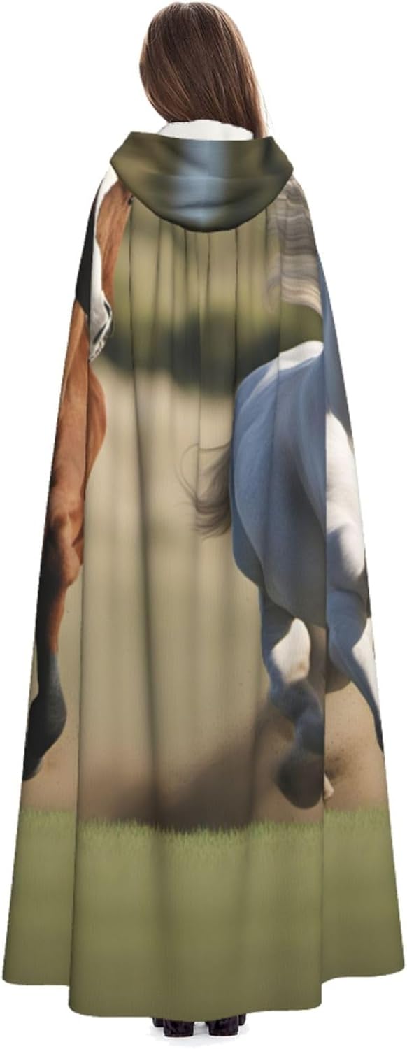 Il design senza cerniera, abbinato a un grande mantello con cappuccio e cravatta al collo, migliora il tuo mistero mantenendoti comodo con il suo tessuto non prurito. Con una lunghezza di 147 cm, larghezza di 154 cm e un'altezza del cappuccio di 38 cm, il nostro mantello con cappuccio con stampa di cavalli da corsa offre una copertura completa, assicurandoti di distinguerti in ogni occasione. Vari eventi come Halloween, cosplay, costumi da palcoscenico, feste a tema, balli, convegni di fumetti e molto altro ancora, il nostro mantello è versatile e conveniente. Facile da mantenere e di lunga durata, il nostro mantello con cappuccio con stampa cavalli da corsa è lavabile in lavatrice e lavabile a mano. Con un design neutro, il nostro mantello è perfetto per uomini e donne.