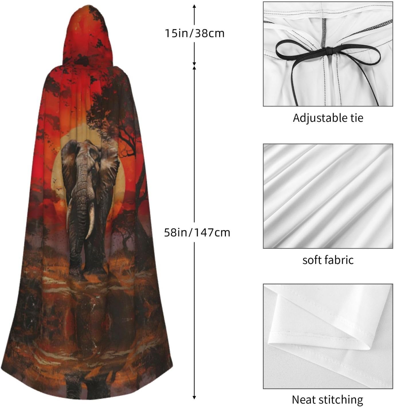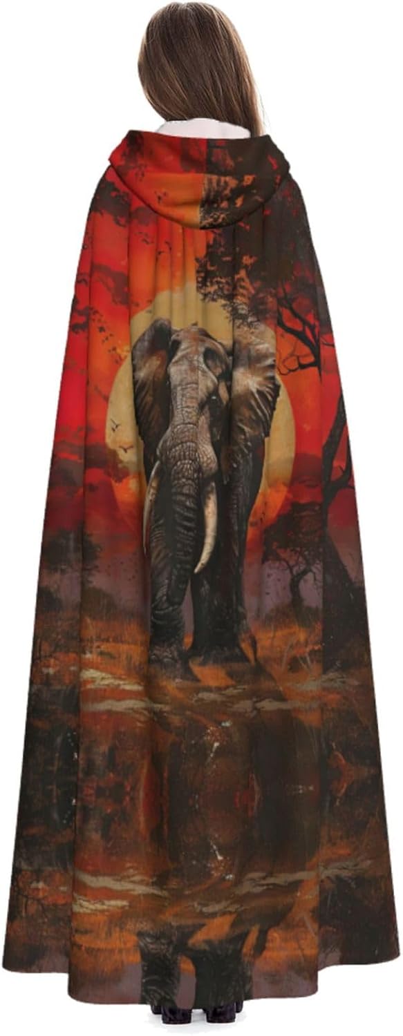 Il design senza cerniera, abbinato a un grande mantello con cappuccio e cravatta al collo, migliora il tuo mistero mantenendoti comodo con il suo tessuto non prurito. Con una lunghezza di 147 cm, larghezza di 154 cm e un'altezza del cappuccio di 38 cm, il nostro mantello con cappuccio con stampa elefante tramonto offre una copertura completa, assicurandoti di distinguerti in ogni occasione. Vari eventi come Halloween, cosplay, costumi da palcoscenico, feste a tema, balli, convegni di fumetti e molto altro ancora, il nostro mantello è versatile e conveniente. Facile da mantenere e di lunga durata, il nostro mantello con cappuccio con stampa elefante tramonto è lavabile in lavatrice e lavabile a mano. Con un design neutro, il nostro mantello è perfetto per uomini e donne.
