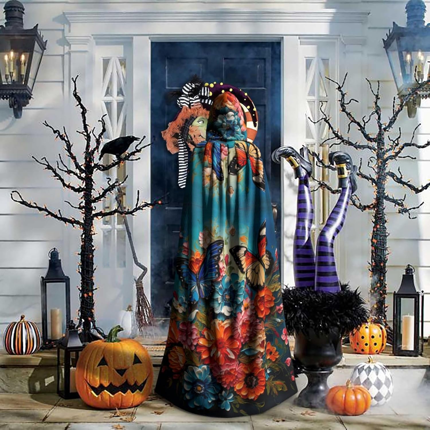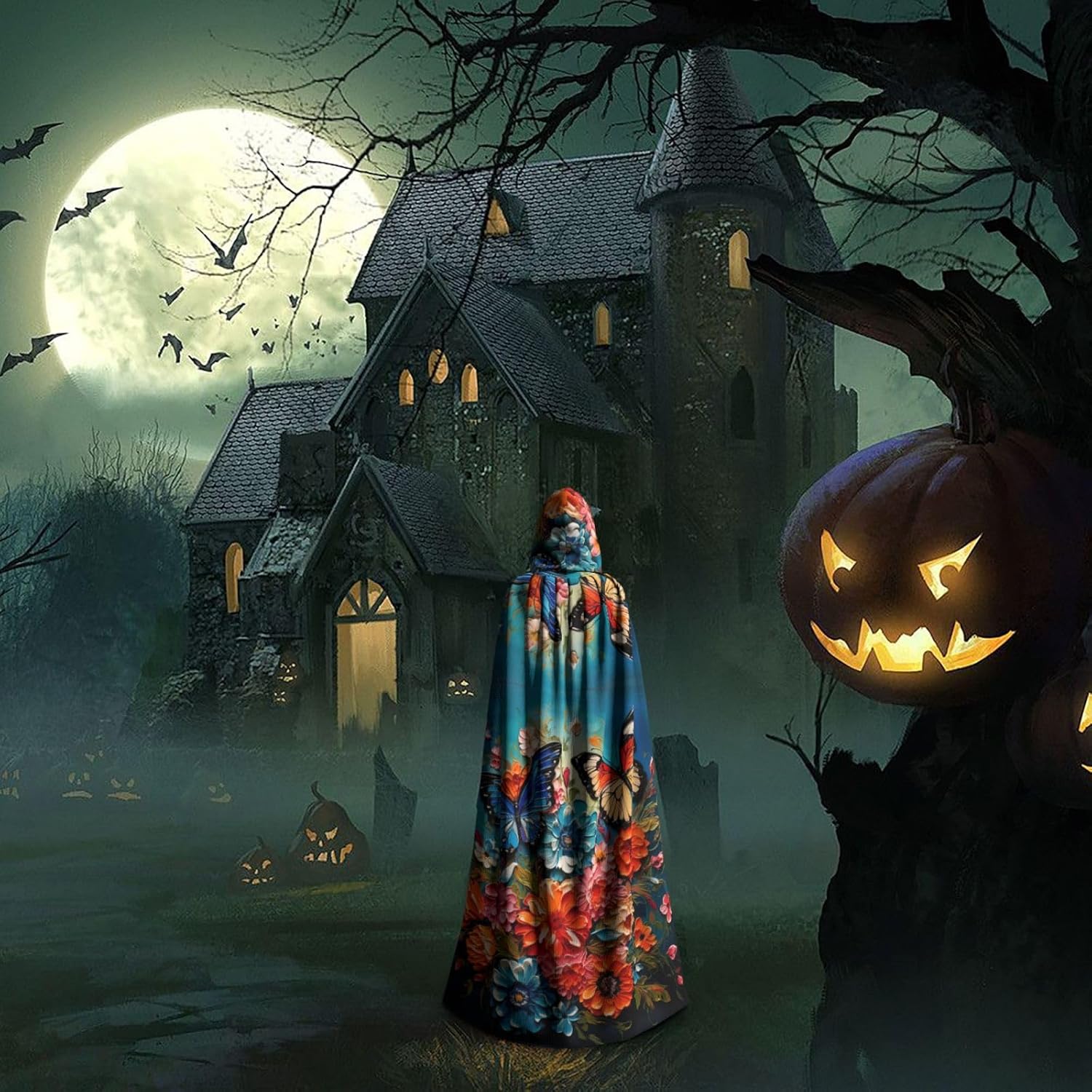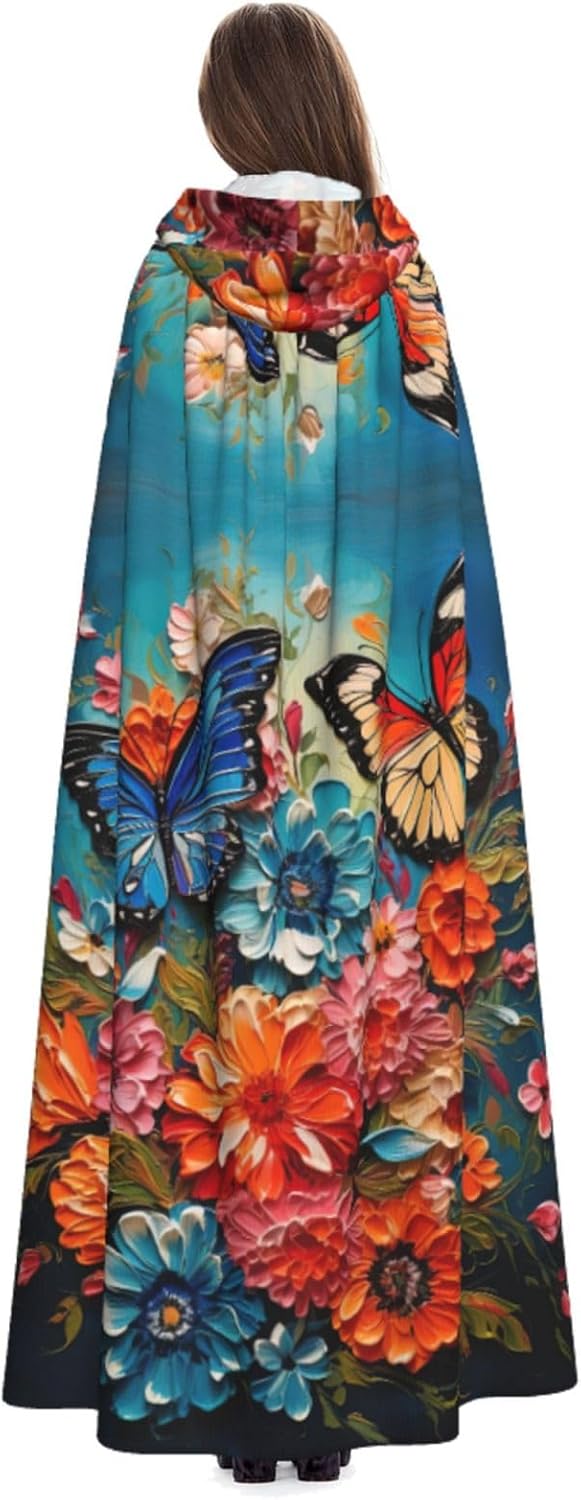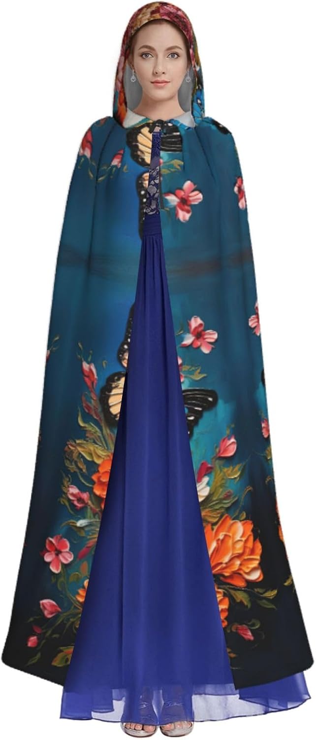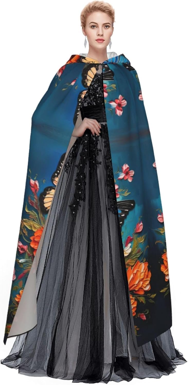 Mantello con cappuccio per Halloween e cosplay, con stampa di fiori e farfalle, comodo mantello con cappuccio per adulti