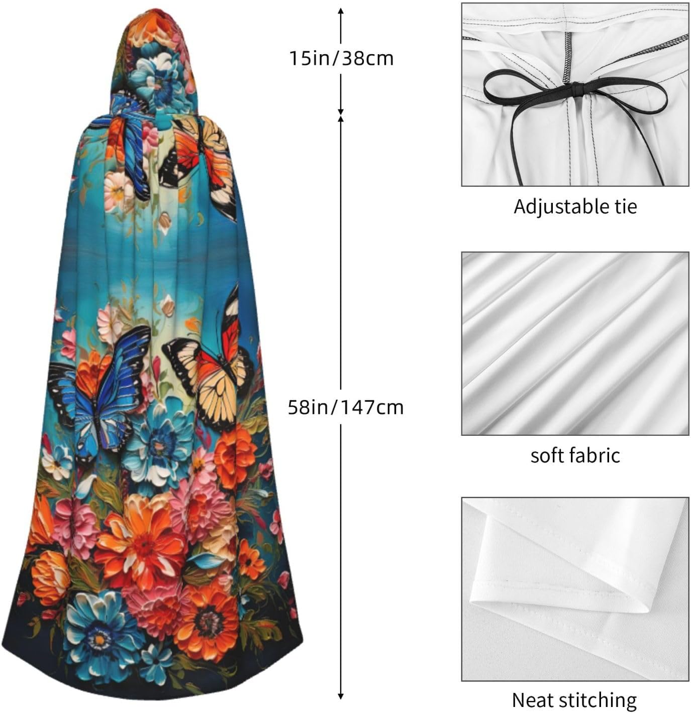 Il design senza cerniera, abbinato a un grande mantello con cappuccio e cravatta al collo, migliora il tuo mistero mantenendoti comodo con il suo tessuto non prurito. Con una lunghezza di 147 cm, larghezza di 154 cm e un'altezza del cappuccio di 38 cm, il nostro mantello con cappuccio con stampa di fiori e farfalle offre una copertura completa, assicurandoti di distinguerti in ogni occasione. Vari eventi come Halloween, cosplay, costumi da palcoscenico, feste a tema, balli, convegni di fumetti e molto altro ancora, il nostro mantello è versatile e conveniente. Facile da mantenere e di lunga durata, il nostro mantello con cappuccio con stampa di fiori e farfalle è lavabile in lavatrice e lavabile a mano. Con un design neutro, il nostro mantello è perfetto per uomini e donne.