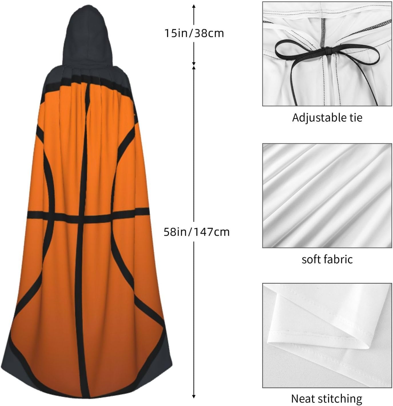 Il design senza cerniera, abbinato a un grande mantello con cappuccio e cravatta al collo, migliora il tuo mistero mantenendoti comodo con il suo tessuto non prurito. Con una lunghezza di 147 cm, larghezza di 154 cm e un'altezza del cappuccio di 38 cm, il nostro mantello con cappuccio con stampa basket offre una copertura completa, assicurandoti di distinguerti in ogni occasione. Vari eventi come Halloween, cosplay, costumi da palcoscenico, feste a tema, balli, convegni di fumetti e molto altro ancora, il nostro mantello è versatile e conveniente. Facile da mantenere e di lunga durata, il nostro mantello con cappuccio con stampa basket è lavabile in lavatrice e lavabile a mano. Con un design neutro, il nostro mantello è perfetto per uomini e donne.