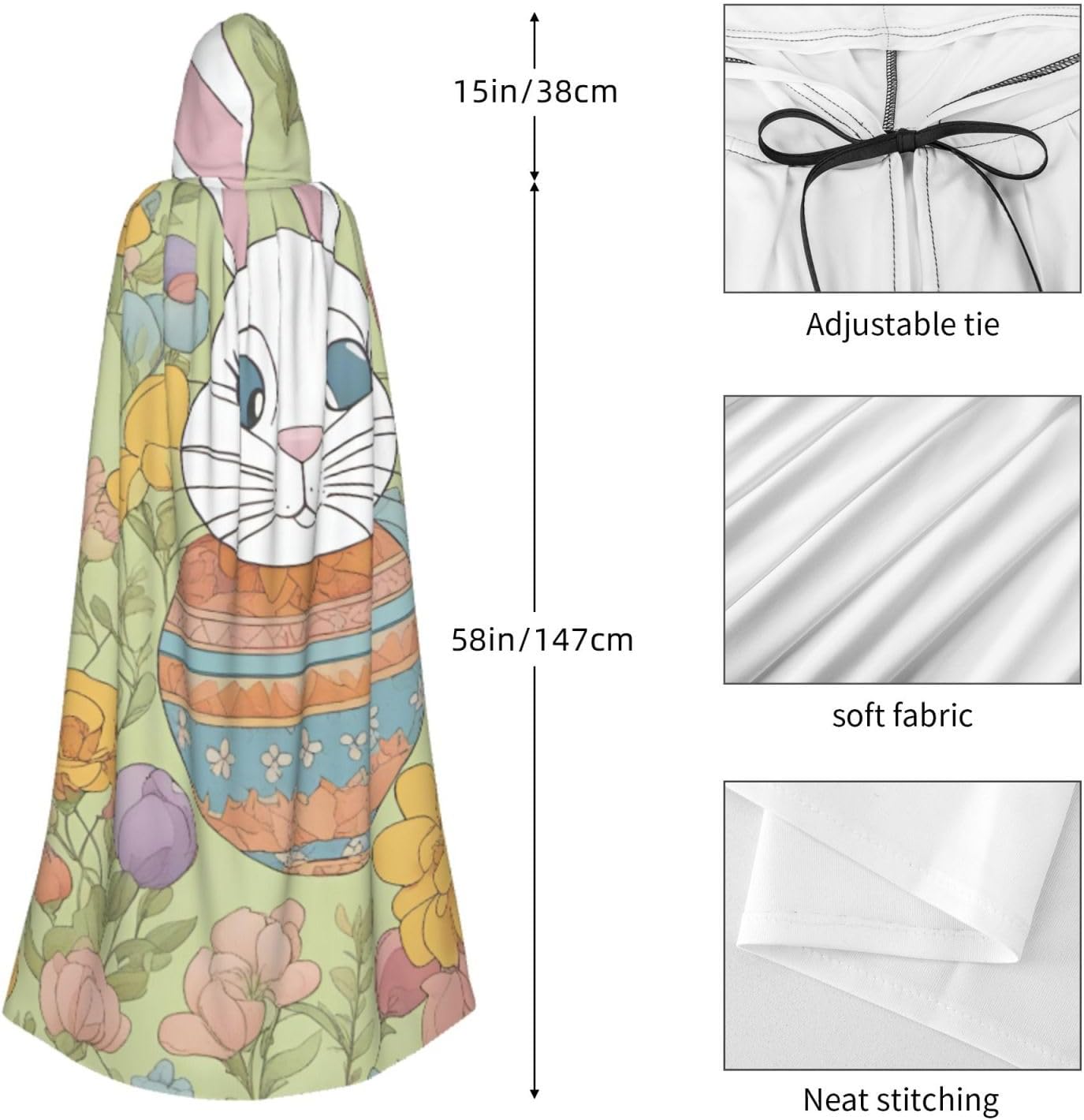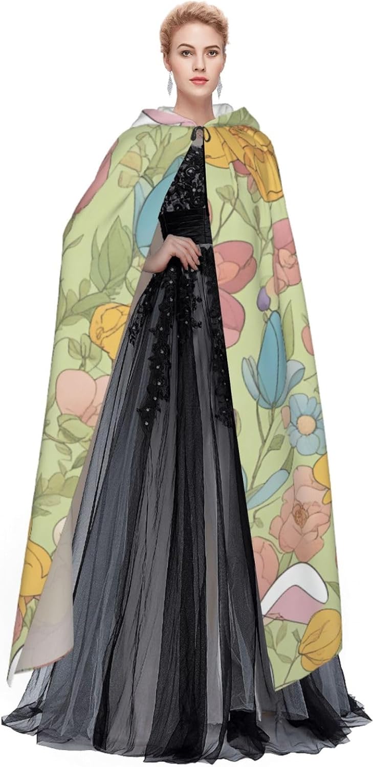 Il design senza cerniera, abbinato a un grande mantello con cappuccio e cravatta al collo, migliora il tuo mistero mantenendoti comodo con il suo tessuto non prurito. Con una lunghezza di 147 cm, larghezza di 154 cm e un'altezza del cappuccio di 38 cm, il nostro mantello con cappuccio con stampa floreale con coniglietto pasquale offre una copertura completa, assicurandoti di distinguerti in ogni occasione. Vari eventi come Halloween, cosplay, costumi da palcoscenico, feste a tema, balli, convegni di fumetti e molto altro ancora, il nostro mantello è versatile e conveniente. Facile da mantenere e di lunga durata, il nostro mantello con cappuccio con stampa floreale con coniglietto pasquale è lavabile in lavatrice e lavabile a mano. Con un design neutro, il nostro mantello è perfetto per uomini e donne.