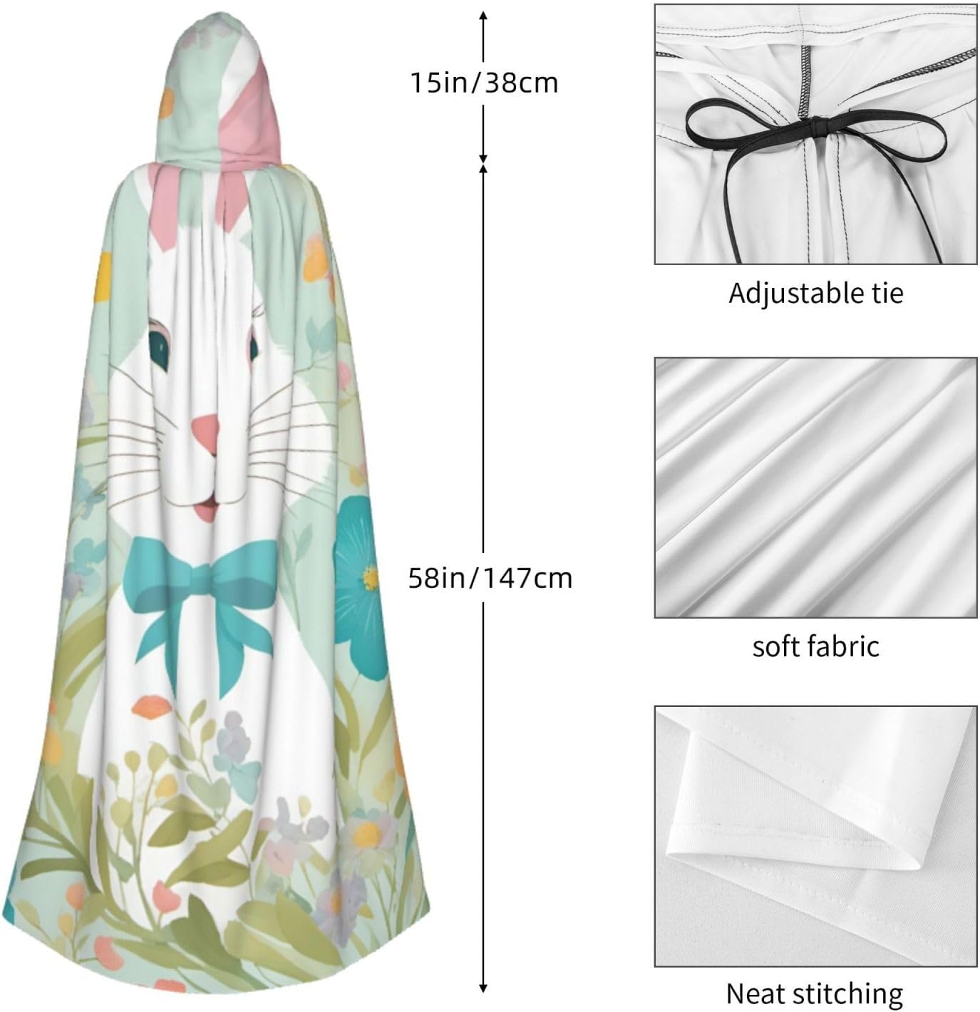 Il design senza cerniera, abbinato a un grande mantello con cappuccio e cravatta al collo, migliora il tuo mistero mantenendoti comodo con il suo tessuto non prurito. Con una lunghezza di 147 cm, larghezza di 154 cm e un'altezza del cappuccio di 38 cm, il nostro mantello con cappuccio con stampa floreale con coniglietto pasquale offre una copertura completa, assicurandoti di distinguerti in ogni occasione. Vari eventi come Halloween, cosplay, costumi da palcoscenico, feste a tema, balli, convegni di fumetti e molto altro ancora, il nostro mantello è versatile e conveniente. Facile da mantenere e di lunga durata, il nostro mantello con cappuccio con stampa floreale con coniglietto pasquale è lavabile in lavatrice e lavabile a mano. Con un design neutro, il nostro mantello è perfetto per uomini e donne.
