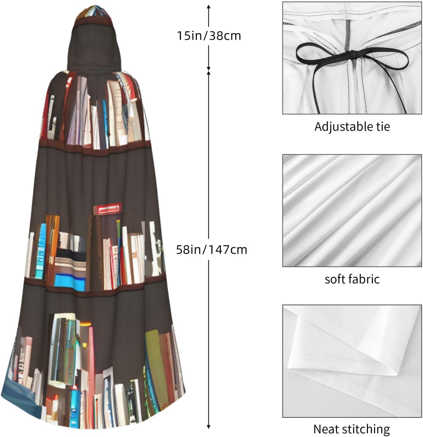 Il design senza cerniera, abbinato a un grande mantello con cappuccio e cravatta al collo, migliora il tuo mistero mantenendoti comodo con il suo tessuto non prurito. Con una lunghezza di 147 cm, una larghezza di 154 cm e un'altezza del cappuccio di 38 cm, il nostro mantello con cappuccio con stampa libreria offre una copertura completa, assicurandoti di distinguerti in ogni occasione. Vari eventi come Halloween, cosplay, costumi da palcoscenico, feste a tema, balli, convegni di fumetti e molto altro ancora, il nostro mantello è versatile e conveniente. Facile da mantenere e di lunga durata, il nostro mantello con cappuccio con stampa libreria è lavabile in lavatrice e lavabile a mano. Con un design neutro, il nostro mantello è perfetto per uomini e donne.