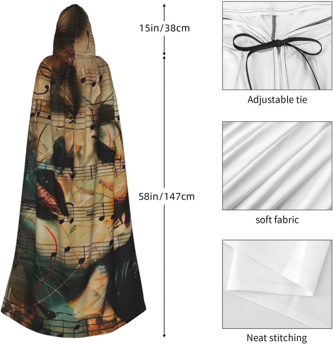 Il design senza cerniera, abbinato a un grande mantello con cappuccio e cravatta al collo, migliora il tuo mistero mantenendoti comodo con il suo tessuto non prurito. Con una lunghezza di 147 cm, una larghezza di 154 cm e un'altezza del cappuccio di 38 cm, il nostro mantello con cappuccio con stampa musicale offre una copertura completa, assicurandoti di distinguerti in ogni occasione. Vari eventi come Halloween, cosplay, costumi da palcoscenico, feste a tema, balli, convegni di fumetti e molto altro ancora, il nostro mantello è versatile e conveniente. Facile da mantenere e di lunga durata, il nostro mantello con cappuccio con stampa musicale è lavabile in lavatrice e lavabile a mano. Con un design neutro, il nostro mantello è perfetto per uomini e donne.
