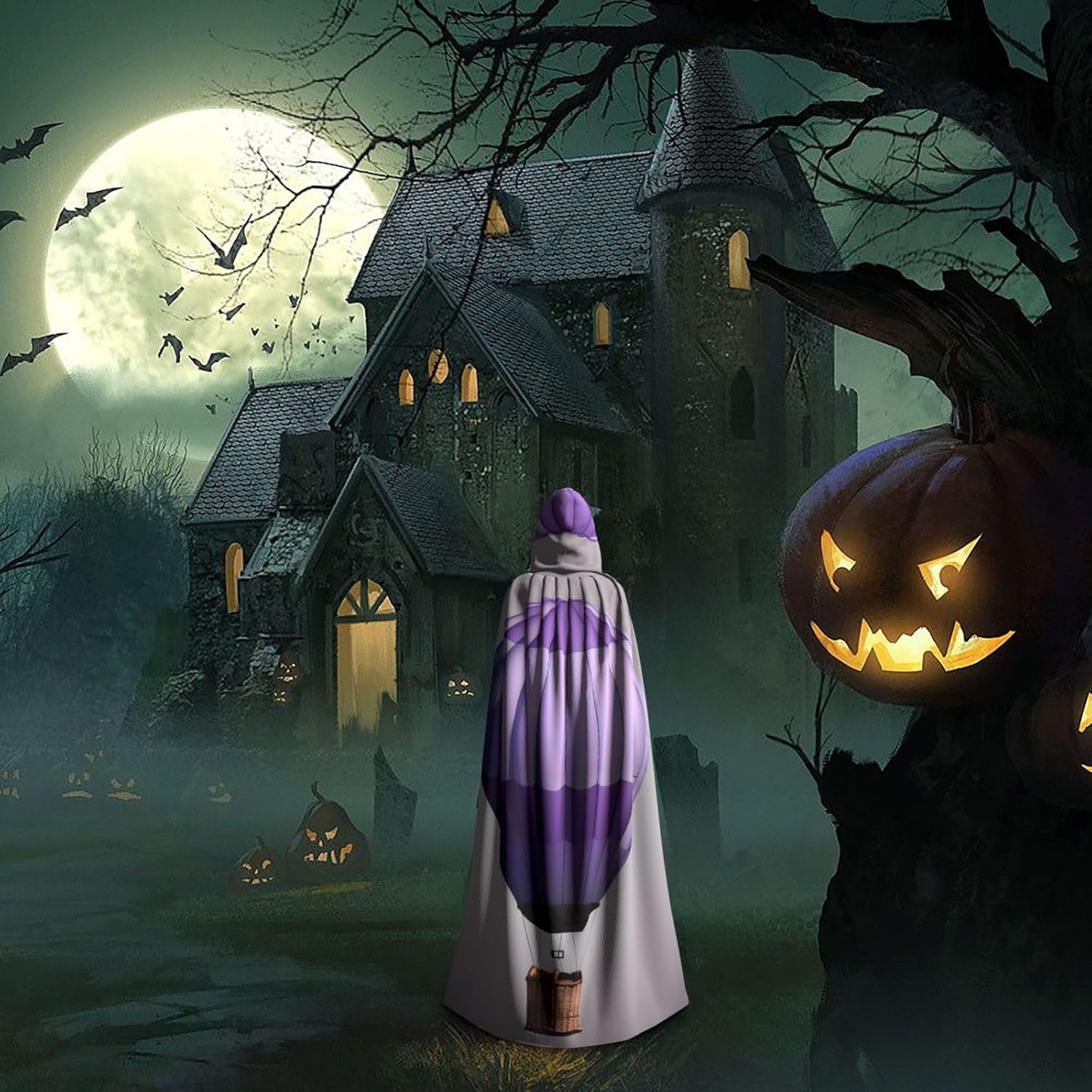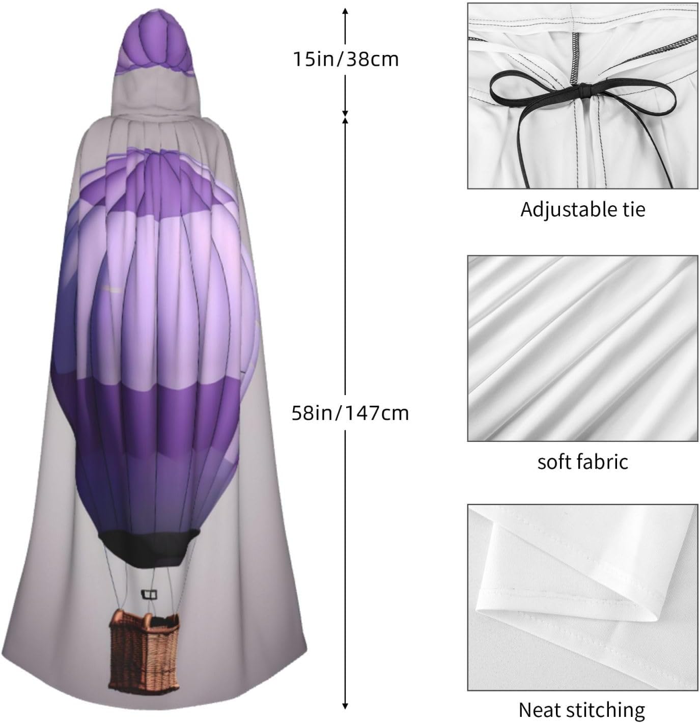 Ruba lo spettacolo a qualsiasi evento di Halloween o a tema con il nostro mantello con cappuccio. Realizzato con un tessuto confortevole e non pruriginoso, questo mantello con stampa di mongolfiera alla lavanda è progettato per assicurarti di distinguerti tra la folla. Il mantello è facile da indossare e togliere, grazie alla cravatta e all'assenza di una cerniera. Con un design facile da pulire, può essere lavato in lavatrice o a mano per garantire che sia sempre pronto per il tuo prossimo evento. Prova la perfetta miscela di comfort, stile e versatilità con il nostro mantello con cappuccio.