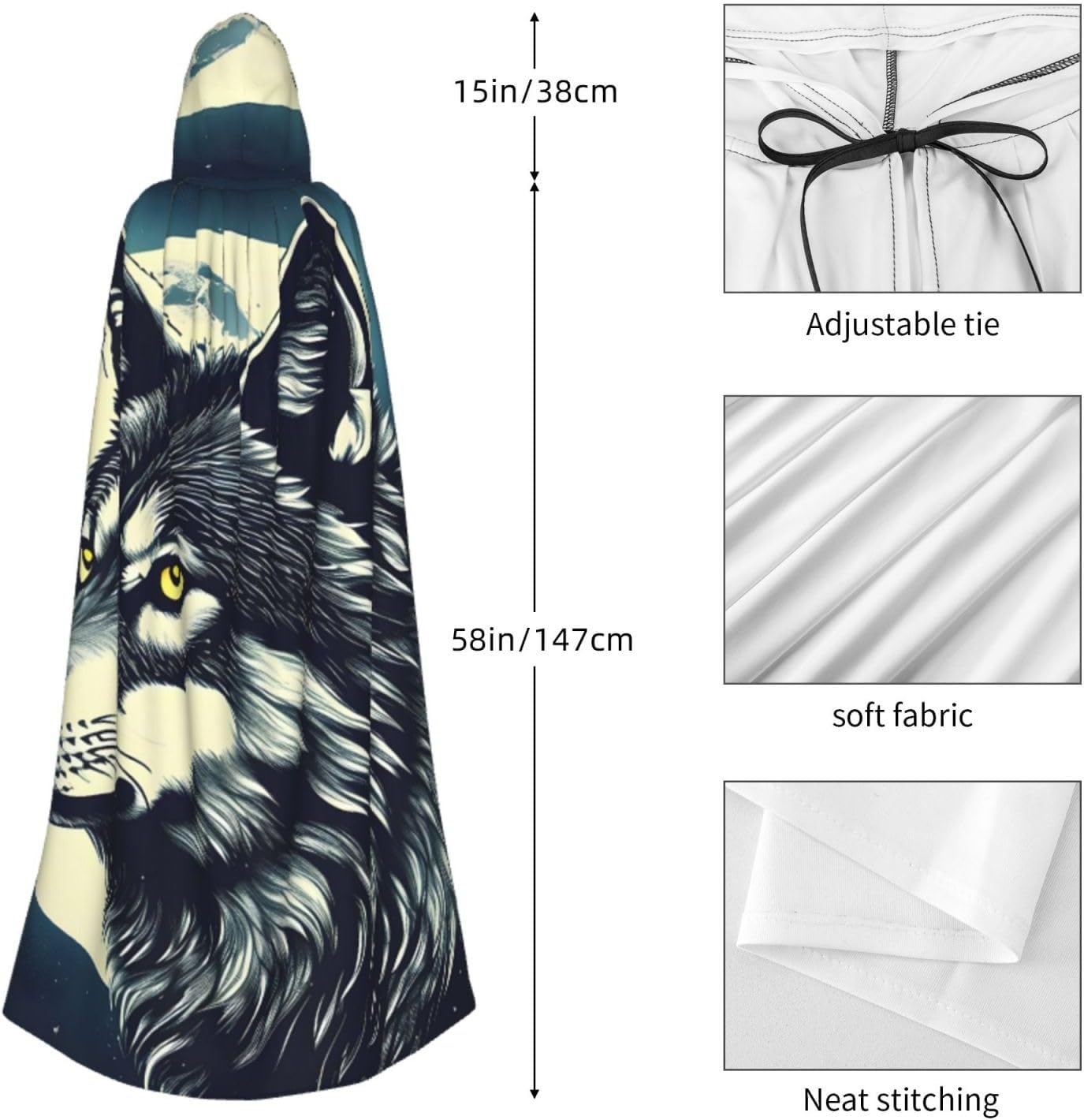 Il nostro mantello con stampa luna notturna lupo viene fornito con un cappuccio comodo e drammatico, insieme a una cravatta per un facile utilizzo, privo di cerniere che potrebbero rovinare l'estetica. Questo mantello con cappuccio con stampa luna notturna lupo promette un comfort eccezionale grazie al suo tessuto anti-prurito e offre una copertura completa adatta a tutte le età. Non importa dove ti trovi, distinguiti tra la folla con questo pezzo eccezionale. Versatile e facile da mantenere, questo mantello è per una serie di eventi, che si tratti di Halloween, balli in maschera, feste in costume o fumetti. Basta metterlo in lavatrice o lavarlo a mano e sei pronto ad andare. Vestiti nello spirito di Halloween e Cosplay con il nostro mantello con cappuccio con stampa lupo notte luna, offrendo la combinazione di comodità, comfort e stile.