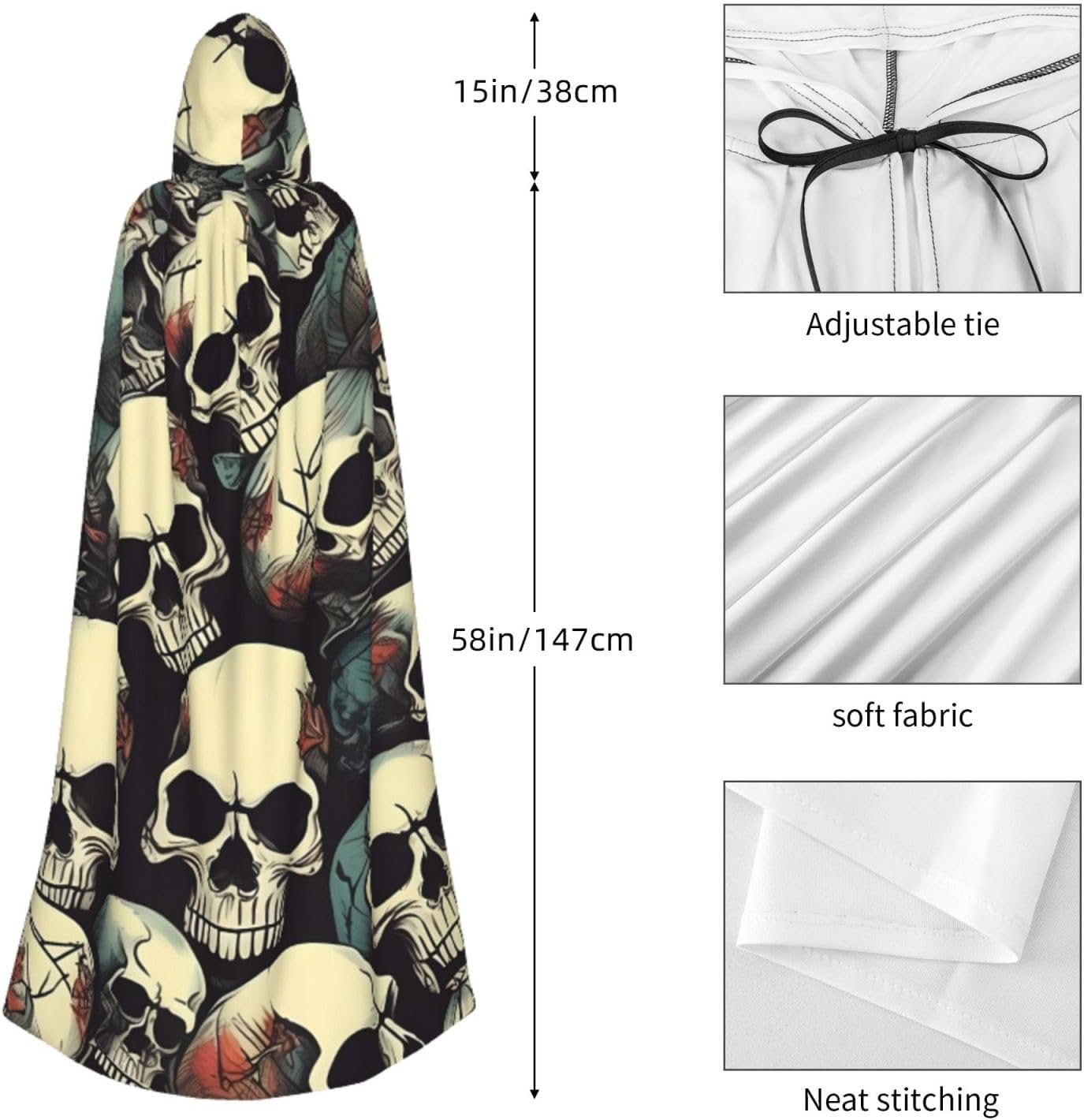 Il nostro mantello con stampa a scheletro viene fornito con un cappuccio comodo e drammatico, insieme a una cravatta per un facile utilizzo, privo di cerniere che potrebbero rovinare l'estetica. Questo mantello con cappuccio con stampa teschio promette un comfort eccezionale grazie al suo tessuto anti-prurito e offre una copertura completa adatta a tutte le età. Non importa dove ti trovi, distinguiti tra la folla con questo pezzo eccezionale. Versatile e facile da mantenere, questo mantello è per una serie di eventi, che si tratti di Halloween, balli in maschera, feste in costume o fumetti. Basta metterlo in lavatrice o lavarlo a mano e sei pronto ad andare. Vestiti nello spirito di Halloween e Cosplay con il nostro mantello con cappuccio con stampa scheletro, offrendo la combinazione di comodità, comfort e stile.