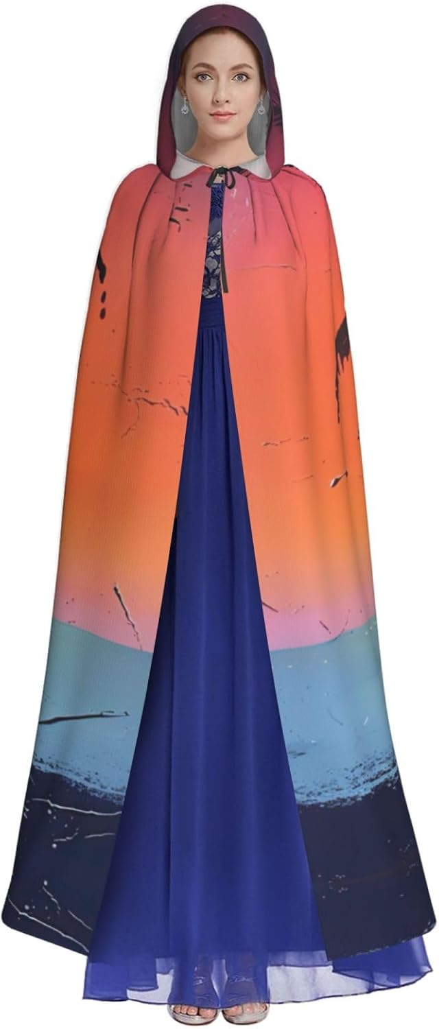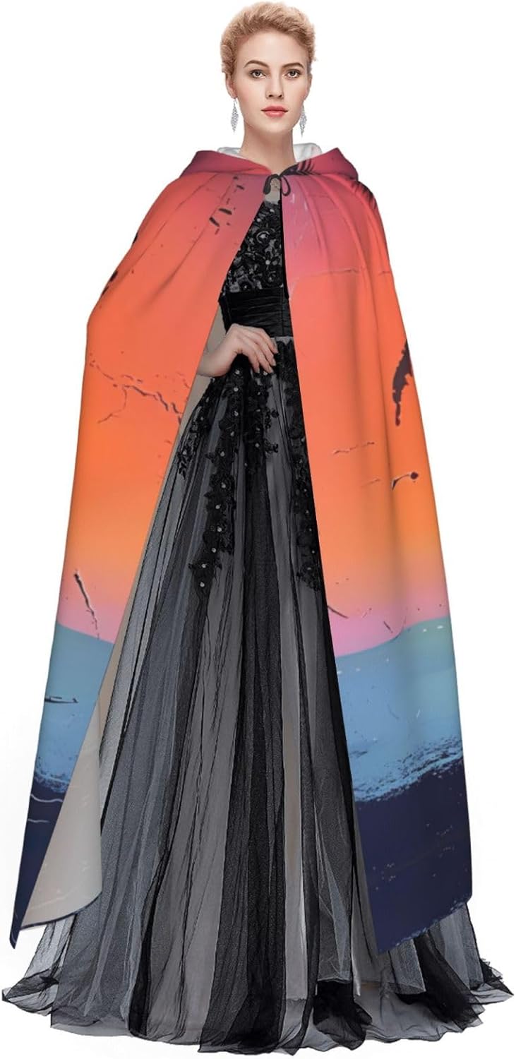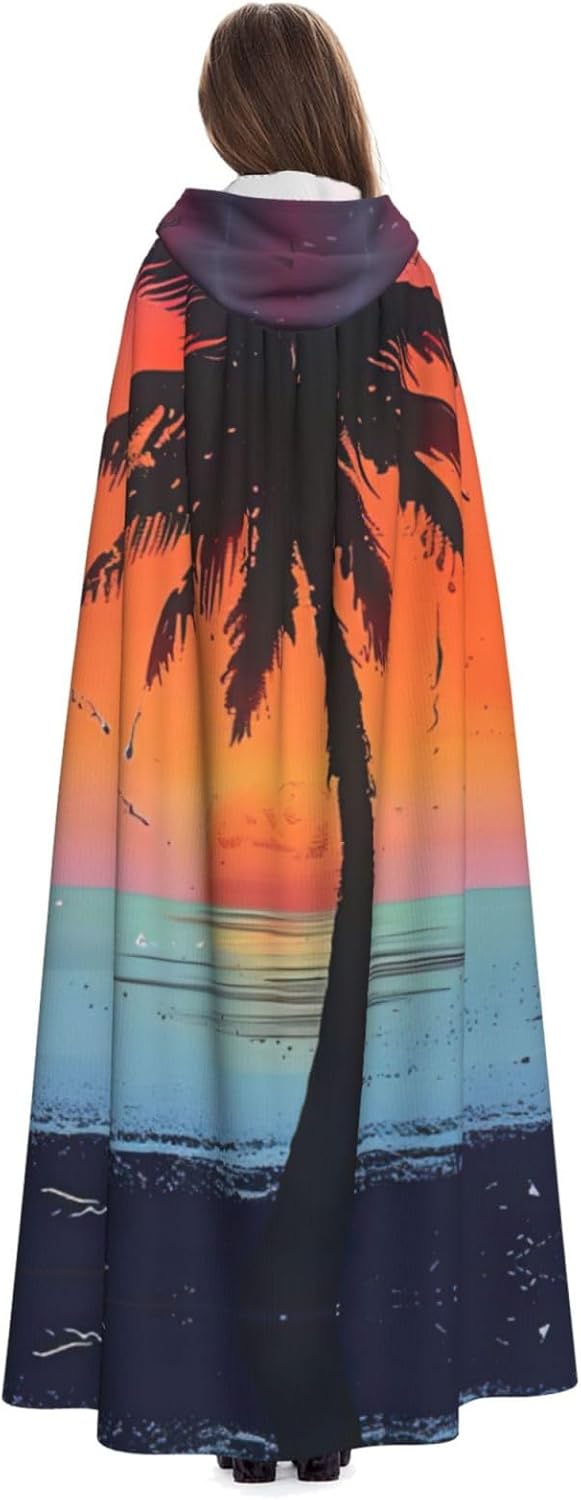 Mantello con cappuccio unisex con stampa tropicale del tramonto per adulti Halloween a lunghezza intera mantello da uomo con cappuccio costume
