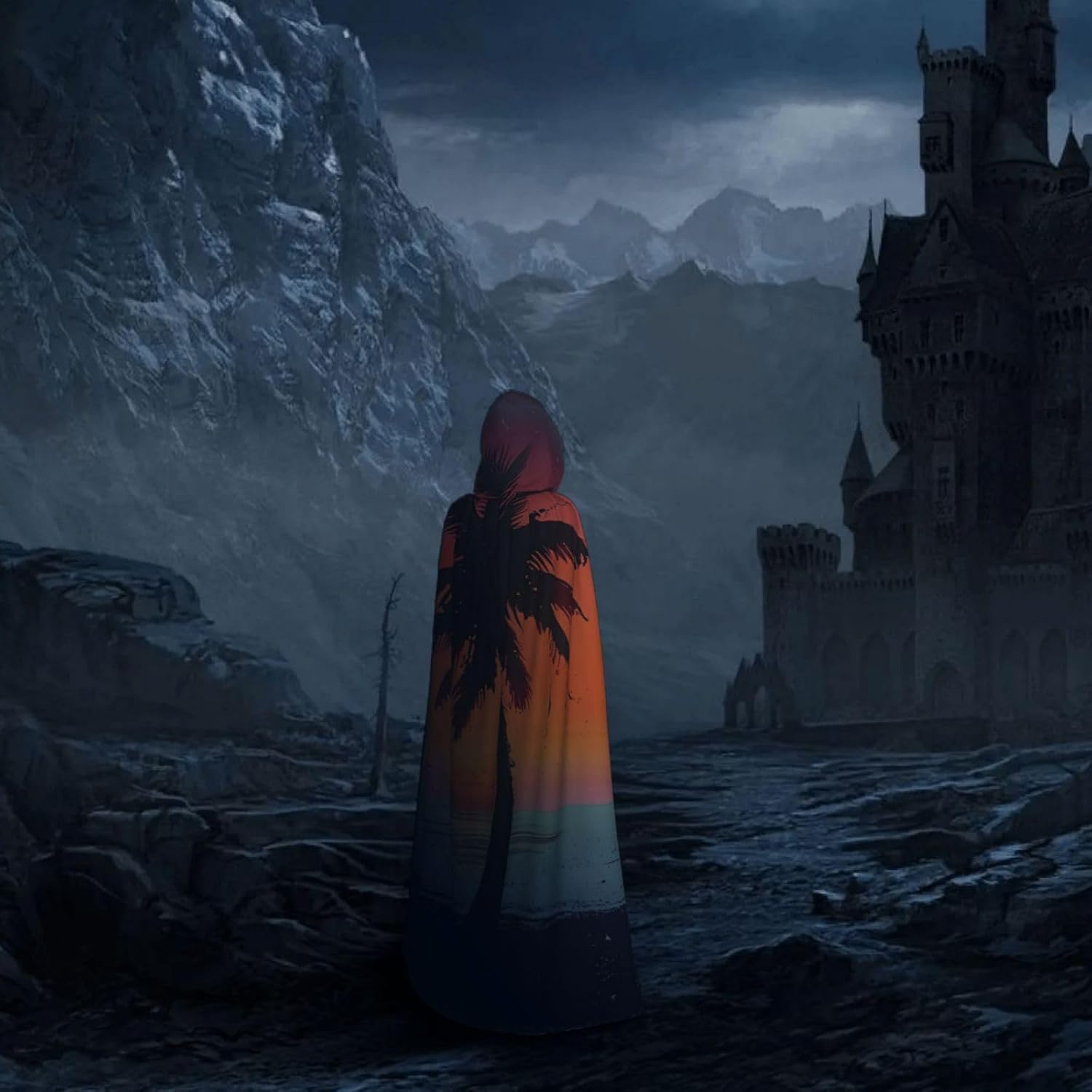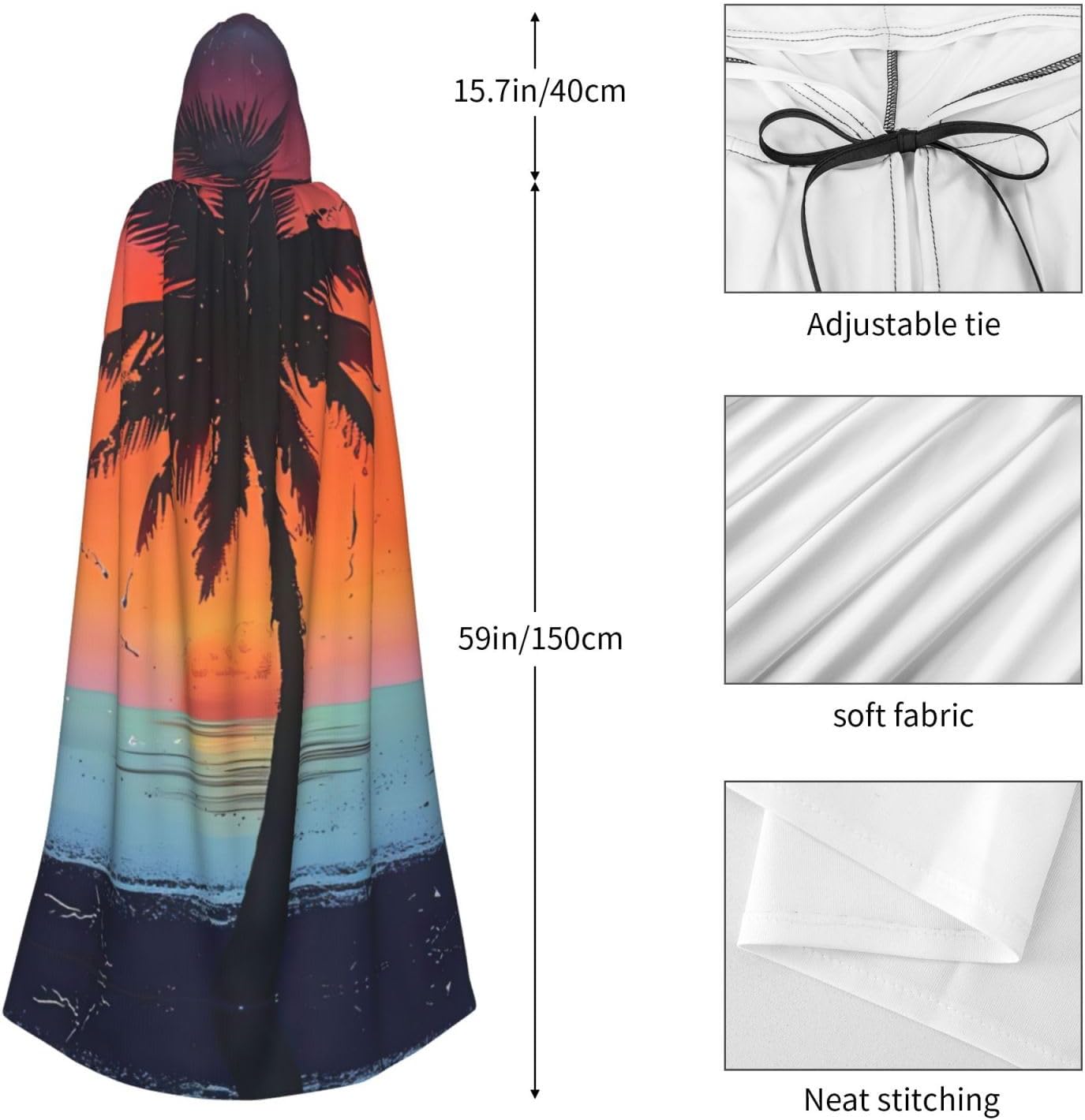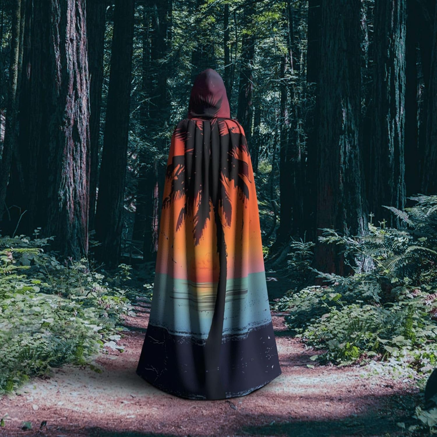 Mantello con cappuccio unisex con stampa tropicale del tramonto per adulti Halloween a lunghezza intera mantello da uomo con cappuccio costume
