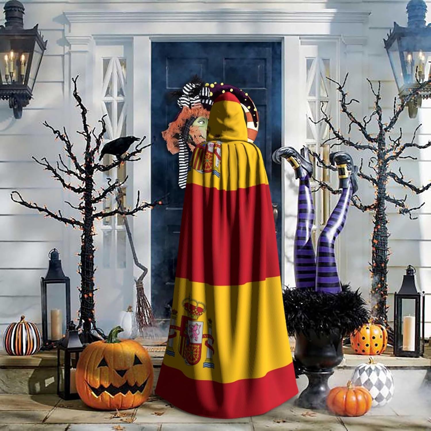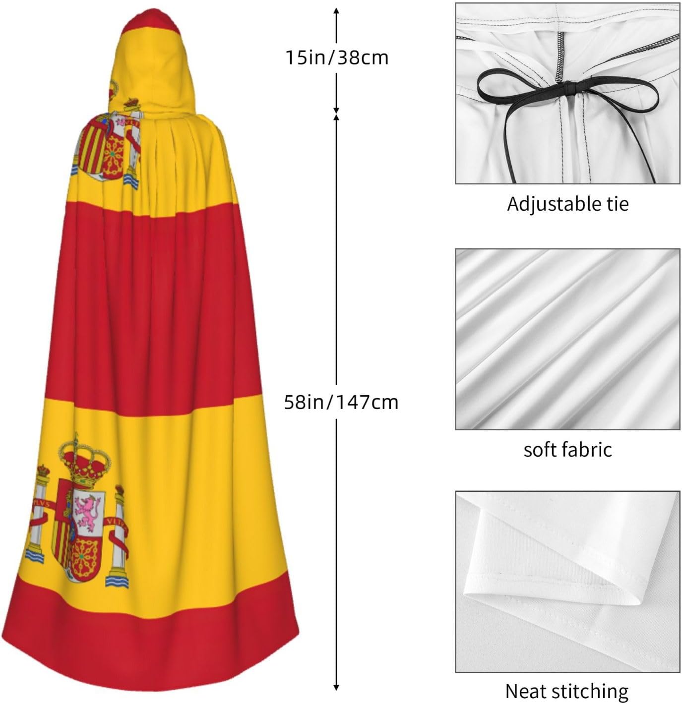 Realizzato in poliestere, questo mantello con stampa bandiera spagnola con cappuccio garantisce longevità e comfort. Le sue dimensioni ottimali assicurano una copertura completa per tutte le età, facendoti risaltare in qualsiasi evento. Che tu sia diretto per Halloween, un evento cosplay, un costume da palcoscenico, una festa in maschera, una festa a tema, un ballo o una convention di fumetti, questo mantello è una scelta ideale. Il suo design unico, completo di un grande cappuccio e cravatte collare. Inoltre, puoi dire addio ai metodi di pulizia complicati. Questo mantello con cappuccio con stampa bandiera spagnola è lavabile in lavatrice e a mano, offrendo una cura senza sforzo. Esci con stile e comfort con il nostro mantello con cappuccio, il tuo compagno per tutti gli eventi e le occasioni.