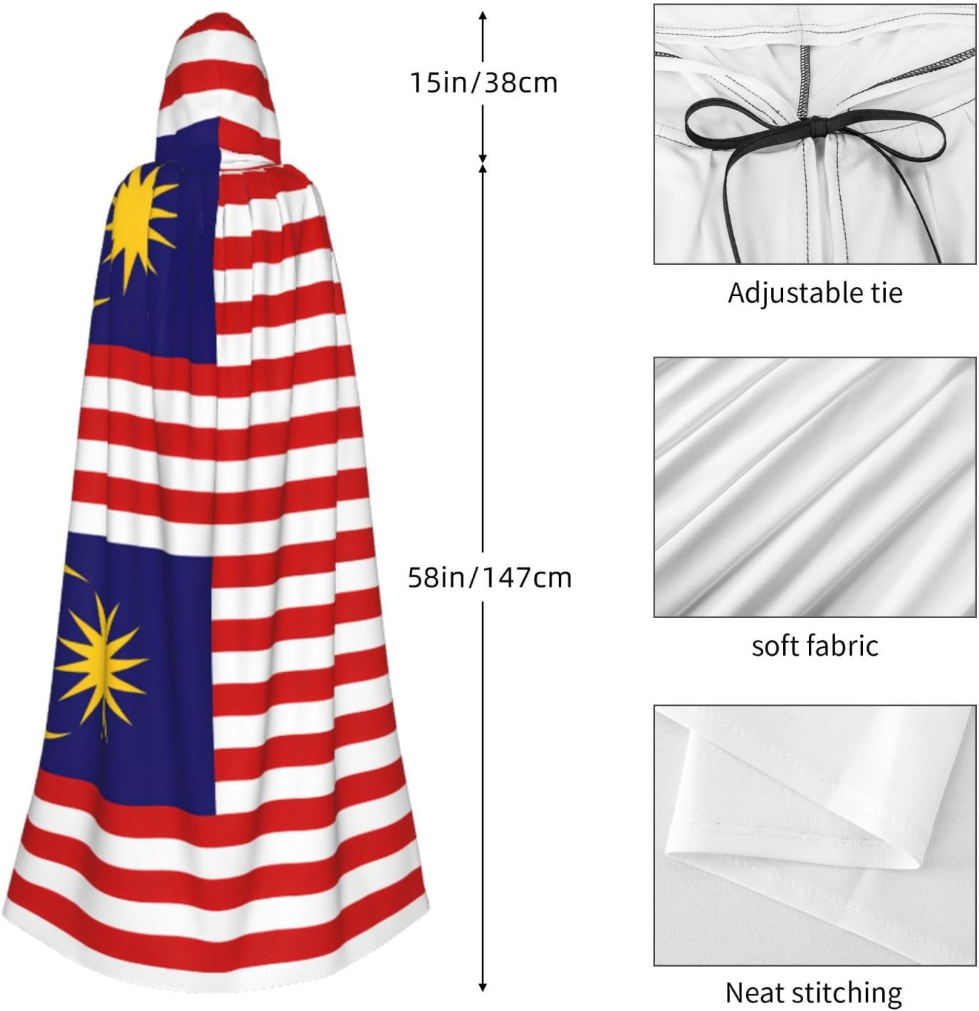 Realizzato in poliestere, questo mantello con stampa bandiera della Malesia con cappuccio garantisce longevità e comfort. Le sue dimensioni ottimali assicurano una copertura completa per tutte le età, facendoti risaltare in qualsiasi evento. Che tu sia diretto per Halloween, un evento cosplay, un costume da palcoscenico, una festa in maschera, una festa a tema, un ballo o una convention di fumetti, questo mantello è una scelta ideale. Il suo design unico, completo di un grande cappuccio e cravatte collare. Inoltre, puoi dire addio ai metodi di pulizia complicati. Questo mantello con cappuccio con stampa bandiera della Malesia è lavabile in lavatrice e a mano, offrendo una cura senza sforzo. Esci con stile e comfort con il nostro mantello con cappuccio, il tuo compagno per tutti gli eventi e le occasioni.