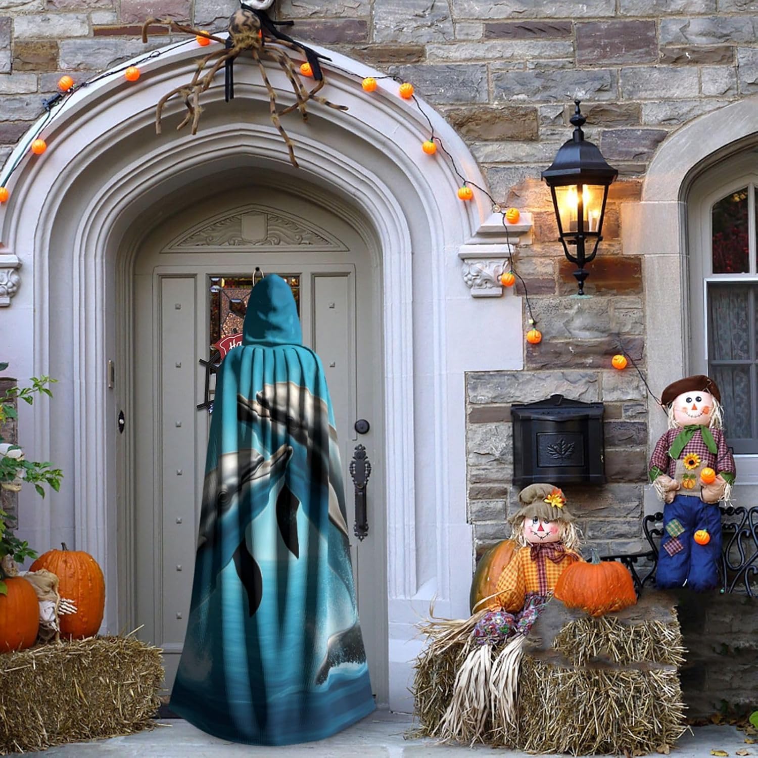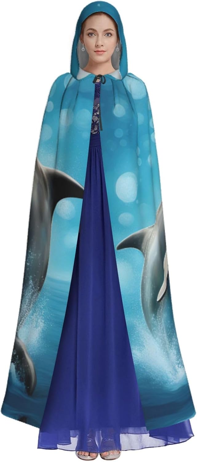 Mantello lungo con cappuccio, con stampa di delfini innamorati, per adulti, per Natale, Halloween, feste a tema, giochi di ruolo