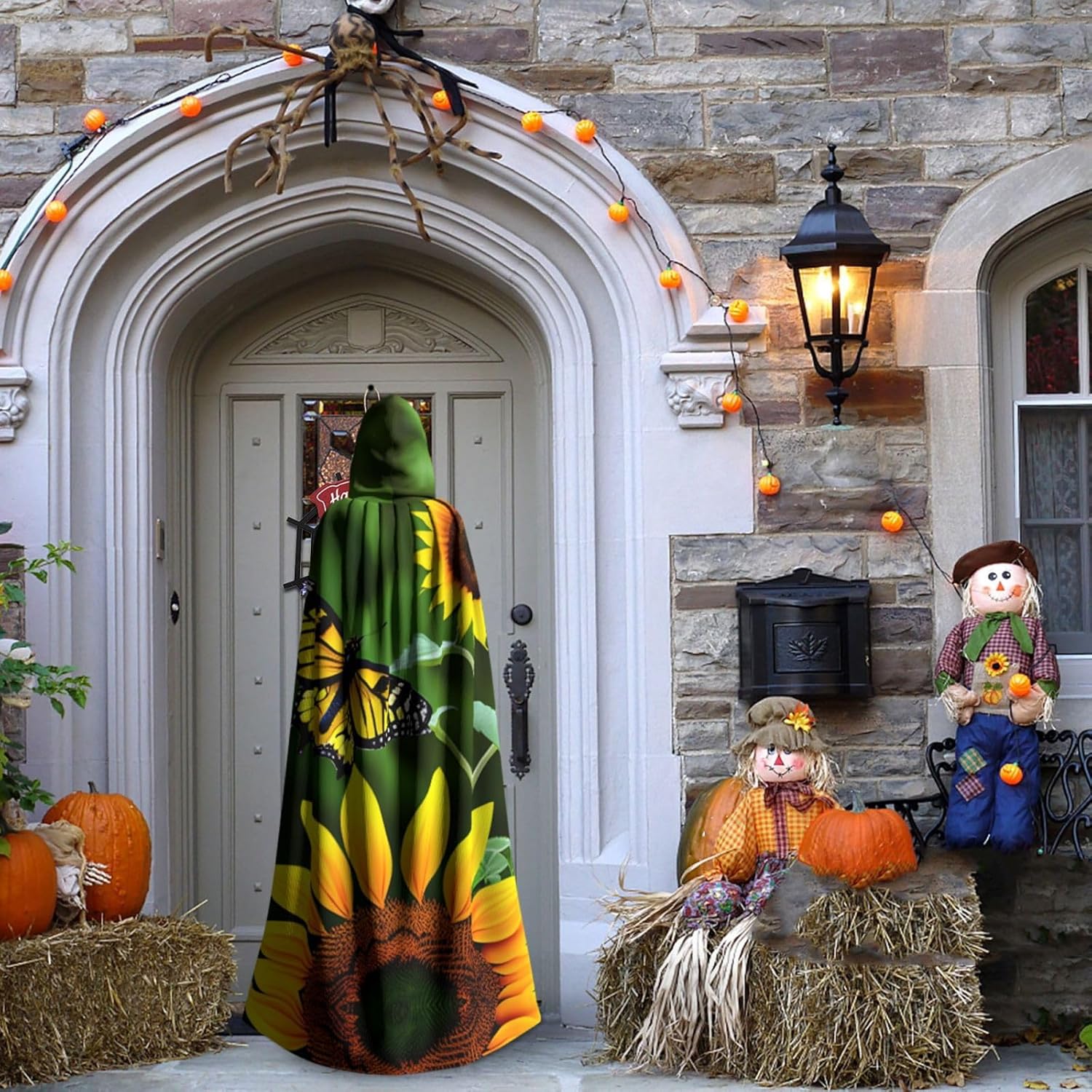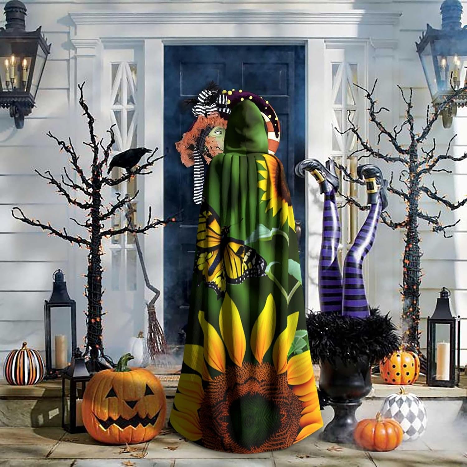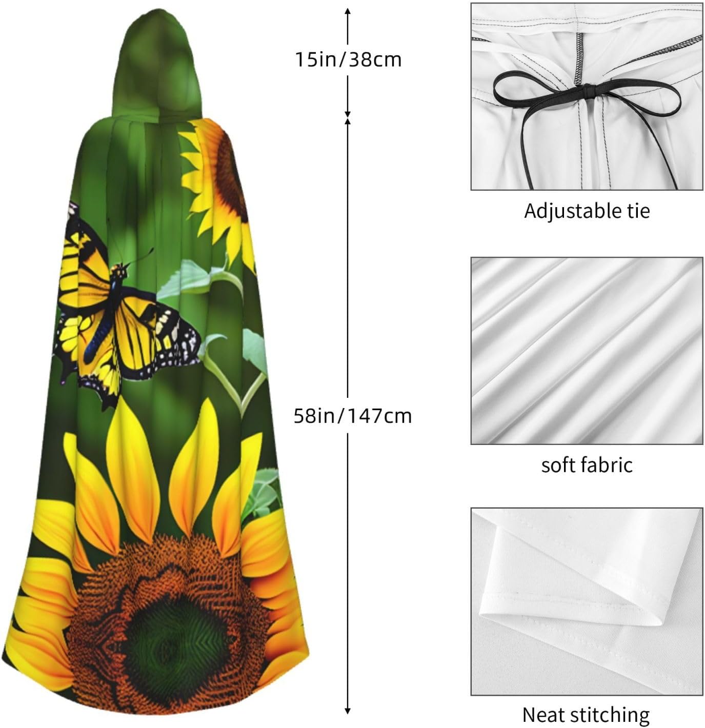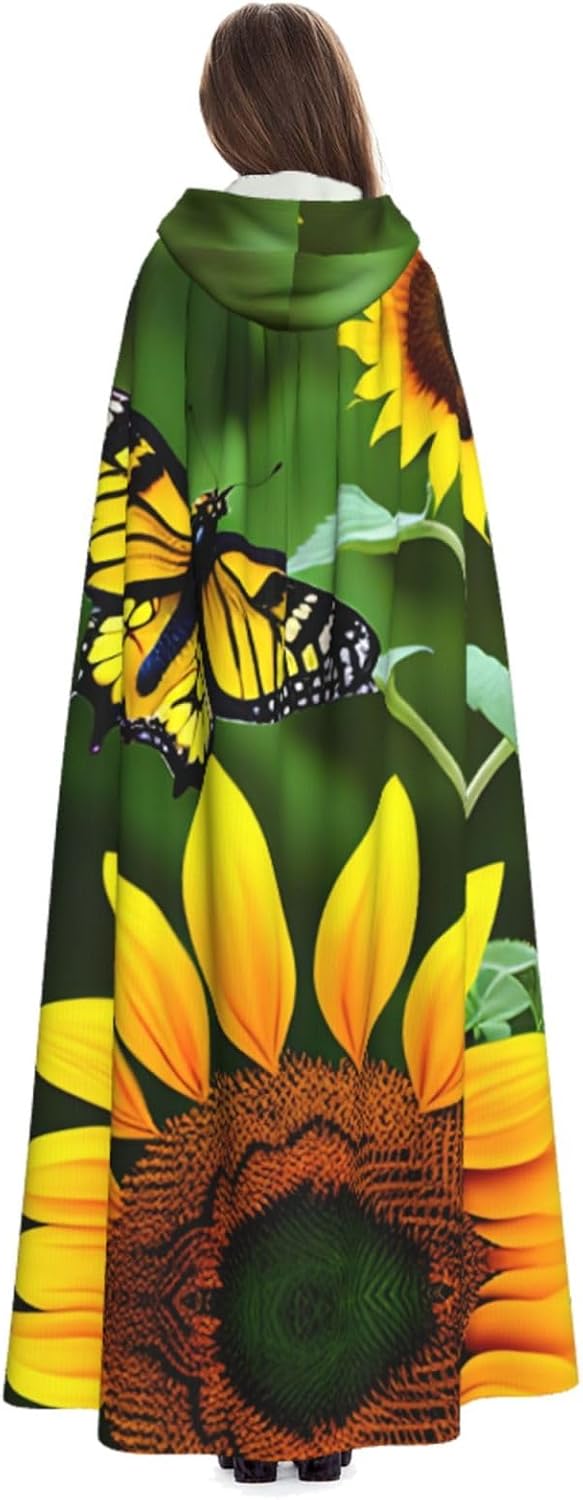 Mantello lungo con cappuccio con stampa di girasole e farfalla per adulti, per Natale, Halloween, feste a tema, giochi di ruolo