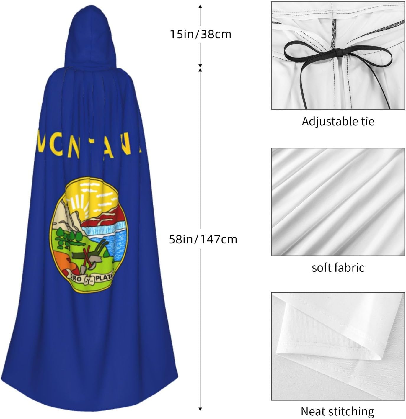 Realizzato in poliestere, questo mantello con stampa bandiera del Montana con cappuccio garantisce longevità e comfort. Le sue dimensioni ottimali assicurano una copertura completa per tutte le età, facendoti risaltare in qualsiasi evento. Che tu sia diretto per Halloween, un evento cosplay, un costume da palcoscenico, una festa in maschera, una festa a tema, un ballo o una convention di fumetti, questo mantello è una scelta ideale. Il suo design unico, completo di un grande cappuccio e cravatte collare. Inoltre, puoi dire addio ai metodi di pulizia complicati. Questo mantello con cappuccio con stampa bandiera del Montana è lavabile in lavatrice e a mano, offrendo una cura senza sforzo. Esci con stile e comfort con il nostro mantello con cappuccio, il tuo compagno per tutti gli eventi e le occasioni.