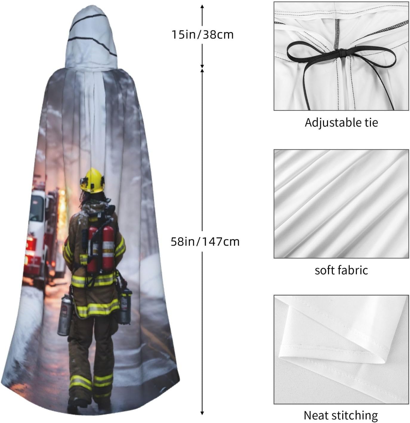 Realizzato in poliestere, questo mantello da pompiere con stampa fiamma e cappuccio garantisce longevità e comfort. Le sue dimensioni ottimali assicurano una copertura completa per tutte le età, facendoti risaltare in qualsiasi evento. Che tu sia diretto per Halloween, un evento cosplay, un costume da palcoscenico, una festa in maschera, una festa a tema, un ballo o una convention di fumetti, questo mantello è una scelta ideale. Il suo design unico, completo di un grande cappuccio e cravatte collare. Inoltre, puoi dire addio ai metodi di pulizia complicati. Questo mantello con cappuccio con stampa fiamma pompiere è lavabile in lavatrice e a mano, offrendo una cura senza sforzo. Esci con stile e comfort con il nostro mantello con cappuccio, il tuo compagno per tutti gli eventi e le occasioni.