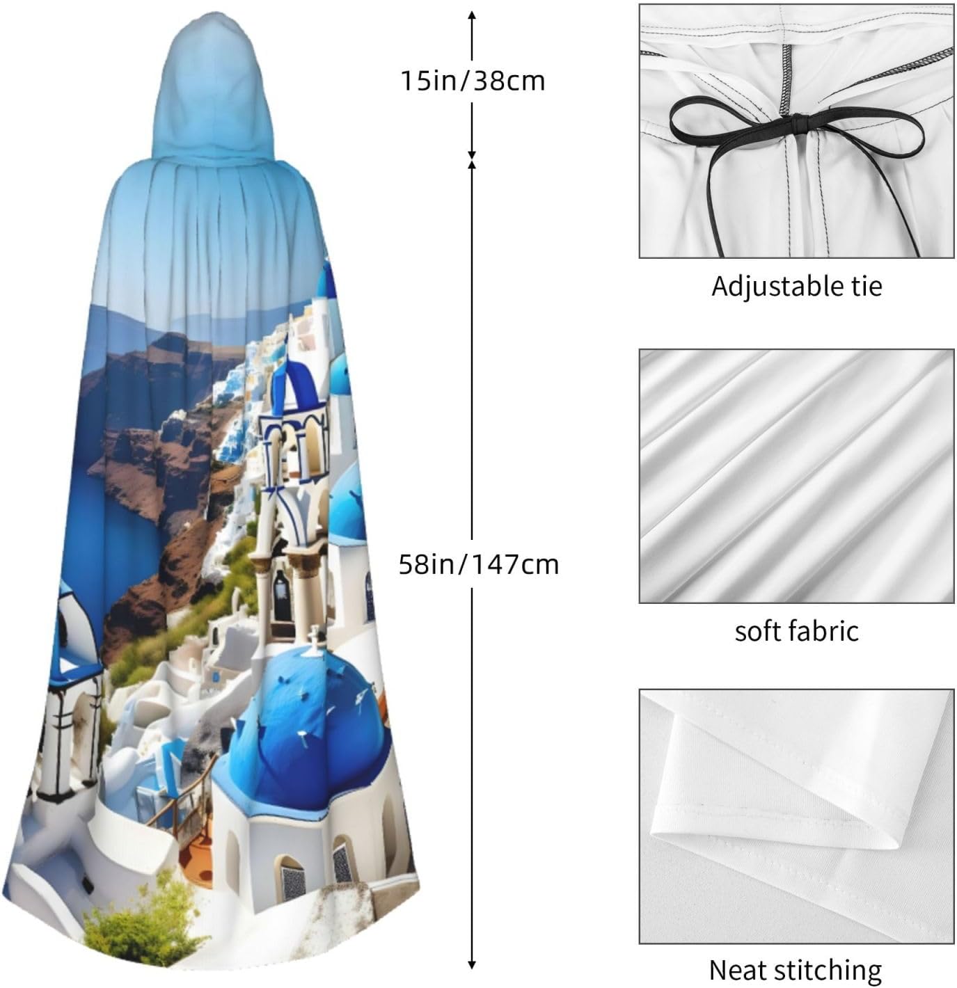 Realizzato in poliestere, questo mantello con stampa a vista sul mare dell'isola greca con cappuccio garantisce longevità e comfort. Le sue dimensioni ottimali assicurano una copertura completa per tutte le età, facendoti risaltare in qualsiasi evento. Che tu sia diretto per Halloween, un evento cosplay, un costume da palcoscenico, una festa in maschera, una festa a tema, un ballo o una convention di fumetti, questo mantello è una scelta ideale. Il suo design unico, completo di un grande cappuccio e cravatte collare. Inoltre, puoi dire addio ai metodi di pulizia complicati. Questo mantello con cappuccio con stampa sull'isola greca vista mare è lavabile in lavatrice e a mano, offrendo una cura senza sforzo. Esci con stile e comfort con il nostro mantello con cappuccio, il tuo compagno per tutti gli eventi e le occasioni.