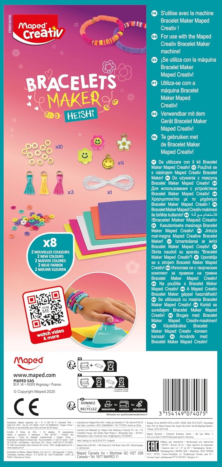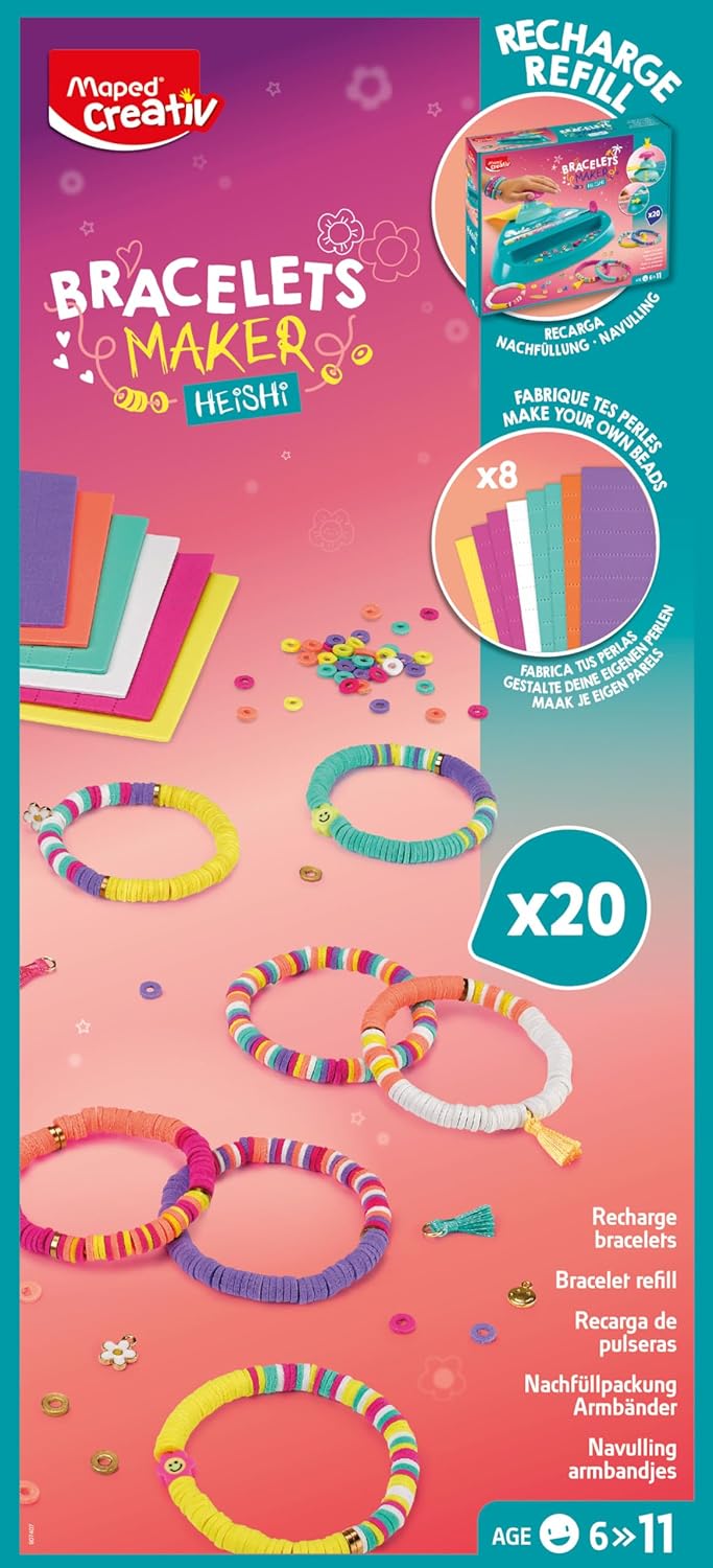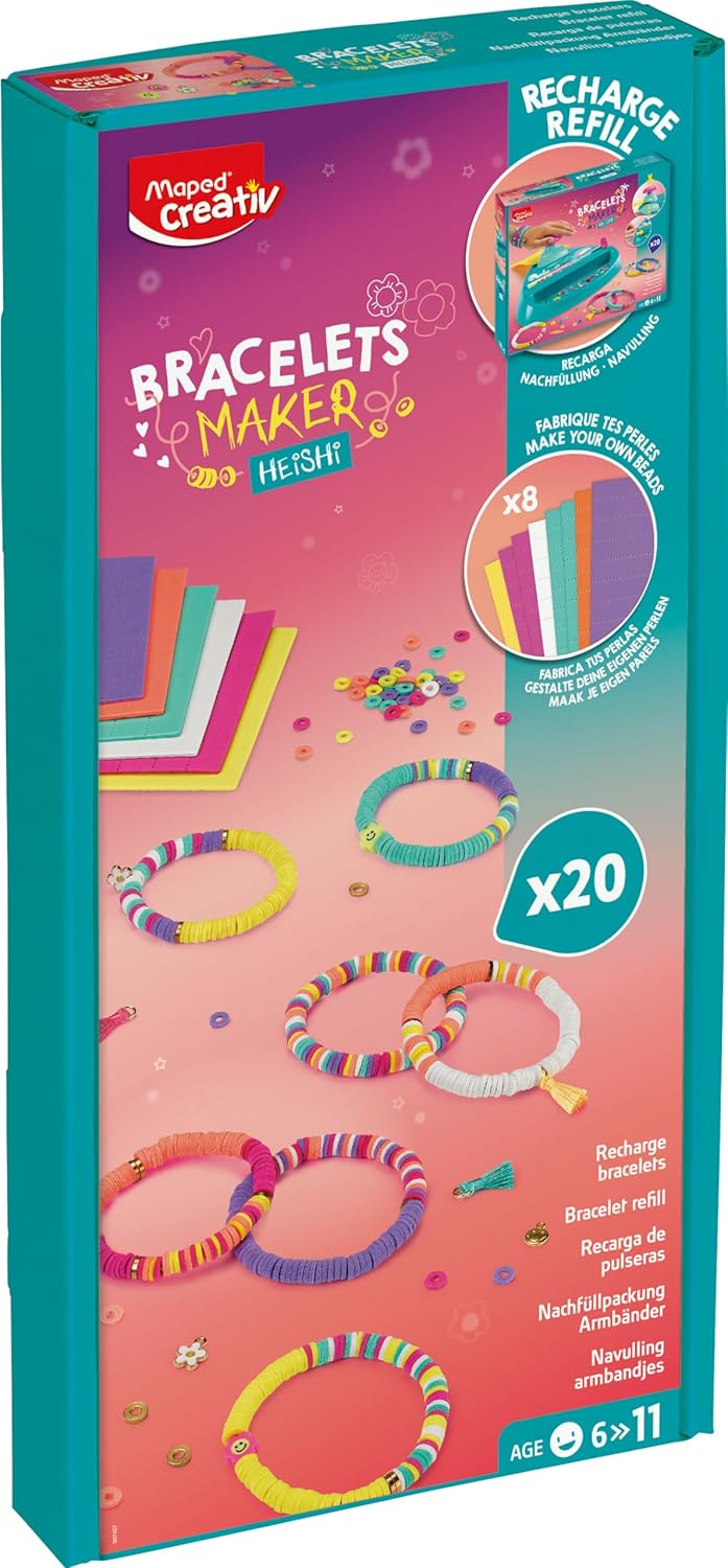 Nuove possibilità creative: grazie a 8 fogli EVA in schiuma e 2 nuovi colori (viola e arancione), i bambini possono creare perline Heishi ancora più diverse. Questo kit include anche 4 ciondoli, 10 divisori, un filo elastico e 3 pompon per personalizzare ogni braccialetto. FACILE DA USARE: Questo kit è progettato per essere utilizzato con la macchina per perline Bracciale Heishi Maped Creativ. I bambini tagliano i fogli EVA in schiuma per realizzare perline e poi assemblano i loro braccialetti con i nuovi elementi inclusi grazie alla stazione Bracciale Maker. TUTTO INCLUSO: La ricarica contiene tutto il necessario per creare 20 braccialetti con la macchina bracciale Maker Heishi: 8 fogli EVA (2 nuovi colori), 4 ciondoli, 10 divisori, un filo elastico e 3 pompon. Utilizzare questi elementi con la macchina per perline Heishi per creare ancora più originali e colorate. Liberate la vostra creatività: Maped Creativ incoraggia i bambini a esprimere il loro stile unico creando i propri gioielli. Con questo kit di ricarica, la creazione di braccialetti diventa un'attività ancora più divertente e diversificata. MAPED CREATIV, KIT ATTIVITÀ INGEGNATIVO: Maped Creativ offre una collezione di attività manuali innovative, ultra divertenti e stimolanti, per realizzare creazioni uniche, e giocare con i suoi risultati.