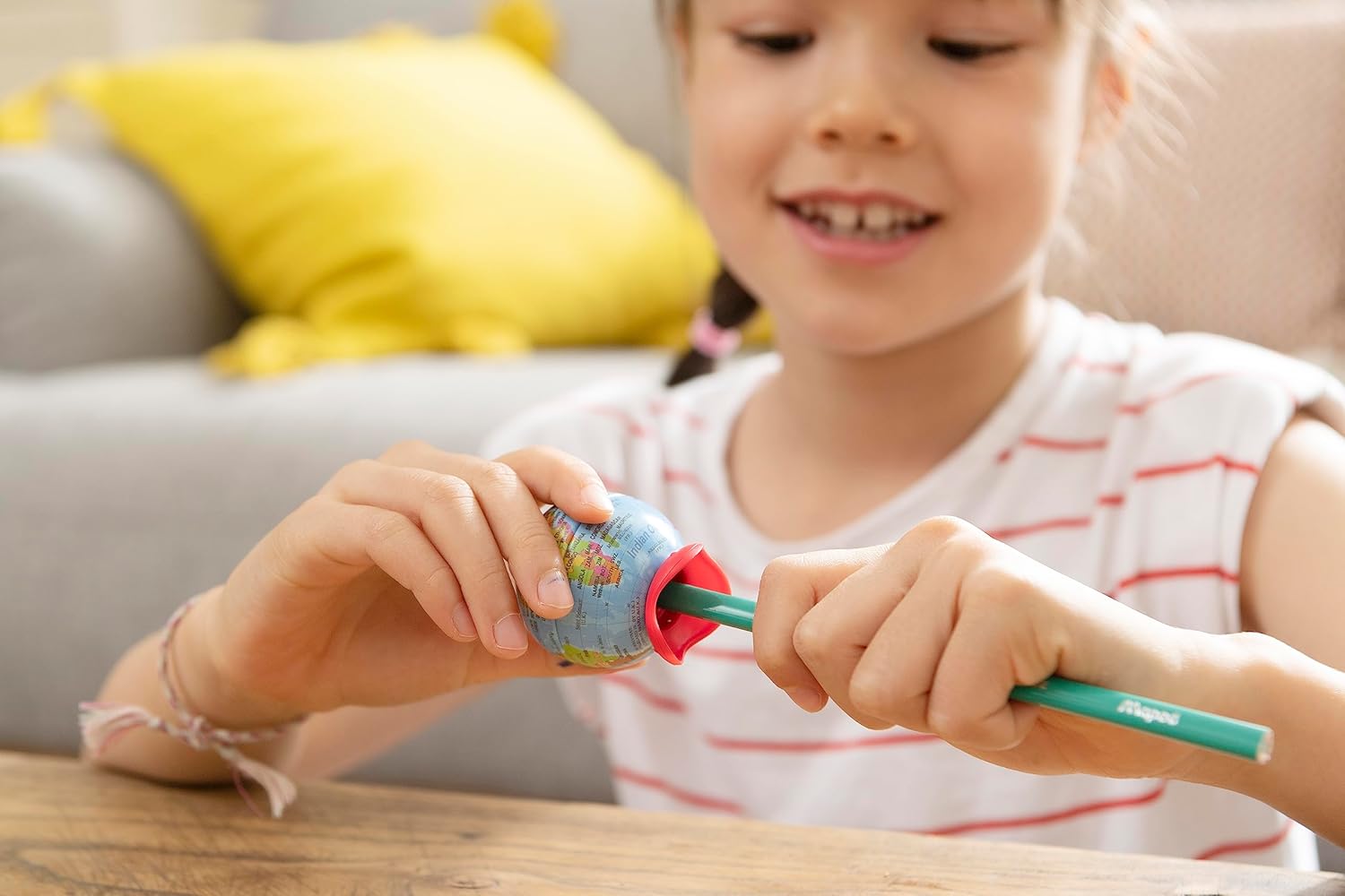 IL MONDO A PORTATA DI MANO: Il temperamatite Globe presenta un arredamento giocoso, per imparare divertendosi. Con la sua riserva a forma di globo terrestre, offre ai bambini di imparare o rivedere la geografia mentre si tagliano matite colorate o da carta. Un classico giocoso e senza tempo per imparare il nome e la posizione dei continenti e dei paesi durante una sessione di colorazione o geometria. TAGLIA -CRAYON CON SERBATOI: questo temperamatite Maped è dotato di una riserva in metallo per raccogliere i trucioli, consentendo di tagliare le matite in tutta pulizia e mantenere un astuccio immacolato. Per svuotarlo, è sufficiente rimuovere il plinto e il gioco è fatto. ERGONOMICA: la forma rotonda del temperamatite Globe facilita la presa dello strumento. Le sue dimensioni ridotte sono perfettamente adatte alle mani degli scolari e si collocano facilmente in un astuccio scolastico. Ha un foro adatto per matite di grafite e colori di diametro standard (8 mm) e la lama in acciaio inossidabile offre dimensioni facili e veloci. Gomma efficace: le gomme Epure sono molto efficaci per uno scrub ottimale dei tuoi tratti e disegni a matita. GOMMA ERGONOMICA: gomme bianche a forma di ciottoli per una migliore tenuta in mano. Sono perfetti per la scuola, la casa o l'ufficio.