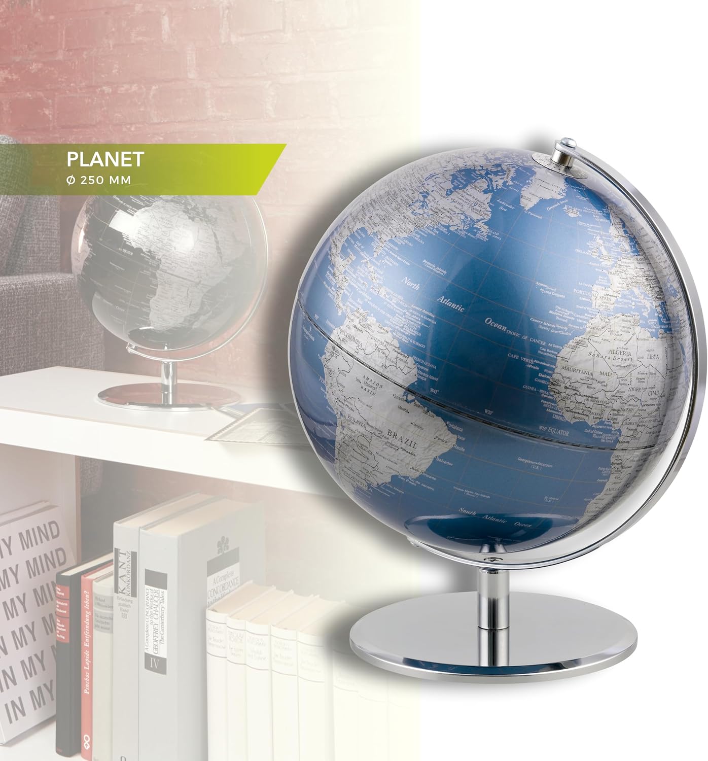 Mappamondo TROIKA ORIGINALE con diametro di 25 cm. Lavorazione di alta qualità: moderno mappamondo da tavolo con un'altezza totale di 30 cm, girevole su una stabile base in metallo cromato. Design impressionante e finiture di alta qualità. Foderato con feltro per proteggere le superfici dei mobili. Mappamondo lucido bicolore PIANETA con facce di campagna argentate e mari blu metallizzato, etichettato in inglese, con continenti, oceani, paesi, zone geografiche e città importanti. Funzionale e decorativo: design elegante degli interni, sia sulla scrivania, sullo scaffale o sulla credenza. Valore aggiunto: con i suoi dettagli realistici e la lavorazione di alta qualità, il mappamondo non è solo un elemento decorativo, ma anche uno strumento educativo per menti curiose di tutte le età. Dimensioni complessive: 250x250x300 mm, 1073 g - confezionato in confezione regalo di alta qualità, ideale da regalare al partner, sorella, padre, madre, partner. COLLEZIONE DESIGN GLOBE DI TROIKA. DARE UNA CASA AL MONDO. La collezione Globus offre un'affascinante selezione di oggetti di design che aggiungeranno un tocco unico ed elegante alla tua casa o alla tua scrivania. VIAGGIO INTELLIGENTE Fedeli al nostro motto "organizzato in movimento", offriamo accessori da viaggio più grandi e più piccoli. Dagli adattatori alle scatole per cavi, dagli zaini alle custodie per passaporti, dalle custodie per bagaglio a mano alle custodie per documenti 🎁 GIVING JOY - TROIKA è sinonimo di trasformare le tendenze attuali in prodotti ben pensati, sempre con un occhio al design armonioso e alla creatività. Tutti conoscono la questione del regalo giusto, ma non è mai facile trovare quello giusto.