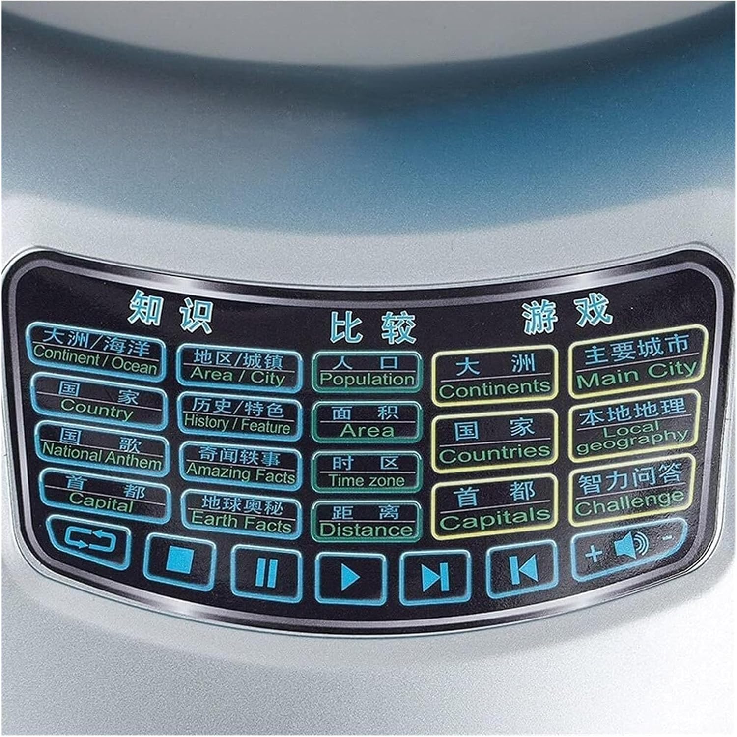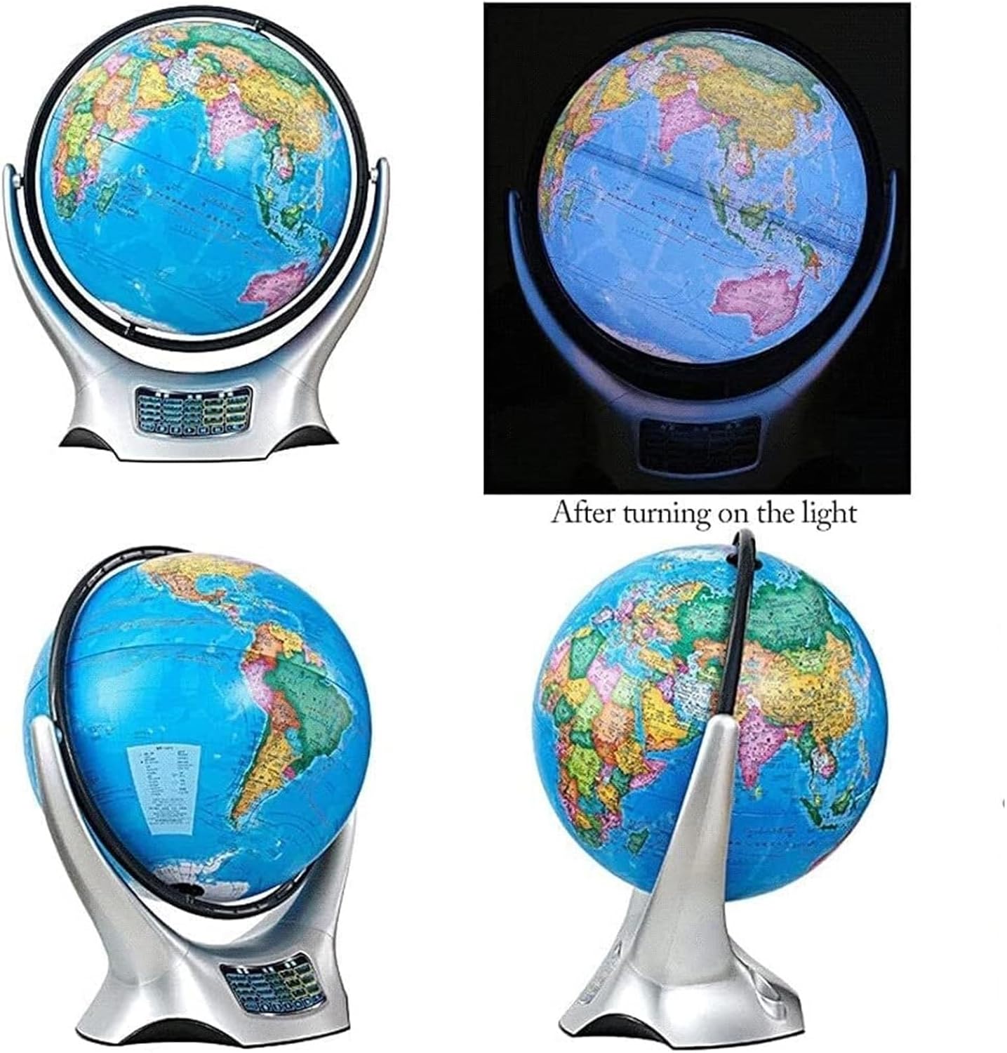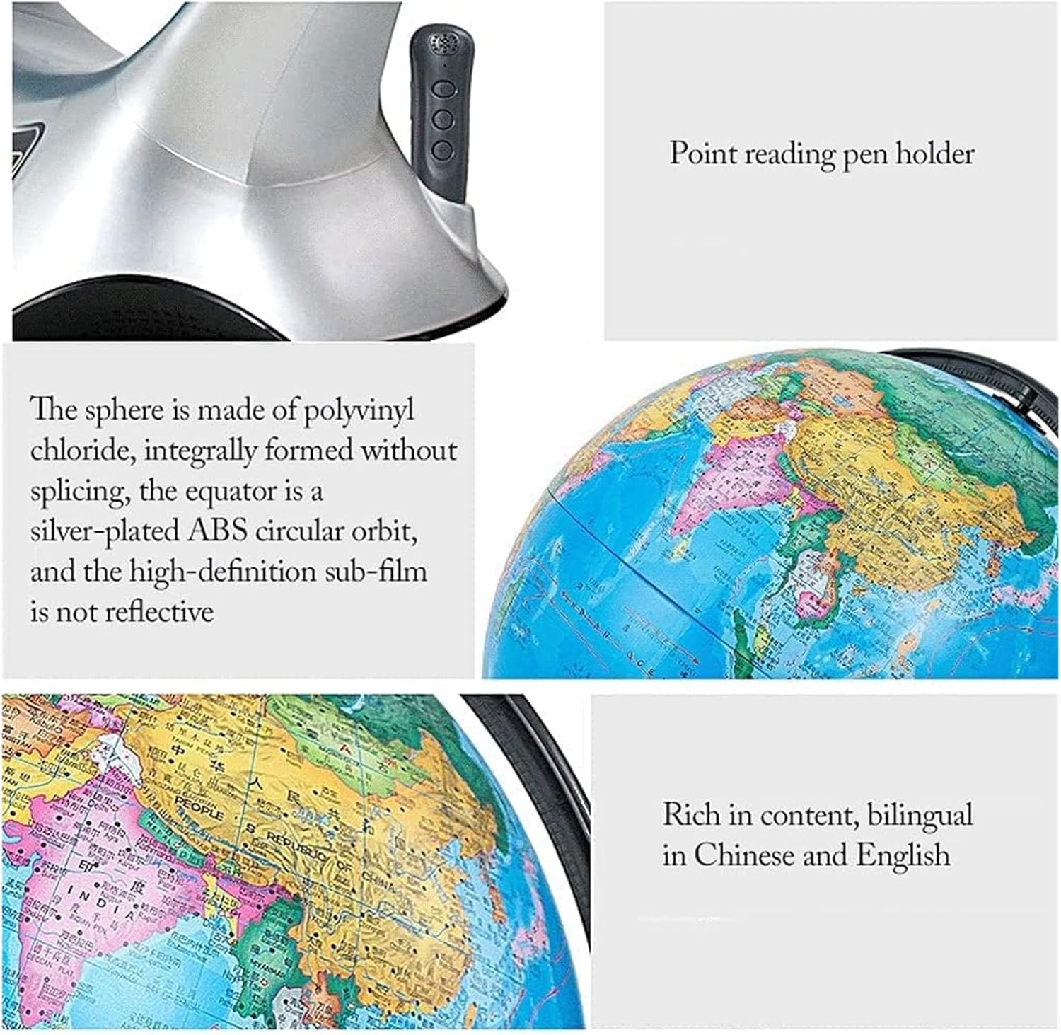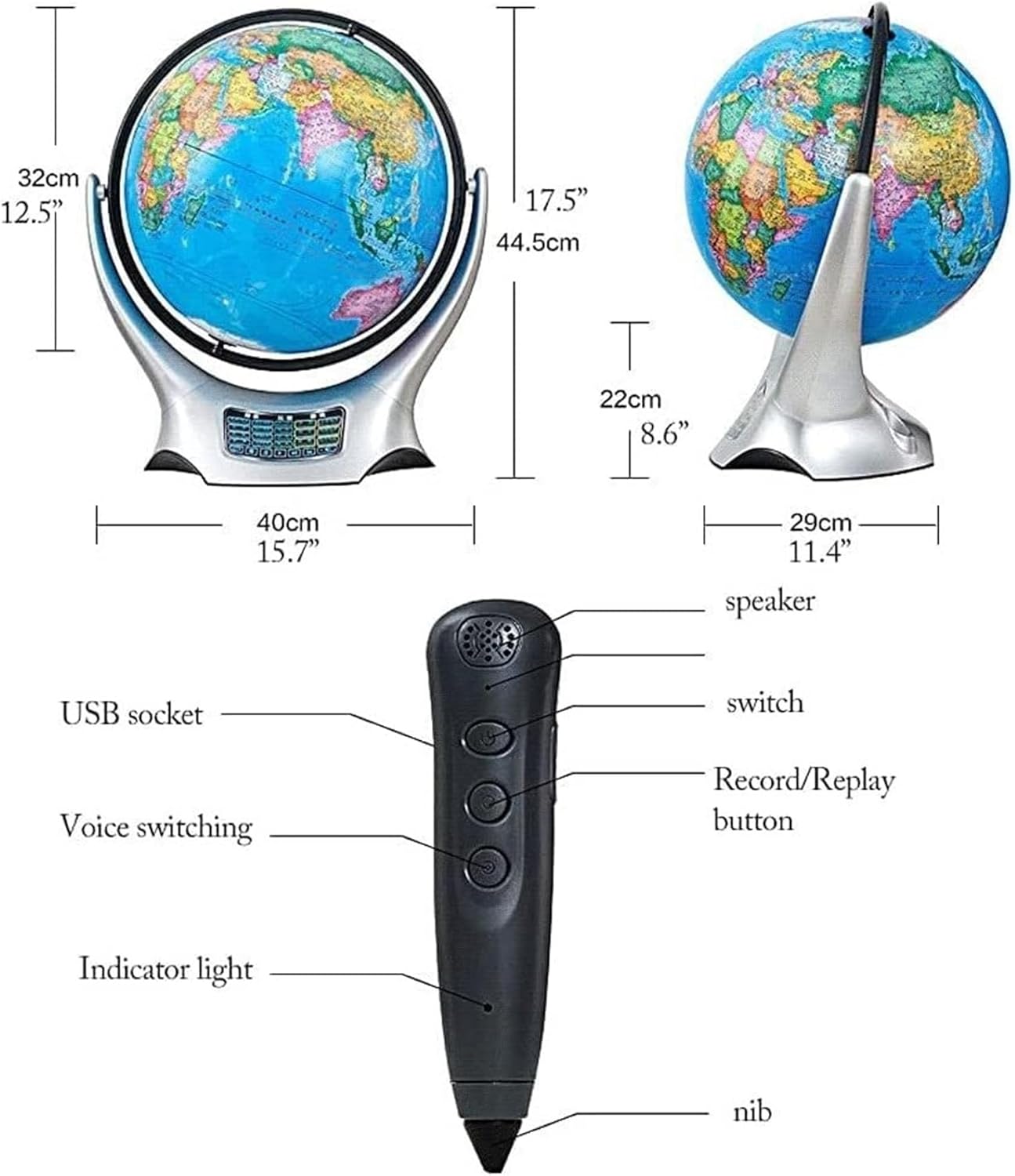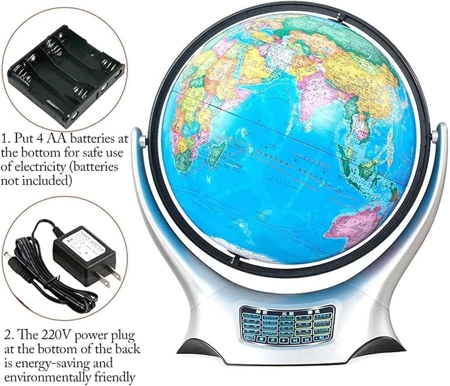 I globi sono eccellenti strumenti educativi e il modo perfetto per ispirare l'apprendimento e l'esplorazione della geografia mondiale. I globi forniscono un modo divertente per introdurre la geografia. Costituiscono ottimi strumenti di riferimento in classe. La sottomembrana formata dal corpo è una sfera non riflettente. La sfera è realizzata in polietilene ed è stampata in un unico pezzo e non richiede giunzioni. L'equatore è una pista circolare in ABS argentato. La pellicola secondaria ad alta definizione non è riflettente. Quando non in uso, puoi mettere la penna da lettura sullo scaffale, che può proteggere efficacemente la penna da lettura dalla perdita o dal danneggiamento; è realizzato con chip di alta qualità, con un bell'aspetto e molteplici funzioni Penna vocale, una è for la lettura vocale e l'altra è MP3, che può riprodurre musica e ascoltarla. Con la funzione lampada da tavolo, 4 batterie AA sono posizionate nella parte inferiore, risparmiando energia ed elettricità e l'utilizzo delle batterie è più sicuro (batterie non incluse)