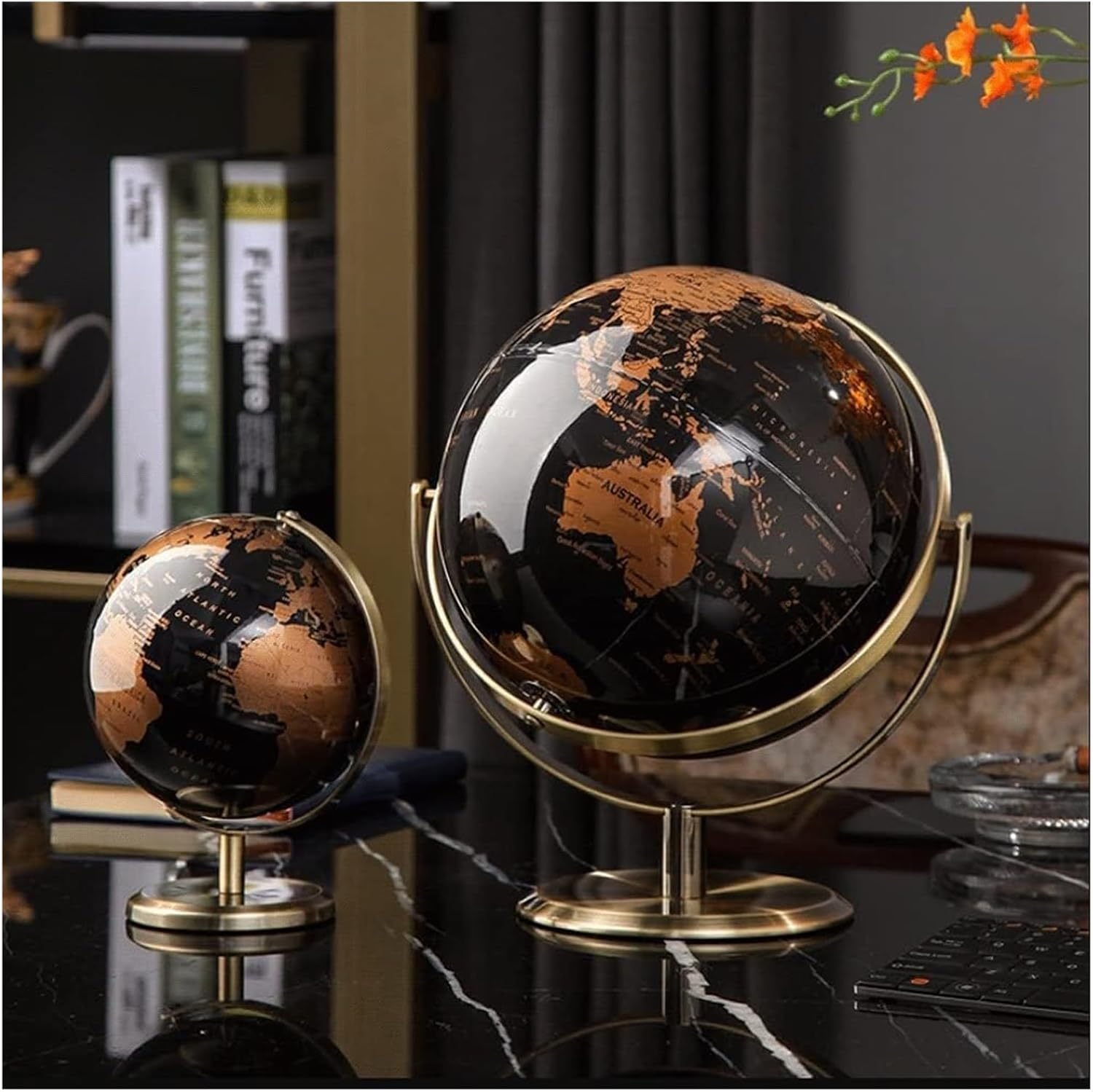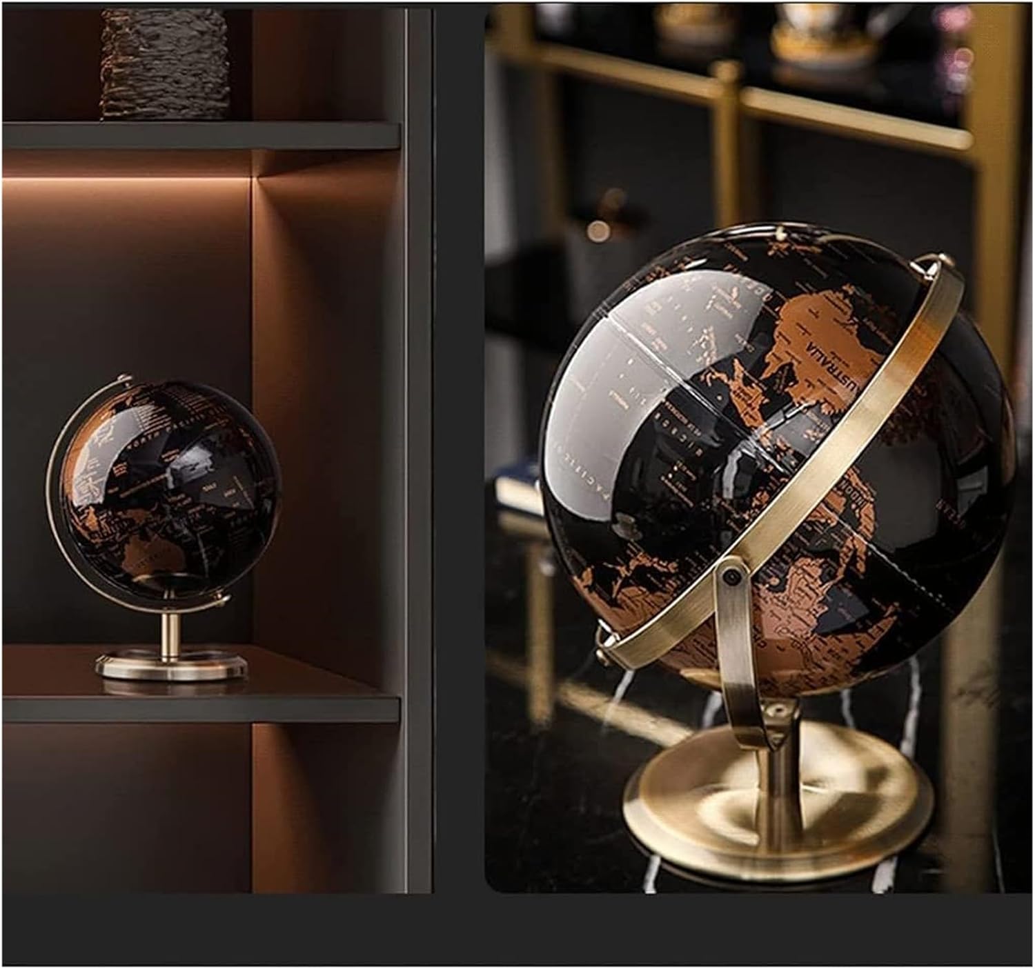 Migliora la raffinatezza e la curiosità in qualsiasi casa o ufficio con i nostri globi da scrivania senza tempo. Il nostro globo presenta una superficie appositamente trattata che è impermeabile e resistente, garantendo una lunga durata. Costruito con plastica ingegneristica di alta qualità e un telaio a sfera in metallo ramato. Goditi la comodità di un grande globo con rotazione a doppia latitudine e un piccolo globo con rotazione a 360°. Prova la stampa a colori ad alta definizione da macchine tedesche che forniscono colori chiari e duraturi.