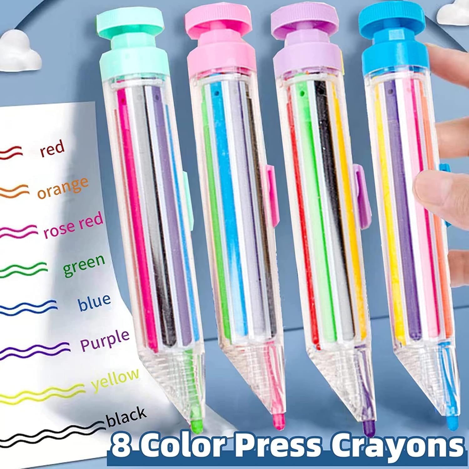 [8 In 1 Multicolored Crayon] Each crayon contains 8 colors, all of which are beautiful and suitable for your basic use, enough color choice to meet your different painting creation need anytime and anywhere. [Convenient To Use] Environmentally friendly crayon, the refill can be replaced at will, you can quickly switch between different colors with a light press, fun and practical all in one, not easy to dirty your hands, children can use it without worry. [Practical Drawing/Writing Colored Crayons] Featuring a sturdy cap and smooth ink, these crayons combine a cute look with practicality to help you write or draw with them conveniently. [Handy Crayons] These crayons are easy to carry, colorful inks will stimulate your creativity and imagination and increase your interest in learning. Compared to a large box of crayons, this one is lighter and more portable, so it's easy to carry around for outdoor sketching or school. [Perfect Gift] This is a cute party favor gift for kids in the themed birthday party, and they will like these crayons for toddlers' party favor supplies.