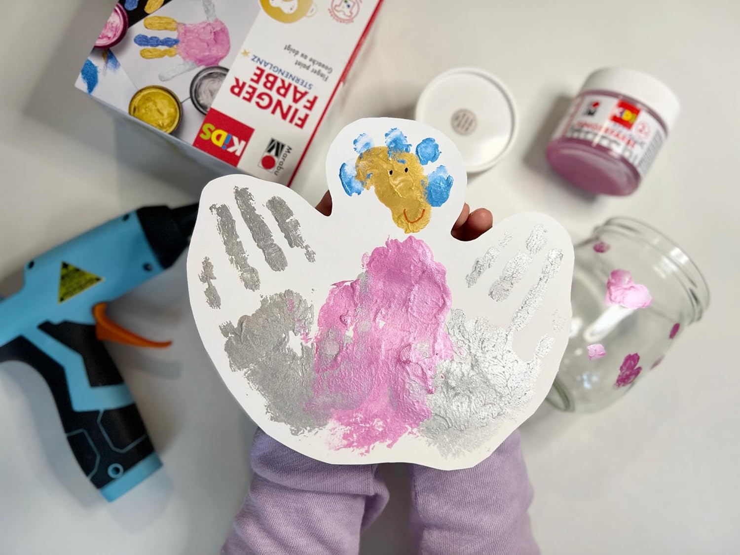 Set di colori a dita in rosa, blu, oro e argento Senza parabeni, vegan, senza lattosio e senza glutine Facile da rimuovere da tutte le superfici lisce e lavabile a partire da 30 °C La vernice non cola, copre molto bene e si asciuga rapidamente