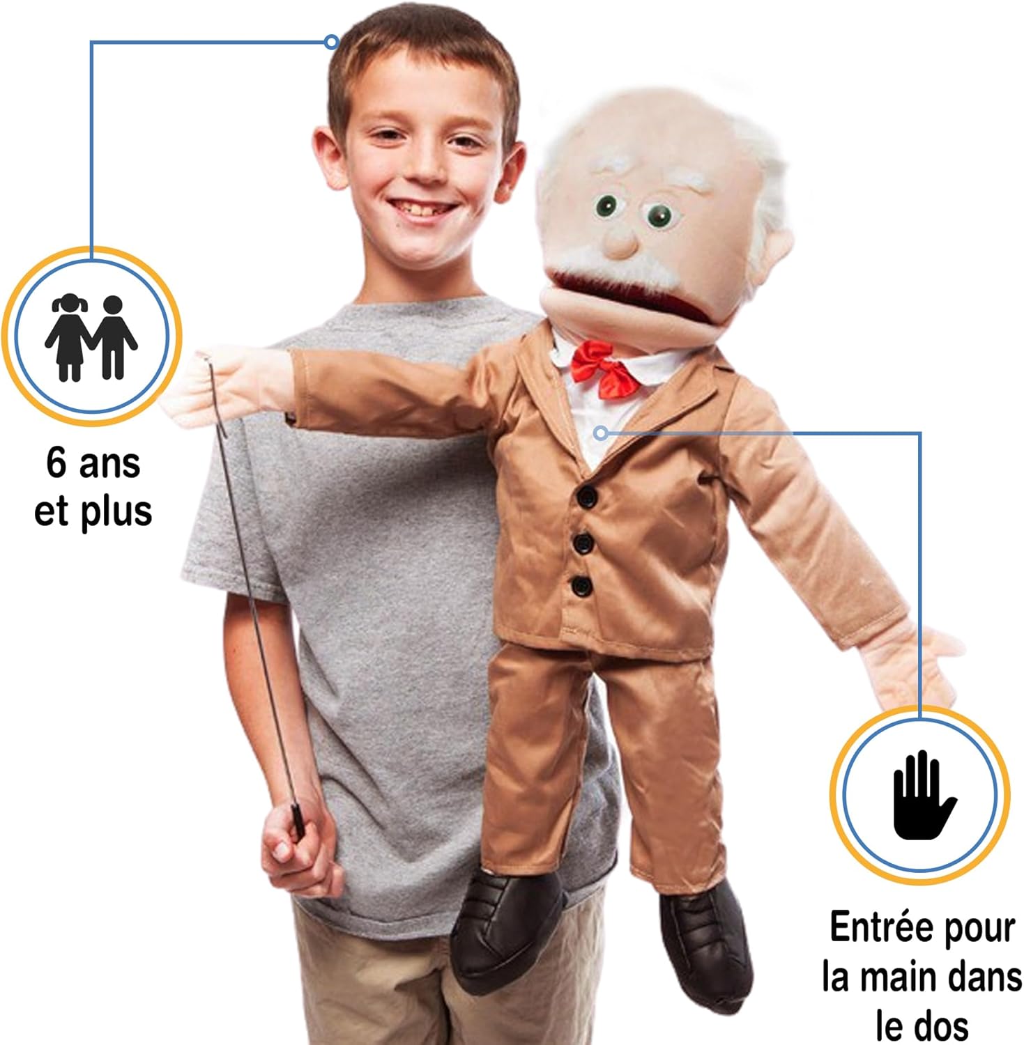 Burattino ventriloquo di alta qualità realizzato da Silly Pups. Bocca facile da muovere. Ingresso manuale dal retro del burattino. Include 1 asta di controllo del braccio che può essere agganciata a entrambe le mani per il movimento. Altezza: circa 65 cm. Peso leggero: ca. 500 g. Il pupazzo può essere vestito con abiti per bambini dai 18 mesi in su.