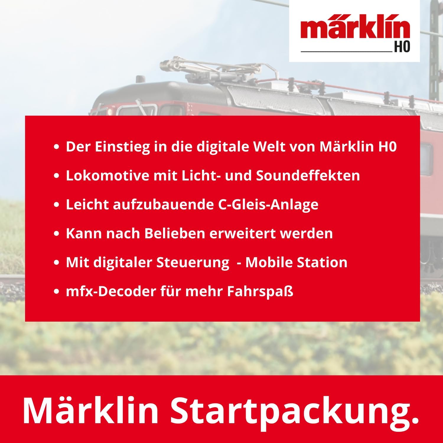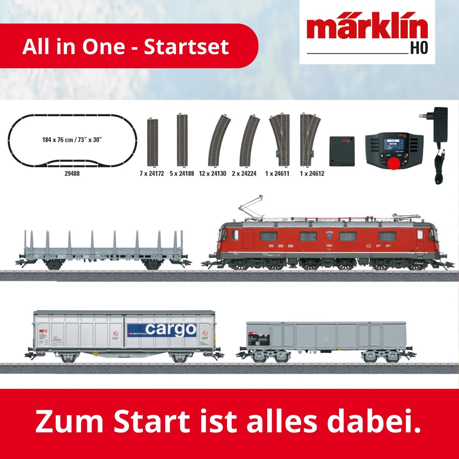 Facile da montare: kit di avvio per entrare nel mondo del modellismo digitale con molte funzioni di rumore. Elementi digitali: questo set per modellismo ferroviario H0 con decoder digitale mfx garantisce un divertimento eccezionale. Segnale di picco a tre luci che cambia in base alla direzione di marcia e 1 luce posteriore bianca (cambio luce svizzera) commutabile digitalmente. Segnale di picco sul lato locomotiva 2 e 1 disattivabile digitalmente, funzione luce doppia A. Illuminazione commutabile a 2 luci posteriori rosse. Abbaglianti, illuminazione della cabina e illuminazione della sala macchine commutabili digitalmente. Manipolazione autoesplicativa: modellino ferroviario C su binari da costruzione. Il treno è stato sviluppato sul modello di un treno merci svizzero. Contenuto Modello: Locomotiva elettrica pesante Re 6/6 come Re 620 delle Ferrovie Federali Svizzere (SBB), utilizzata per il trasporto merci SBB Cargo e tre diversi vagoni merci. Binari e controllo: 12 binari curvi 24130, 5 binari dritti 24188, 7 binari dritti 24172, 2 binari curvi 24224 e 1 coppia di deviatori 24611 e 24612. Scatola di collegamento binario, alimentatore di commutazione 230 V/36 VA e stazione mobile.