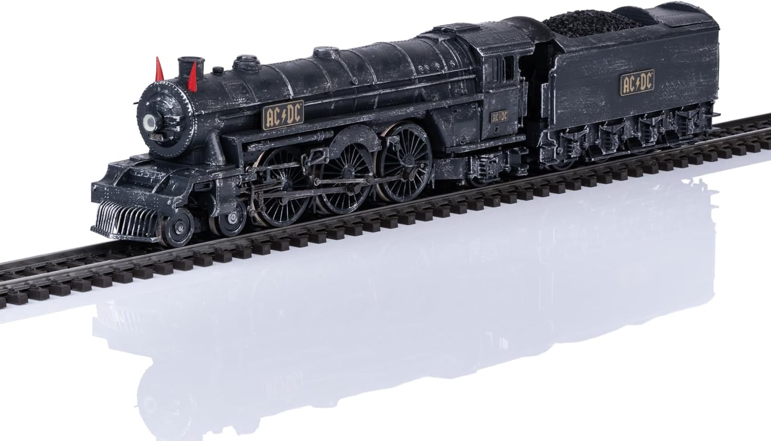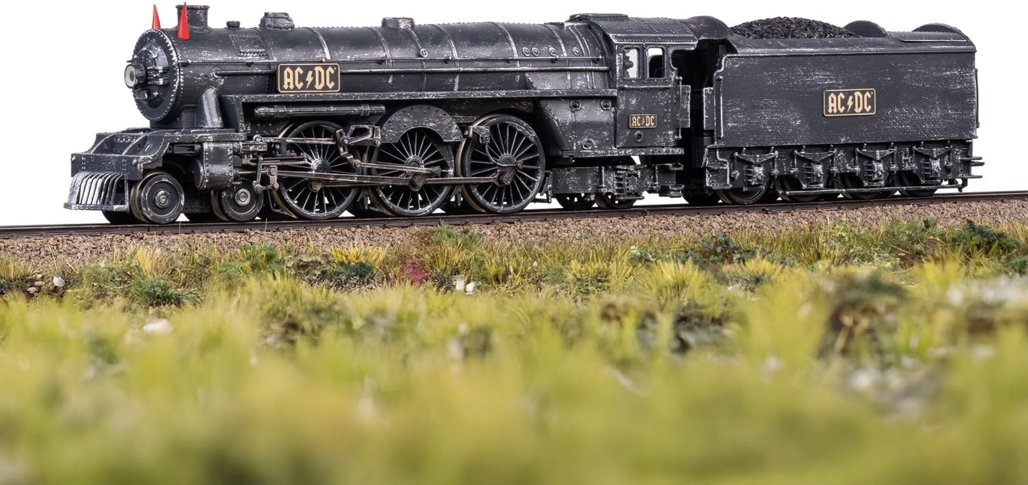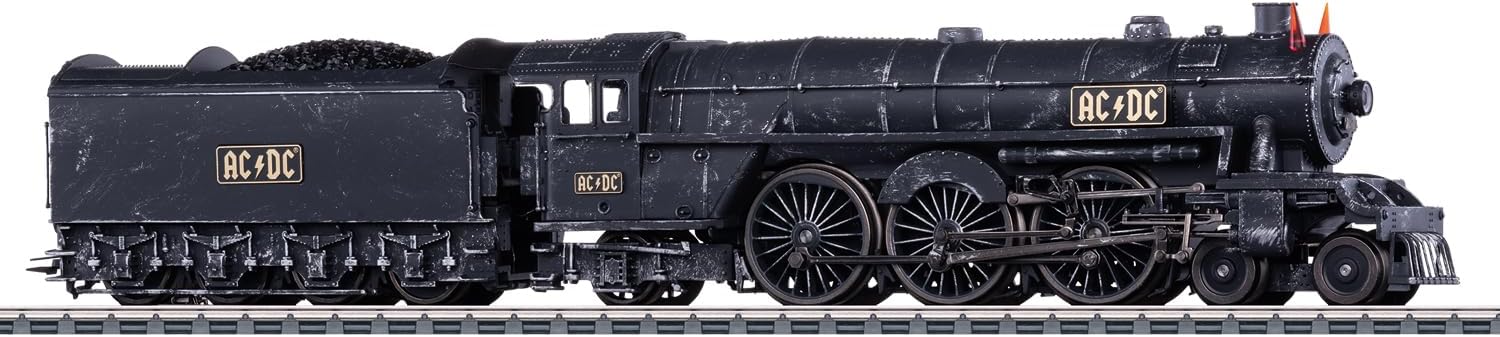 Locomotiva a vapore "Black Ice", modellata sullo sfondo del palcoscenico AC/DC Black Ice World Tour 2008-2010. Molti dettagli della locomotiva da palcoscenico. Con inserto fumo per emissioni dinamiche di fumo dipendente dalla velocità. Naturalmente con le tipiche corna da diavolo AC/DC, illuminate e commutabili digitalmente. Anche la cabina di guida e il passaggio al tender sono illuminati e commutabili digitalmente. Il look usato del palcoscenico è realizzato a mano da un invecchiamento. Ogni pezzo è unico.