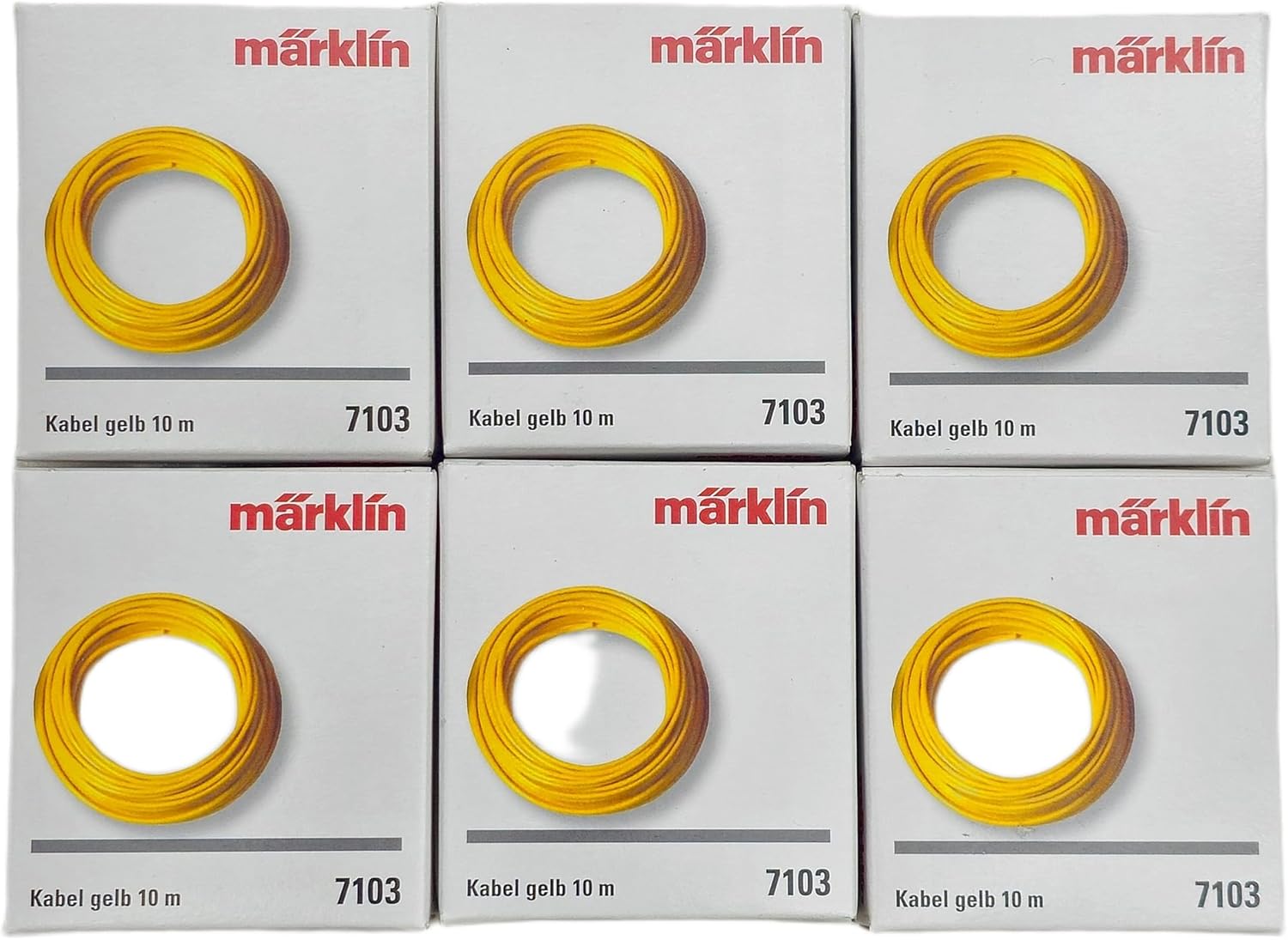 Set di 6 cavi Märklin gialli – Collegamento illuminazione e accessori per modelli H0 Pacchetto specializzato per collegamenti multipli di luci, deviazioni ed edifici. Tutto in giallo standard Märklin. Cavo unifilare 7103 in colore giallo – Ideale per sistemi digitali, illuminazione di carri, retrocontatto o accessori per modelli H0 Ogni rotolo contiene 10 metri di cavo con sezione da 0,19 mm² – elevata flessibilità e compatibilità con le connessioni Märklin Include poster da collezione Märklin – Design variabile ed esclusivo, perfetto per gli appassionati di modellismo (a seconda della disponibilità)