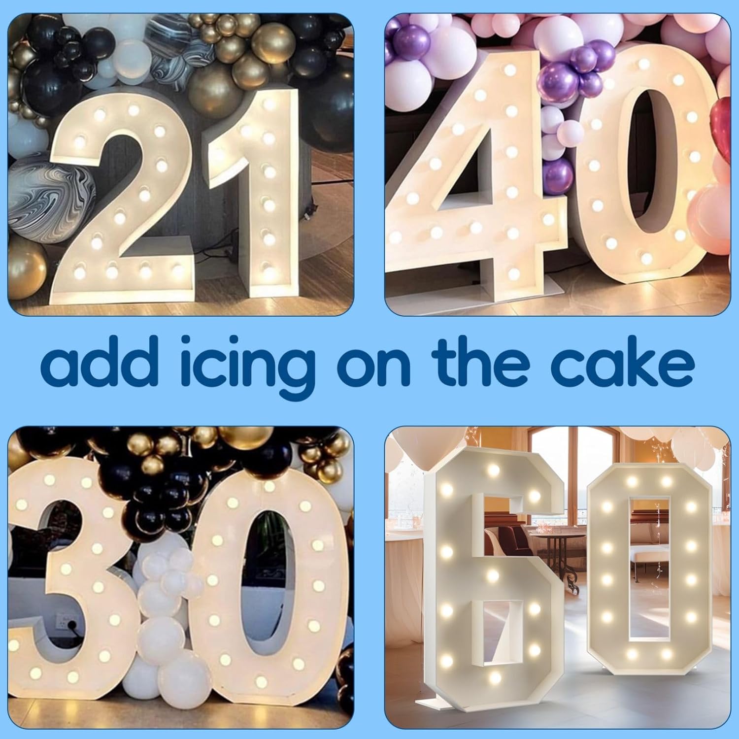 ?? 【ASSEMBLAGGIO NECESSARIO】 Scatena il tuo decoratore interiore con i kit di numeri luminosi del tendone, la confezione include pannelli di schiuma pretagliati, stringhe leggere; nastro biadesivo e manuale di istruzioni, segui le istruzioni passo dopo passo per un montaggio senza problemi ?? 【SCATENA LA TUA CREATIVITÀ】 più da 0 a 9 e la lettera dalla a alla z offrono infinite possibilità di creazione e possono essere abbinate a feste di compleanno con temi diversi e colori diversi. Puoi dipingere per rendere unici i numeri, riempirlo con palloncini, fiori, luci del tendone ?? 【SFONDO PERFETTO】 Basta avvitare le luci della stringa incluse attraverso i fori pretagliati per creare il perfetto centrotavola con numeri di lettere del tendone. Personalizza liberamente il tema della tua festa, uno sfondo perfetto per decorare qualsiasi festa romantica e celebrare l'occasione ?? 【ILLUMINAZIONE BRILLANTEMENTE SICURA】 I nostri numeri di illuminazione del tendone sono alimentati da 3 batterie AAA (non incluse), che forniscono una luce bianca morbida e calda, forniscono 2 modalità di illuminazione tra cui scegliere, fissa e lampeggiante, che illumina il numero del tendone senza rischi ?? 【USO DIFFUSO】 Illumina le tue celebrazioni con i nostri numeri di tendone alti 4 piedi. Ideali per compleanni, anniversari e altro ancora, combinali con un kit di archi a ghirlanda di palloncini per rendere la tua festa indimenticabile e lascerà i tuoi ospiti a bocca aperta.