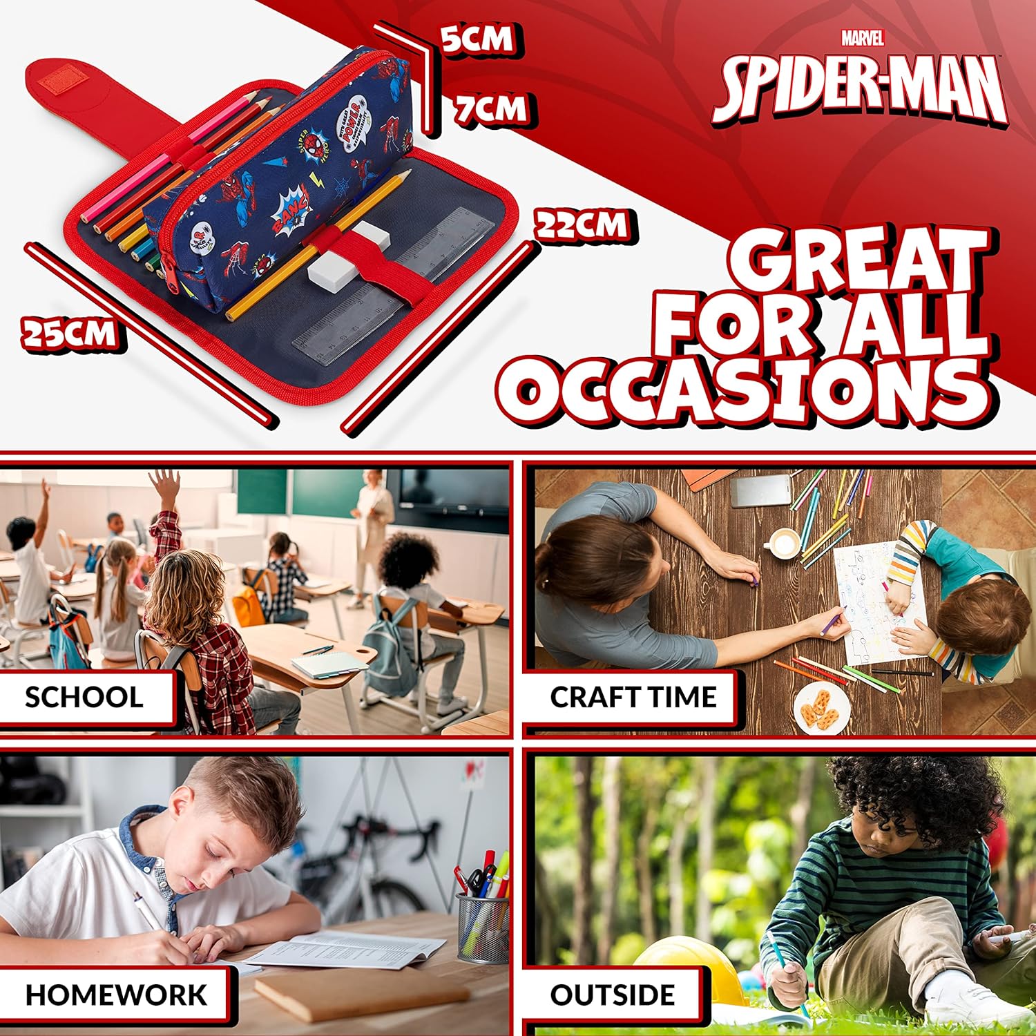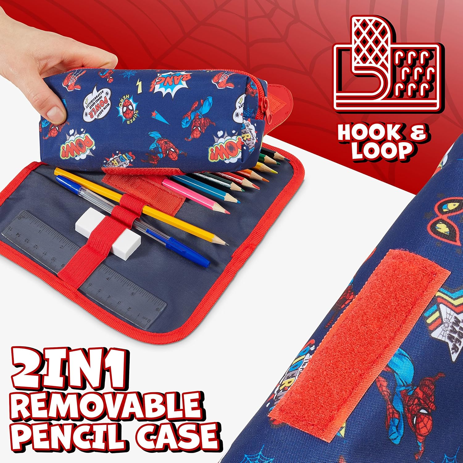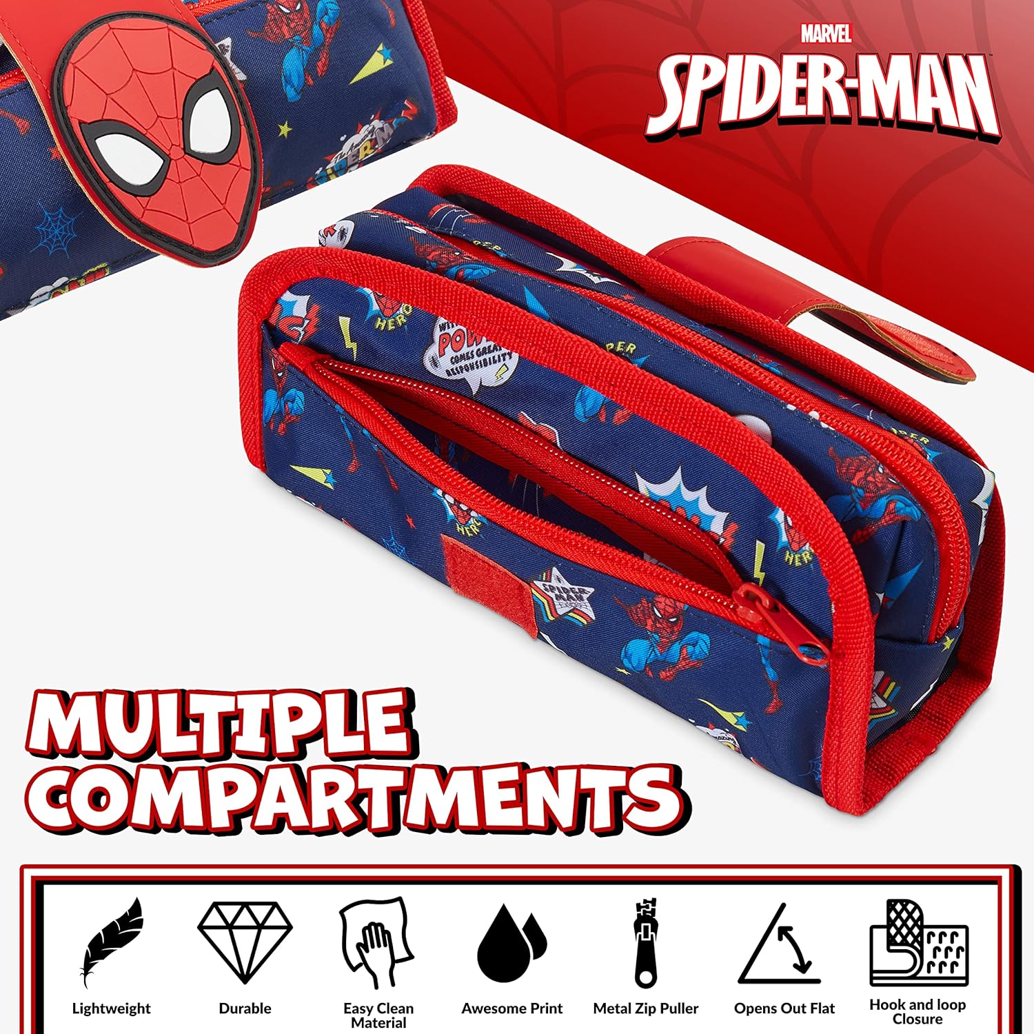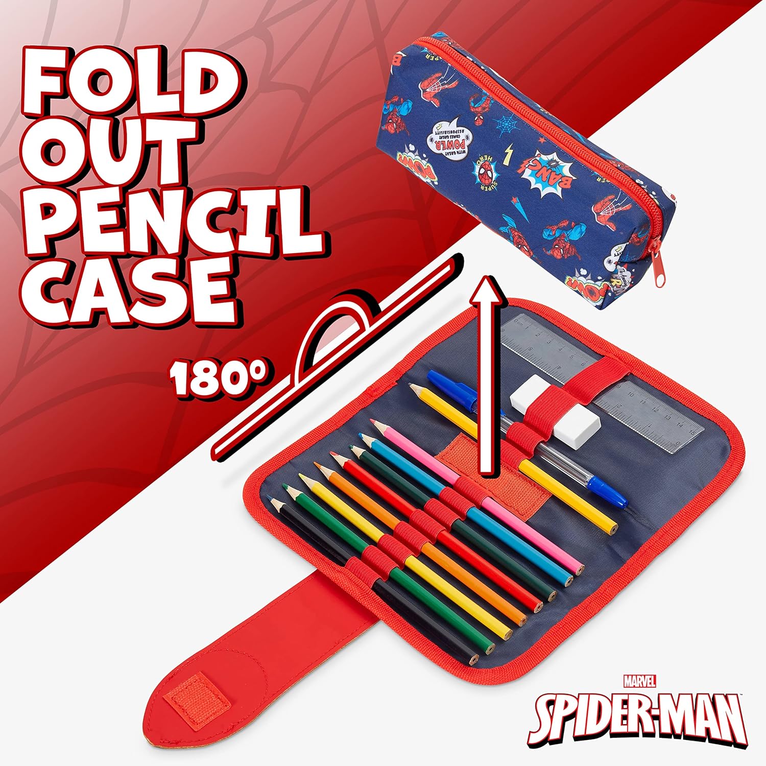 PORTAPENNE SPIDERMAN BAMBINO: da non perdere per i fan dei supereroi Marvel, un astuccio portapenne di Spiderman con cancelleria inclusa COSA CONTIENE: questo astuccio a scomparti include 8 matite colorate, matita HB, penna, righello, gomma + bustina zip staccabile all'interno IDEE REGALO SPIDERMAN: questo astuccio 3 scomparti bambino sarà un regalo apprezzatissimo dai bimbi per un compleanno o per affrontare il ritorno a scuola dopo le vacanze MARVEL UFFICIALE: astuccio scuola a tema Spiderman con licenza ufficiale Marvel ed esclusiva per Get Trend PERFETTO PER LA SCUOLA: astuccio 3 scomparti Spiderman adatto per le elementari con 2 scomparti per matite colorate e cancelleria e 1 scomparto zip staccabile