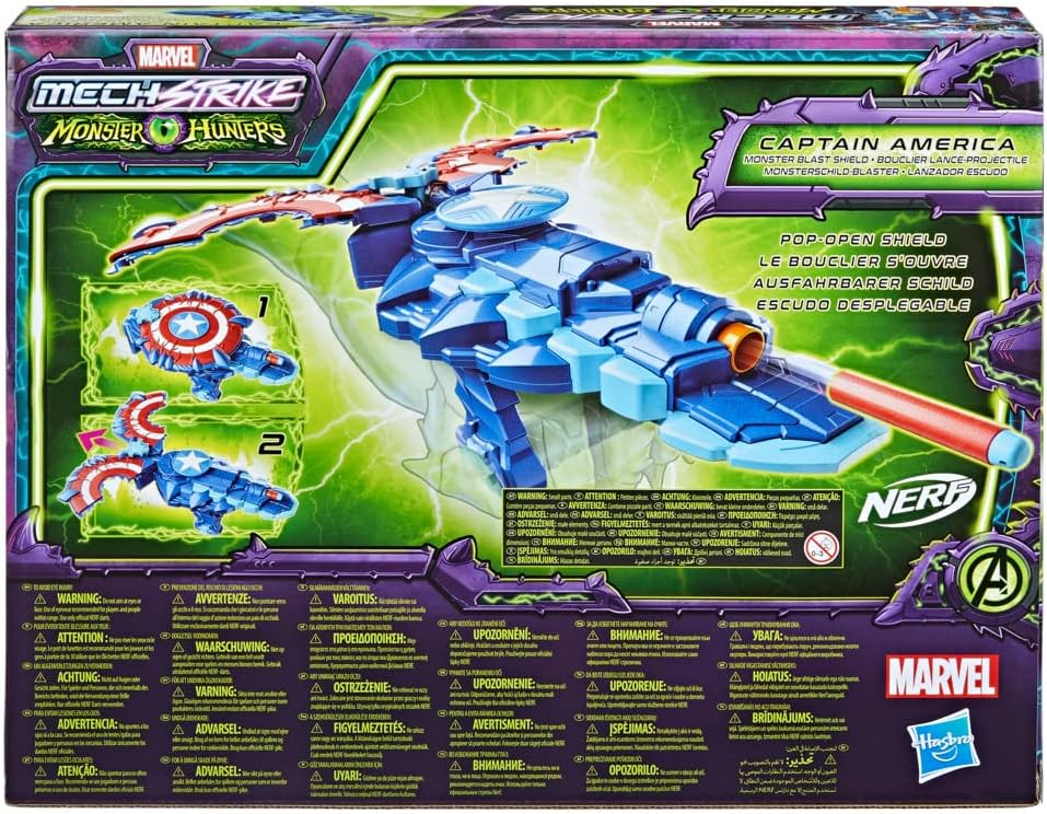 CAPTAIN AMERICA MONSTER BLAST SHIELD: Capitan America si prepara in un enorme tuta mech bio-organica per combattere i cattivi mostri, armato con il suo Monster Blast Shield Scudo pop-open: tirare indietro l'icona occhio mostro per attivare lo scudo pop-aperto, quindi premere il pulsante sul manico per sparare un dardo Nerf per un'azione di esplosione mostro NERF FIREPOWER: il Marvel Mech Strike Monster Hunters Captain America Monster Blast Shield viene fornito con tre freccette Nerf. (Freccette aggiuntive vendute separatamente. Soggetto a disponibilità.) MARVEL Design ispirato all'universo: i bambini dai 5 anni in su possono immaginare di combattere versioni mostruose dei cattivi Marvel con questo giocattolo di ruolo Monster Hunters, ispirato all'universo Marvel CERCA ALTRI MARVEL SUPER HERO GEAR: tieni d'occhio altri giocattoli di ruolo Marvel e immagina di formare una squadra di Super Heroes con gli amici. (Prodotti aggiuntivi venduti separatamente. Soggetto a disponibilità.)