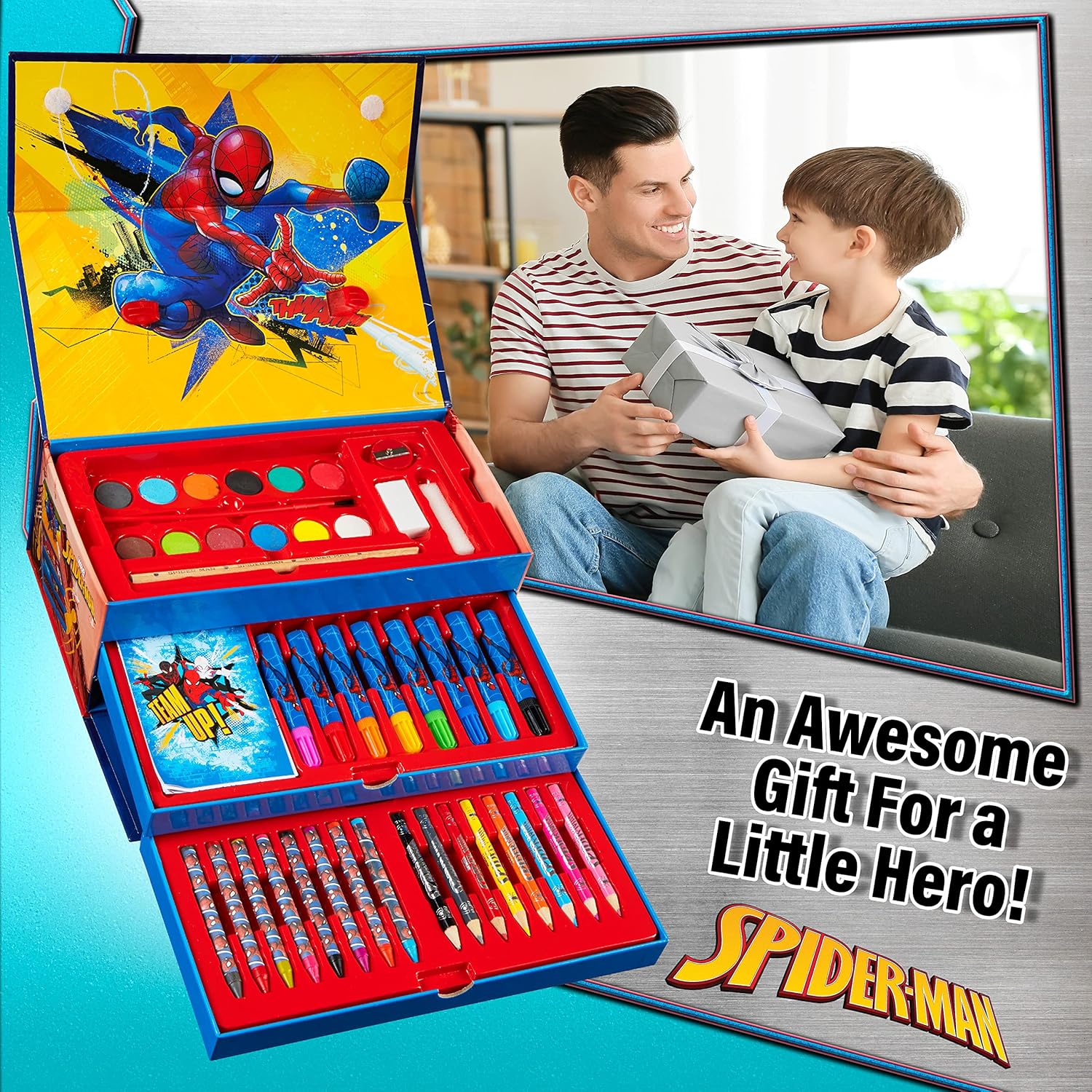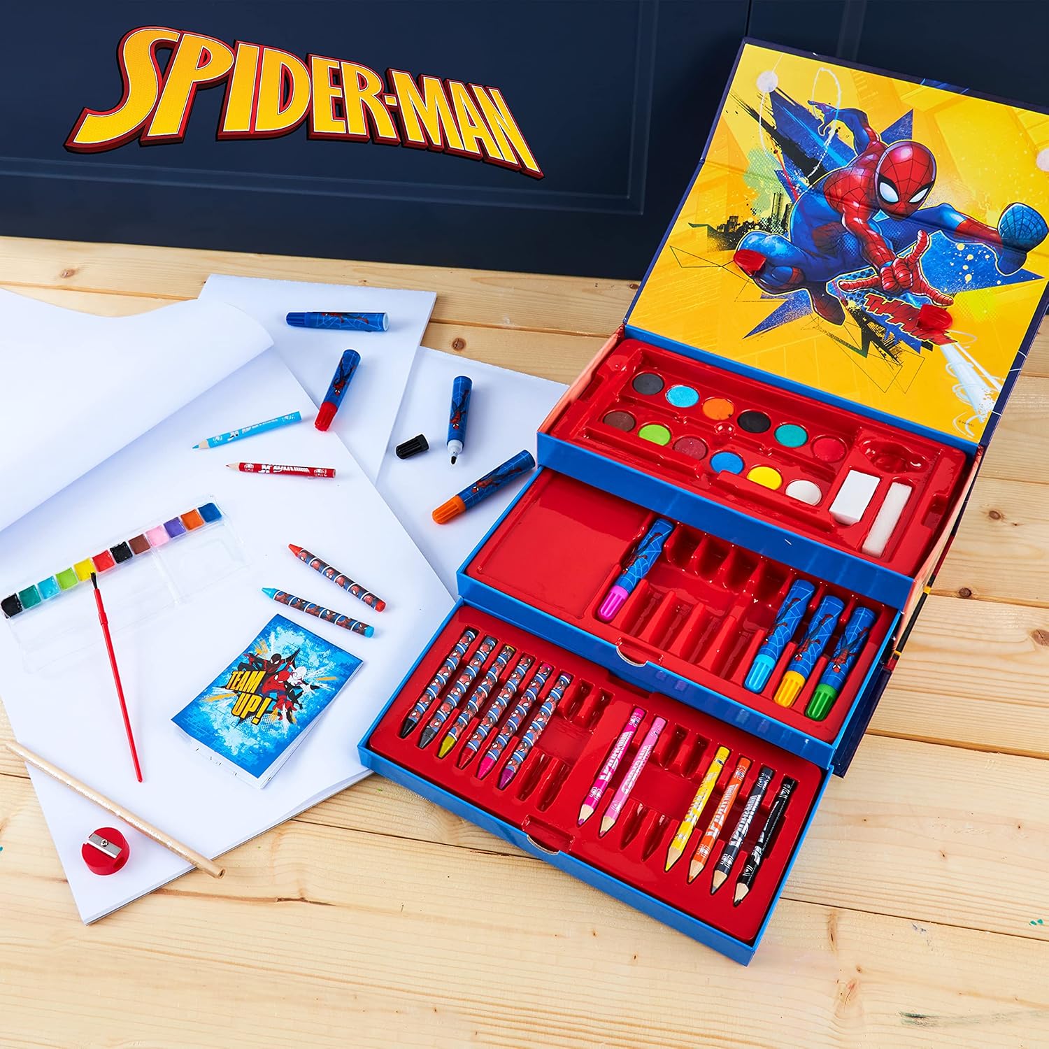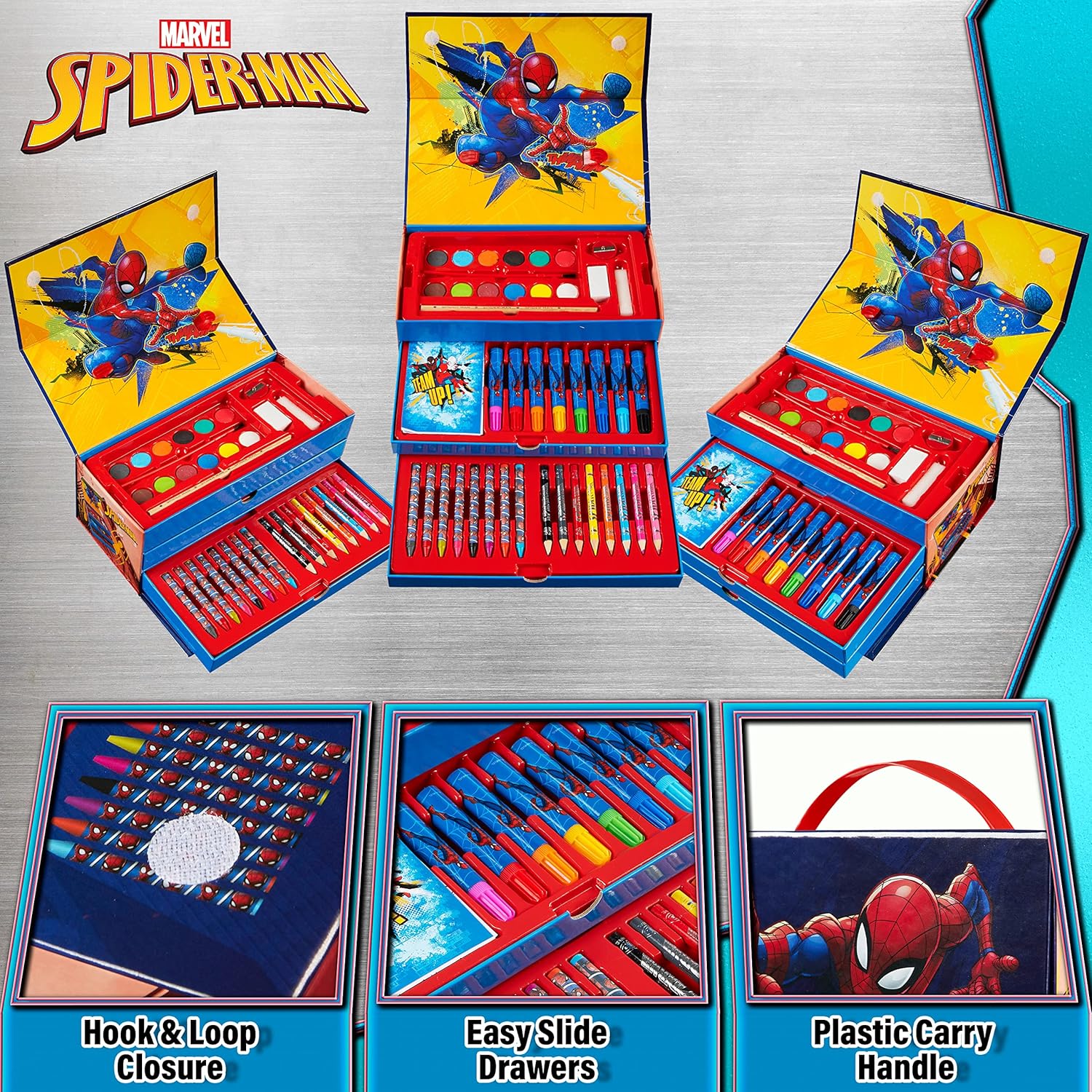 Mantieni i più piccoli intrattenuti e scatena la loro creatività con questo set da colorare Spiderman pieno di divertenti forniture d'arte Contenuto: 12 dischi acquerelli, 8 pennarelli coloranti, 8 pastelli, 8 mini matite colorate, 1 matite HB, 1 pennello, 1 spugna, 1 temperino, 1 gomma, 1 mini libro da colorare Tutto ciò di cui hai bisogno: questo fantastico set artistico per bambini include tutto il necessario per creare disegni e dipinti e sperimentare nuove tecniche. Tutti conservati ordinatamente in una pratica custodia a 3 livelli Apprendimento e sviluppo: questi set da colorare per bambini sono ideali per sperimentare diverse tecniche, colori e texture Marvel regali per ragazzi: alla ricerca di giocattoli Spiderman o set di attività per un compleanno o Natale? Questi set artistici per bambini per ragazzi renderanno il regalo perfetto per qualsiasi giovane supereroe