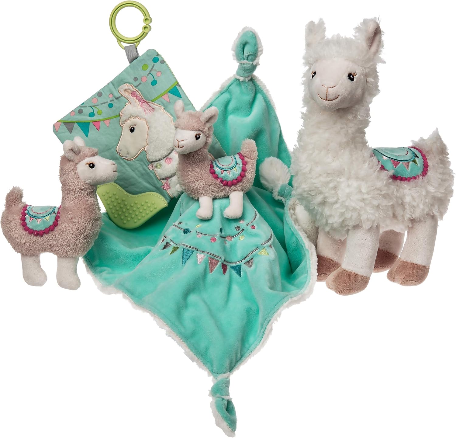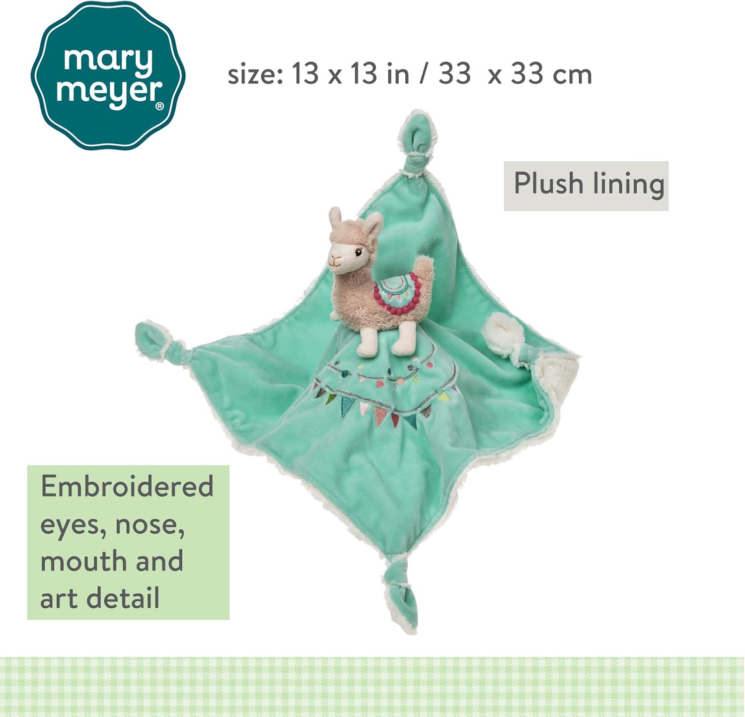 Coperta per personaggio: morbido giocattolo di Lily lama e coperta da 33 x 33 cm LLAMA AMOBILE: Il peluche è un coltello dolce e soffice con finiture decorative cucite sulla schiena Ideale per le coccole: coperta realizzata in tessuto verde menta con bandiera ricamata, presenta angoli annodati e una soffice fodera bianca sul lato inferiore Lavabile in lavatrice: lavare in acqua fredda con ciclo delicato, asciugare all'aria Divertente regalo per infermiere: da abbinare a peluche, sonaglio e massaggiagengive increspate della collezione Lily Llama di Mary Meyer; sono un ottimo regalo coordinato per un baby shower