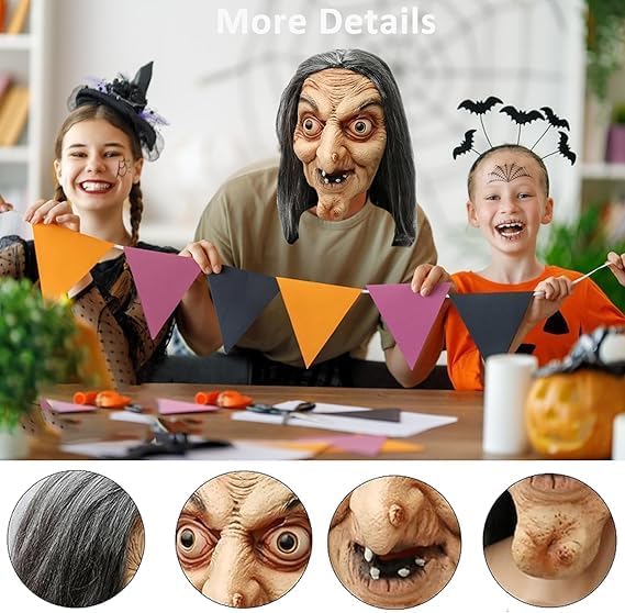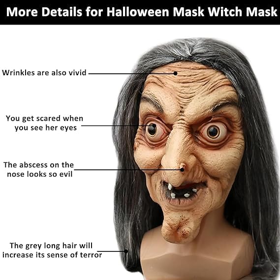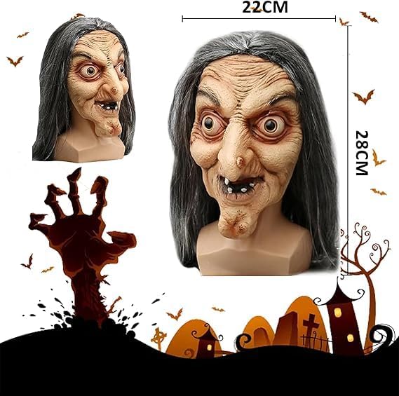 【Maschera da Strega Spaventosa】 Questa maschera da strega in lattice realistico ha un aspetto realistico e spettrale, perfetta per Halloween! La maschera 3D (taglia unica) è molto comoda da indossare e si adatta alla maggior parte degli adulti e degli adolescenti. Ideale per feste in maschera, servizi fotografici o scherzi spaventosi con gli amici. 【Materiale sicuro e di alta qualità】 Realizzata in lattice naturale (ecologico, atossico) con rivestimento impermeabile. La maschera è resistente, antistrappo e si adatta comodamente grazie al suo materiale morbido e flessibile. Nota: al primo utilizzo potrebbe verificarsi un leggero odore di lattice: è sufficiente pulirla con acqua e lasciarla asciugare all'aria. 【Design confortevole】 Dimensioni: 22 x 28 cm (maschera) + parrucca da strega da 40 cm Spazio interno extra per chi indossa gli occhiali Leggero (non affatica) Occhi iniettati di sangue e capelli spettinati per un look davvero horror 【Atmosfera spettrale perfetta】 Con i dettagli demoniaci (viso lungo e bianco, espressione spaventosa), sarai la star di qualsiasi festa di Halloween! Sorprendi i tuoi amici o crea un'atmosfera horror indimenticabile, anche per feste a tema, cosplay o decorazioni da casa stregata. 【Usi versatili】 Non solo per Halloween: ideale per carnevali, teatro, escape room, eventi horror o come oggetto di scena. La maschera realistica garantisce la pelle d'oca e offre sorprese sonore!