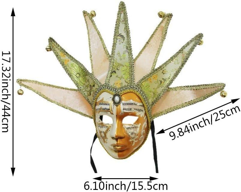 Personalità, l'elegante maschera ti rende più attraente e glamour in una festa. Design caratteristico squisito - con colori e luminosità piacevoli. Questa maschera veneziana può essere utilizzata per partecipare a tutti i tipi di feste, spettacoli, compleanni, Halloween, Natale o qualsiasi altra occasione festiva. La maschera veneziana 1Jester è realizzata con materiali plastici di alta qualità, sicuri e durevoli, puoi essere sollevato nell'usarla. Questa bellissima maschera artistica può essere appesa alla decorazione della parete o indossata utilizzando un nastro attaccato su entrambi i lati del viso.