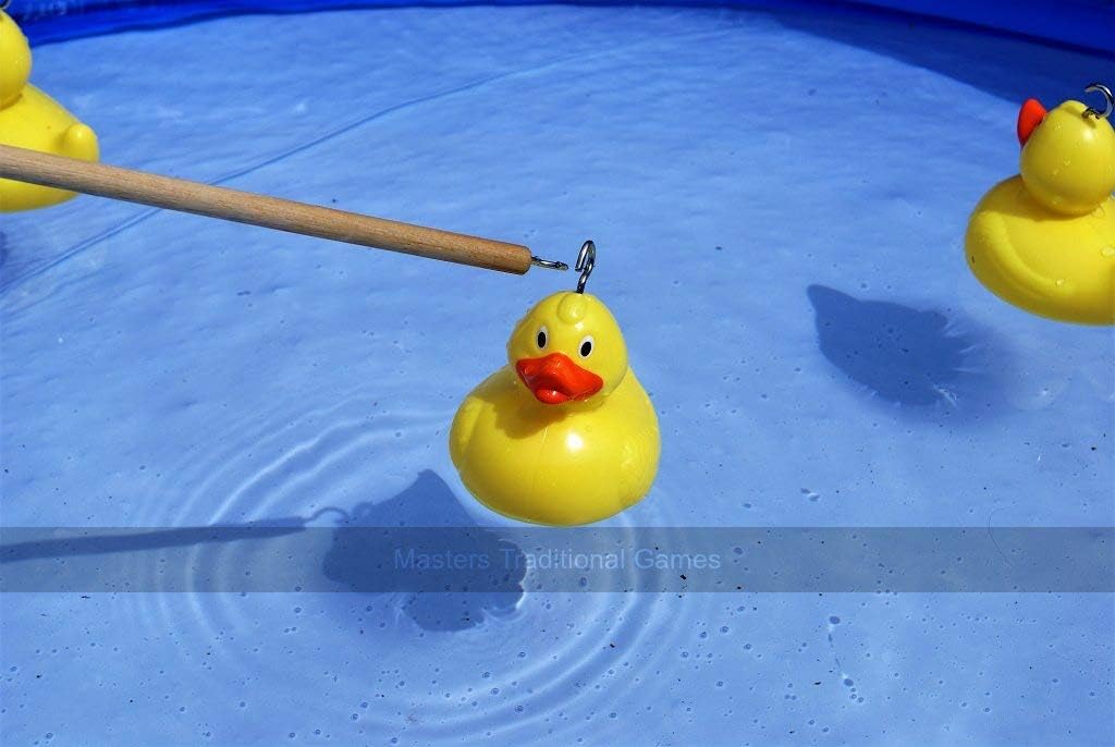 Set Hook a Duck di qualità premium che include 10 anatre gialle ben dettagliate Le anatre sono pesate in modo che non si rovescino Grande piscina gonfiabile per bambini - il colore della piscina può essere diverso dall'immagine Include 3 canne da pesca in legno da 60 cm con ganci Un gioco di raccolta fondi molto popolare nelle fiere e feste estive - Aggancia un'anatra numerata per vincere un premio