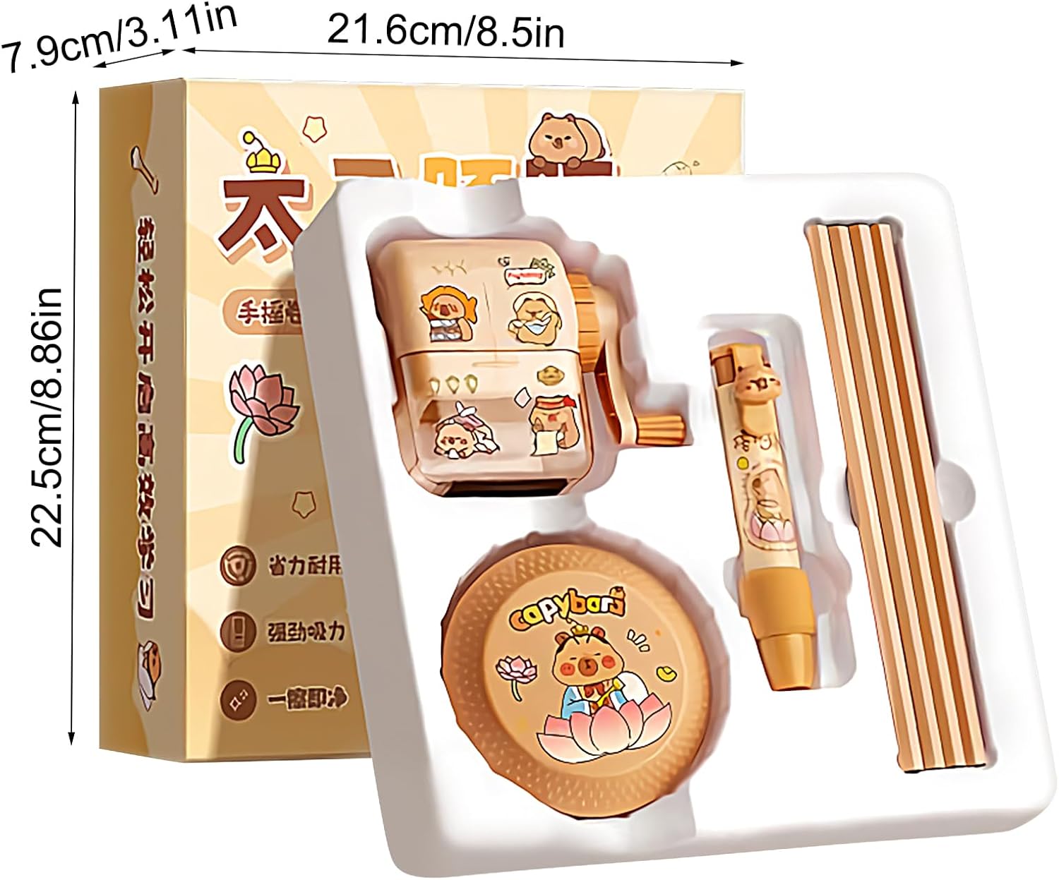 Compagno Scrittura Efficiente: Unisce un pratico aspirabriciole elettrico per la pulizia, un temperamatite a manovella per punte perfette e gomme con presa ergonomica per migliorare la tua esperienza di scrittura Pulizia Efficiente: La combinazione aspiratore e temperamatite rimuove efficacemente i residui di gomma, creando un ambiente di apprendimento ordinato e confortevole per aumentare la produttività con compatibilità per molteplici varietà di matite Sicurezza Garantita: Costruzione robusta in PP resiste all'uso frequente mantenendo la qualità nel , affidabilità costante per serenità duratura nell'impiego quotidiano Divertimento Assicurato: Porta sorrisi a bambini e ragazzi con questo set cancelleria , creato per esprimere cura in occasioni come compleanni, festività stagionali o celebrazioni di Capodanno Materiale Scolastico Accattivante: Questo set con adesivi di capibara e panda astronauta stimola la curiosità dei bambini studio aggiungendo un tocco visivamente dinamico alle attività quotidiane
