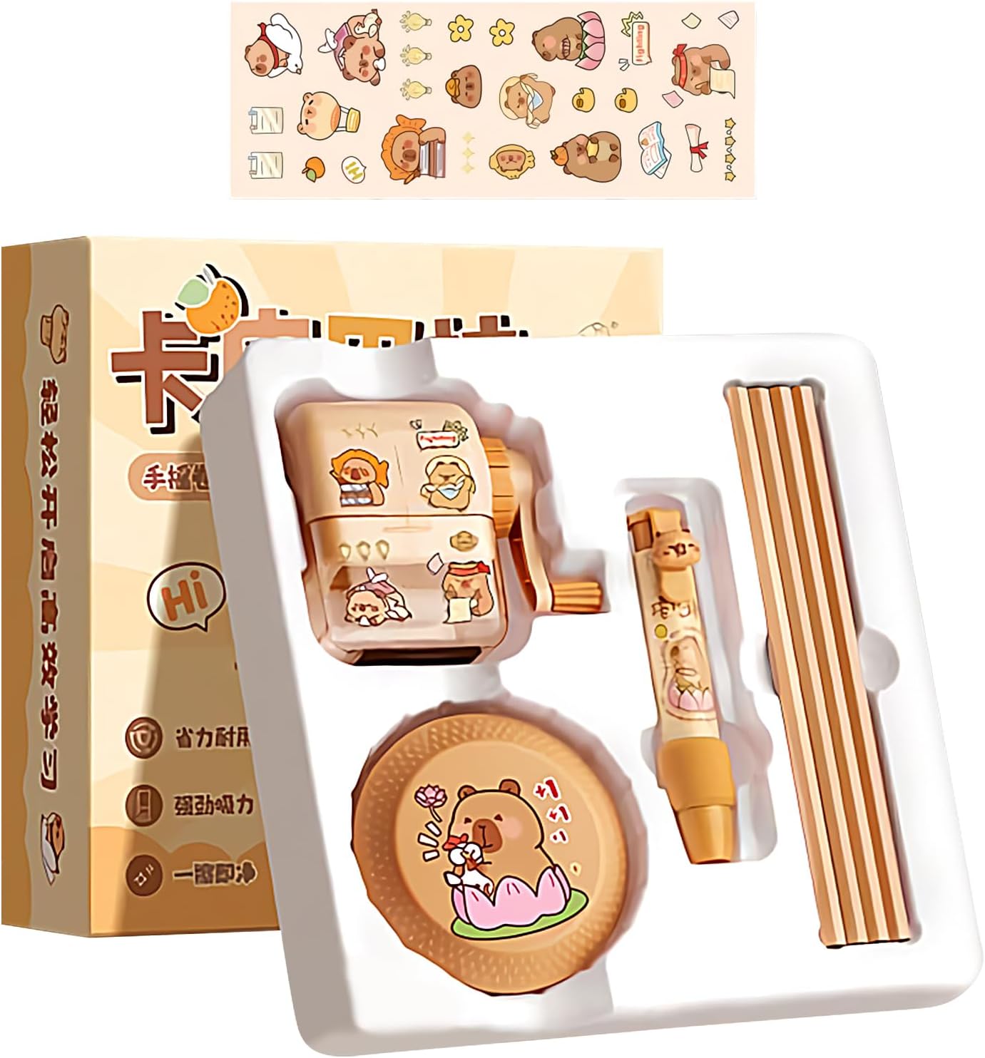 Compagno Scrittura Efficiente: Unisce un pratico aspirabriciole elettrico per la pulizia, un temperamatite a manovella per punte perfette e gomme con presa ergonomica per migliorare la tua esperienza di scrittura Moderno Supporto: Grazie all'aspiratore per residui e al temperamatite versatile, il set favorisce un lavoro ordinato migliorando l'efficienza di apprendimento attraverso design funzionale e praticità d'uso quotidiano Resistenza Provata: I materiali PP resilienti prevengono da attività giornaliere, offrendo funzionalità duratura ed esperienze senza preoccupazioni con utilizzo costantemente sicuro Divertimento Assicurato: Porta sorrisi a bambini e ragazzi con questo set cancelleria , creato per esprimere cura in occasioni come compleanni, festività stagionali o celebrazioni di Capodanno Materiale Scolastico Accattivante: Questo set con adesivi di capibara e panda astronauta stimola la curiosità dei bambini studio aggiungendo un tocco visivamente dinamico alle attività quotidiane