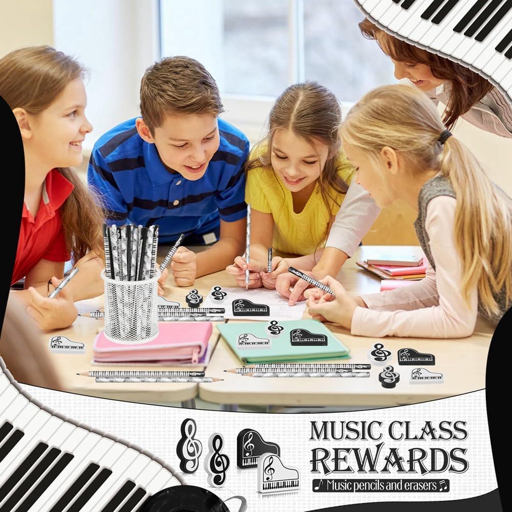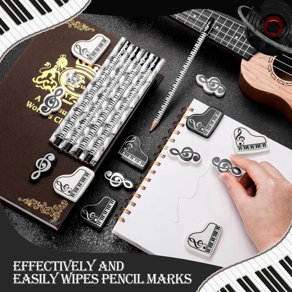 Perfetti per feste a tema ispirate alla musica: le nostre penne musicali sono l'accessorio perfetto per eventi musicali. L'aspetto seducente delle note musicali e dei colori classici attirerà l'attenzione ed è anche un bel regalo per le feste per assicurarti di lasciare un'impressione indimenticabile Ampia scelta: questi articoli a tema musicale sono attraenti con colori bianco e nero che evidenziano note musicali e modelli di tastiera per pianoforte. Il tema è rivolto agli appassionati di musica e rende questo set un popolare tra studenti e insegnanti Materiale di qualità: le nuove gomme incluse nel nostro set sono realizzate in gomma di alta qualità, mentre le matite sono realizzate in alta qualità. Ciò garantisce un prodotto sicuro per i vostri bambini e allo stesso tempo garantisce agli utenti un'esperienza di cancellazione pulita e senza sbavature Design filigranato: le penne sono facili da tenere in mano grazie alla loro forma esagonale; non si spostano facilmente dalla scrivania, rendendole uno strumento prezioso per aule e uffici, pratico e pratico Il regalo per gli amanti della musica: questi eleganti articoli per insegnanti di musica sono un regalo perfetto per bambini, insegnanti o studenti con una passione per la musica; che si tratti di coro, concerto, aula o l'officina musicale, queste matite esclusive faranno un'impressione ovunque