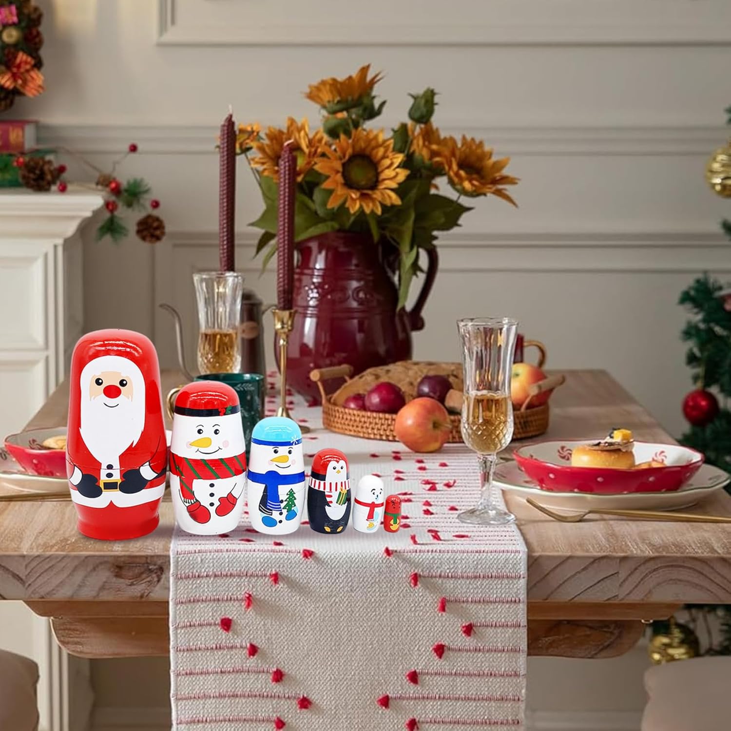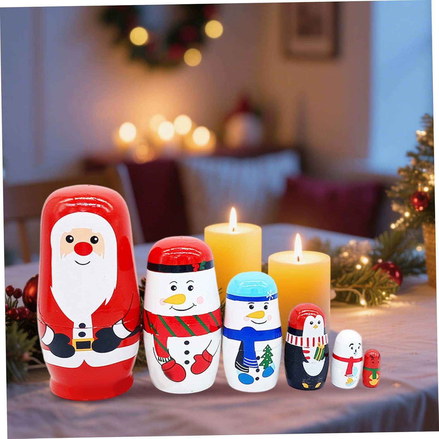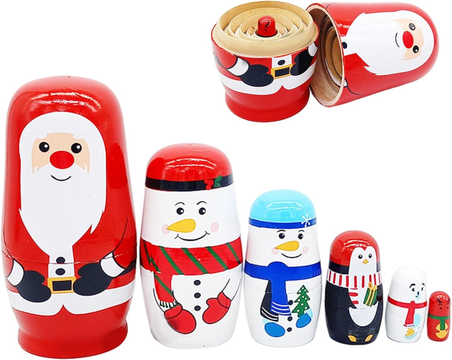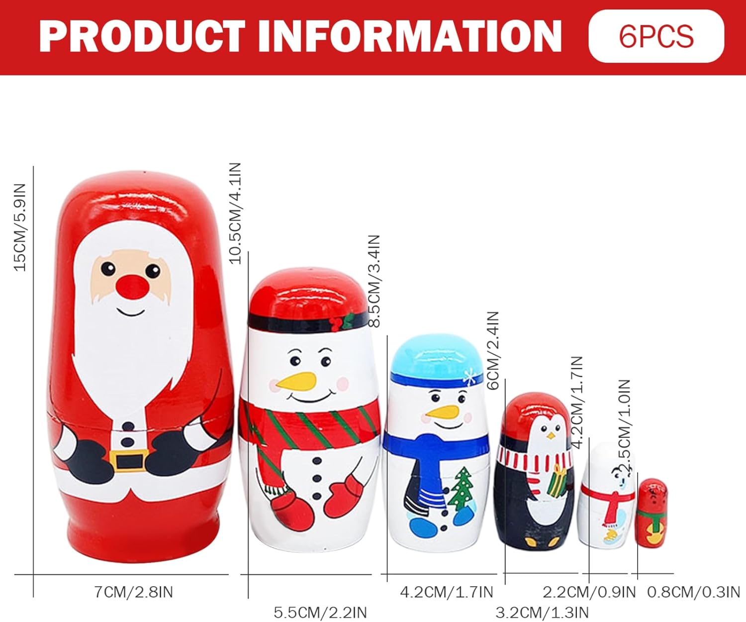 Decorazioni per la casa versatili: le bambole impilabili da 6 pezzi/set fungono da decorazioni stagionali uniche per case, uffici o feste festive, aggiungendo calore e fascino a qualsiasi spazio durante il periodo natalizio Materiale in legno: realizzate in legno, queste bambole matrioska garantiscono una lunga durata e una manipolazione sicura per bambini e adulti, unendo tradizione e robustezza Gioco educativo e divertente: ideali sia per bambini che per adulti, queste bambole russe da nidificazione incoraggiano il gioco fantasioso, le capacità motorie e l'apprezzamento culturale attraverso attività di impilamento e nidificazione Design natalizio festivo: le affascinanti bambole nidificanti natalizie presentano motivi di Babbo Natale, Pinguino, Pupazzo di neve e Orso polare, creando un'atmosfera gioiosa e vacanziera perfetta per riunioni di famiglia e decorazioni per feste Scelta perfetta: questo set è una scelta eccellente per bambini, collezionisti e chiunque apprezzi le classiche bambole russe con un tocco festivo e natalizio, esaltando la gioia della stagione