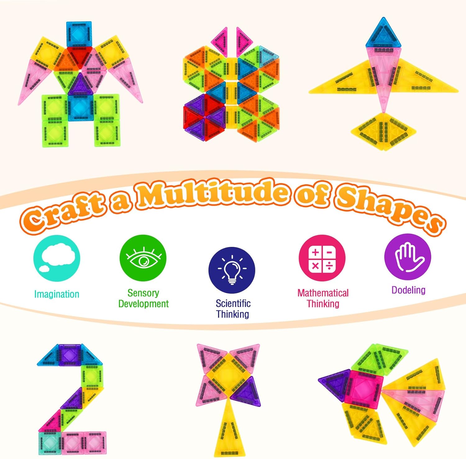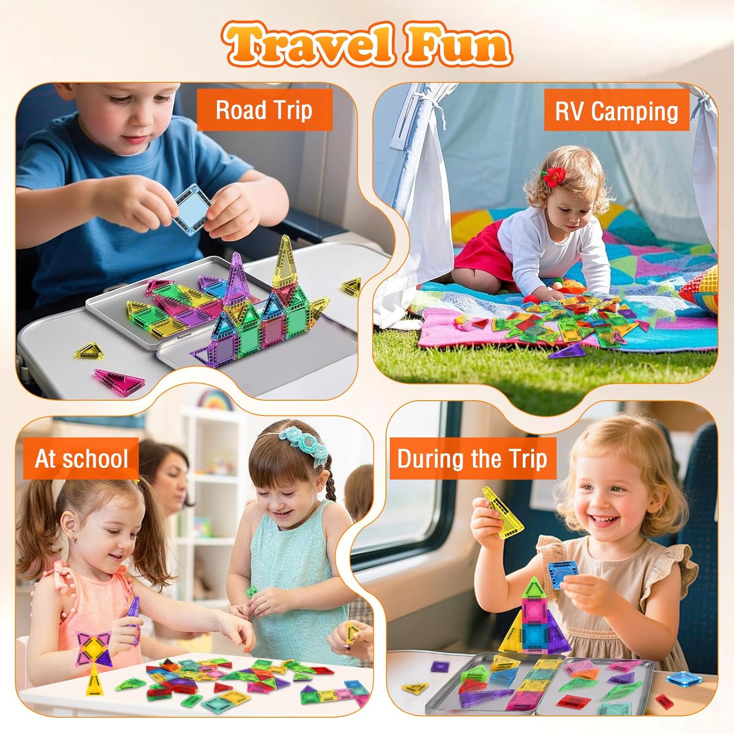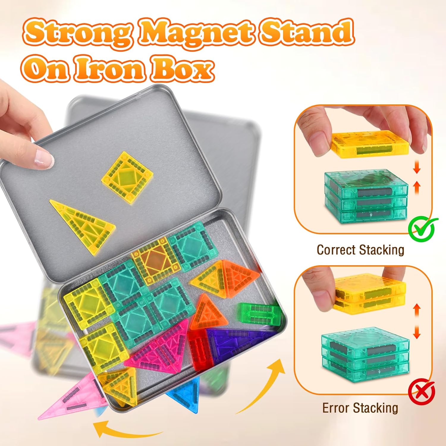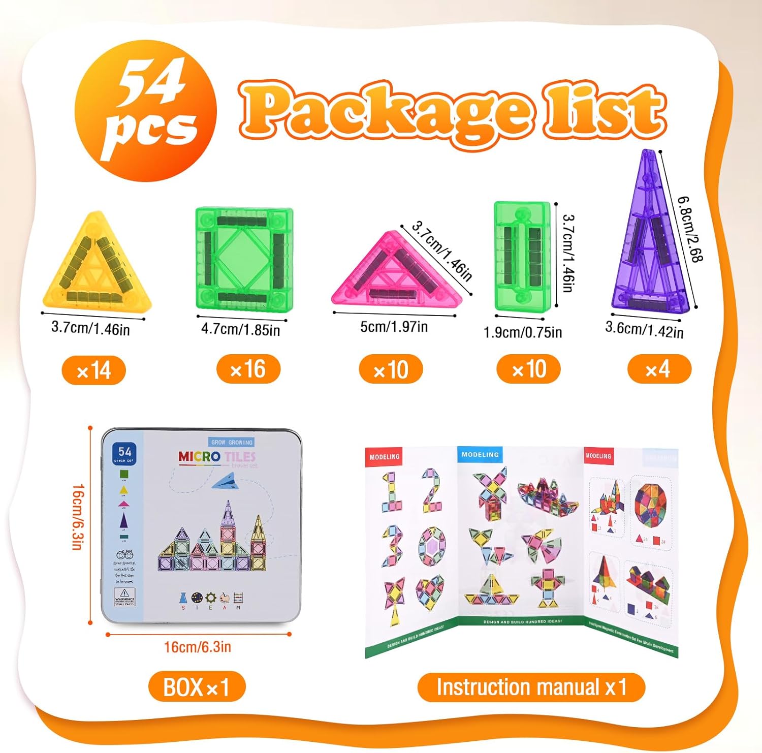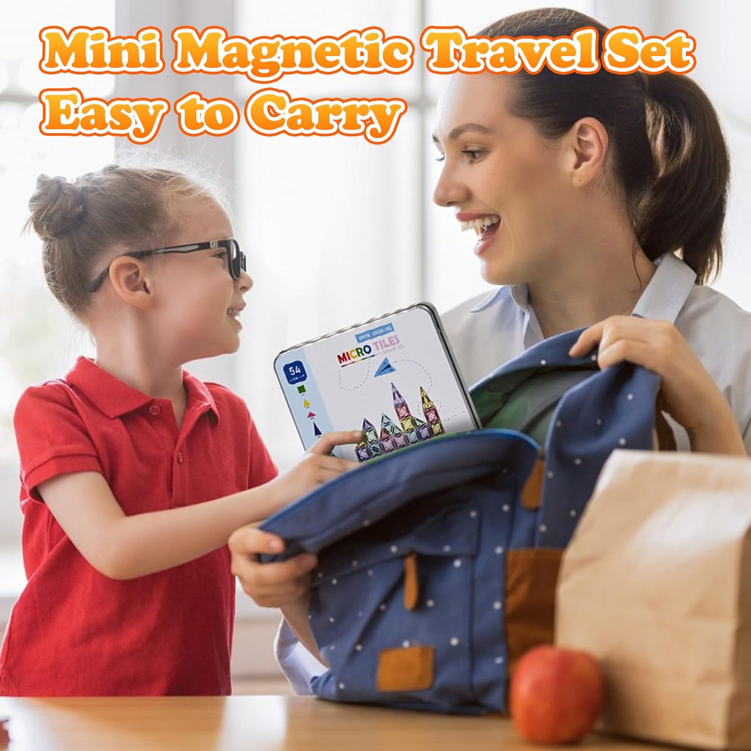 MINI PIASTRELLE MAGNETICHE DA VIAGGIO: I bambini adorano le piastrelle magnetiche! Questo set da viaggio compatto con 54 pezzi è il compagno ideale per i viaggi: in aereo, in macchina o al ristorante. Con le tessere magnetiche i bambini possono dare libero sfogo alla loro creatività e costruire forme, modelli e strutture diverse per divertirsi mentre sono in movimento. FACILE DA TRASPORTARE E SCATOLA DI STOCCAGGIO: LE mini piastrelle magnetiche con bordi antiscivolo possono essere collegate facilmente e stabilmente. La scatola (16,0 x 16,0 x 2,8 cm) è stata sviluppata appositamente per i viaggi e si adatta facilmente alla borsa o allo zaino. Tutti i 42 componenti magnetici trovano molto spazio nella scatola. Include mini istruzioni per la costruzione per un divertimento immediato! GIOCATTOLO CREATIVO E SENZA SCHERMO: QUESTO giocattolo da costruzione distrae efficacemente i bambini dai dispositivi elettronici. I colori vibranti e traslucidi incoraggiano l'apprendimento visivo e stimolano la creatività. La costruzione pratica e giocosa rafforza l'immaginazione spaziale: ideale per intrattenere e promuovere giochi senza schermo. QUALITÀ E SICUREZZA PREMIUM: le NOSTRE mini piastrelle magnetiche sono realizzate in materiale durevole e di alta qualità con bordi arrotondati per un gioco sicuro. I magneti saldamente integrati con design anti-allentamento garantiscono una presa stabile e un divertimento duraturo. REGALO IDEALE PER I BAMBINI: regala un giocattolo magnetico portatile che accompagna i piccoli esploratori ovunque! Questo set da viaggio è un regalo perfetto per i più piccoli. Confezionato in una scatola di metallo elegante e leggera, facile da trasportare e riporre per risparmiare spazio.