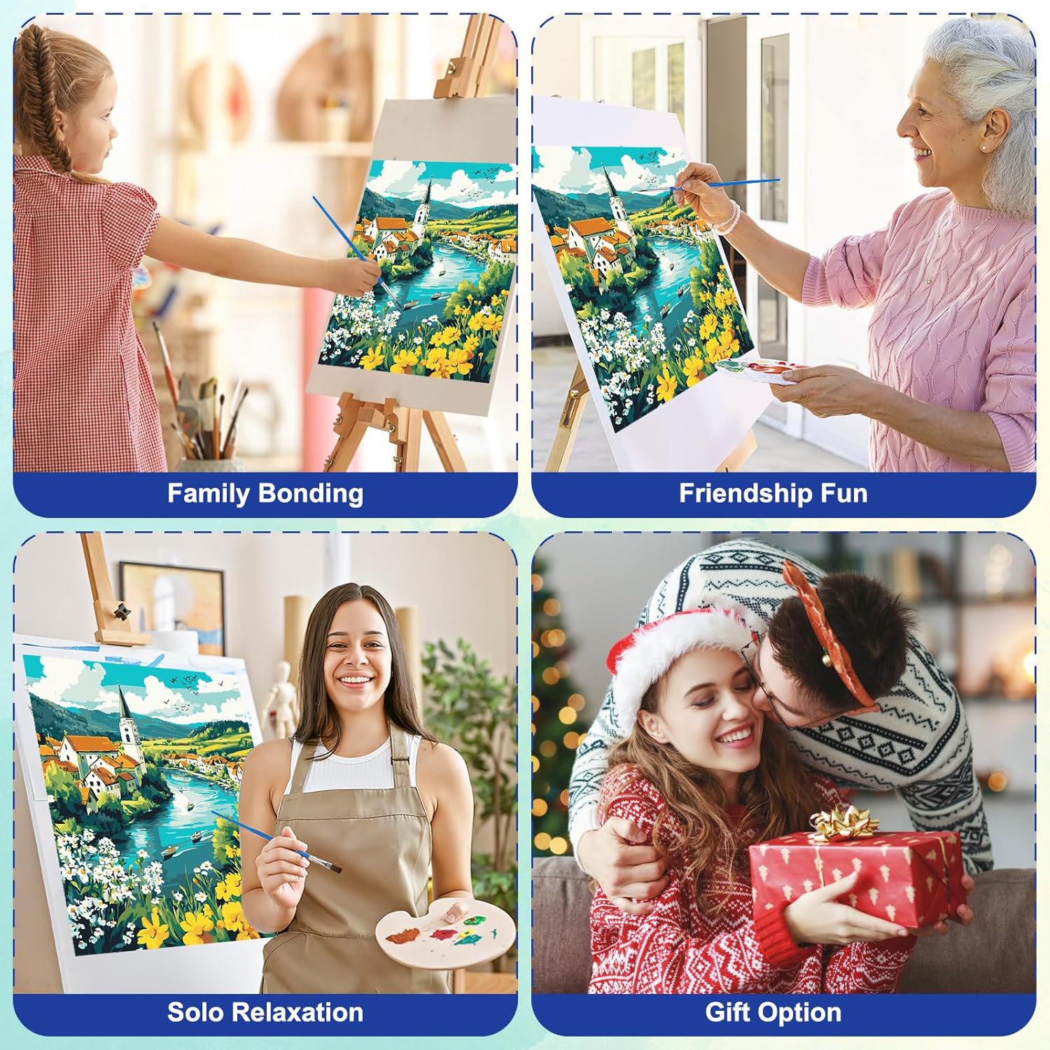 Ottimo per principianti & Goditi il tuo Tempo Libero Questo set di pittura con i numeri è perfetto per adulti principianti senza esperienza di pittura, offrendo istruzioni facili da seguire. Completa la pittura a olio con numeri con sezioni numerate intuitive, goditi una rilassante terapia artistica mentre crei oggetti da collezione, consentendo a tutti di diventare artisti eccellenti Tela di Qualità Premium & Codifica Chiara La pittura a colori utilizza una tela con resa cromatica ad alta definizione con numeri incisi al laser per una chiara visibilità. Il tessuto di tela resistente trattiene la vernice acrilica in modo uniforme senza sbavature, garantendo un processo di colorazione fluido Divertente & Facile da Iniziare La pittura a olio con i numeri non richiede la miscelazione dei colori, ogni vernice acrilica è pre-etichettata con numeri ed è pronta all'uso. Ogni barattolo numerato corrisponde all'area della tela corrispondente, consentendoti di dipingere facilmente e senza preoccupazioni Kit di Avvio Completo Questo kit da disegno per adulti include 3 pennelli professionali (piccolo/medio/grande), 2 ganci da parete, tela e ampia scorta di vernice. La pittura per adulti con i numeri è un regalo unico e creativo che può essere fatto ad amici, familiari, ecc. per compleanni, festa della mamma, San Valentino, Natale, ecc. La pittura a olio fai da te è anche un regalo ideale per gli amanti dell'artigianato Opera D'arte per Qualsiasi Spazio Dopo aver completato il dipinto, può diventare una decorazione perfetta per l'ufficio, il soggiorno, la camera da letto e la sala da pranzo, aggiungendo personalità a ogni stanza. Allo stesso tempo, il dipinto digitale completato è anche una scelta regalo unica per genitori, amanti, amici e bambini per compleanni, matrimoni, feste, Natale e altre occasioni