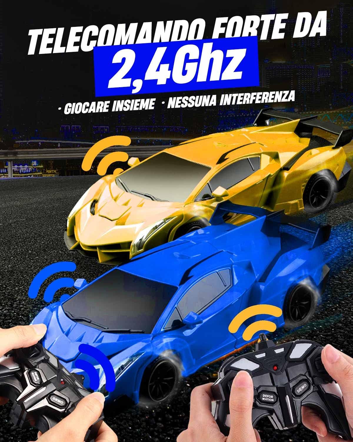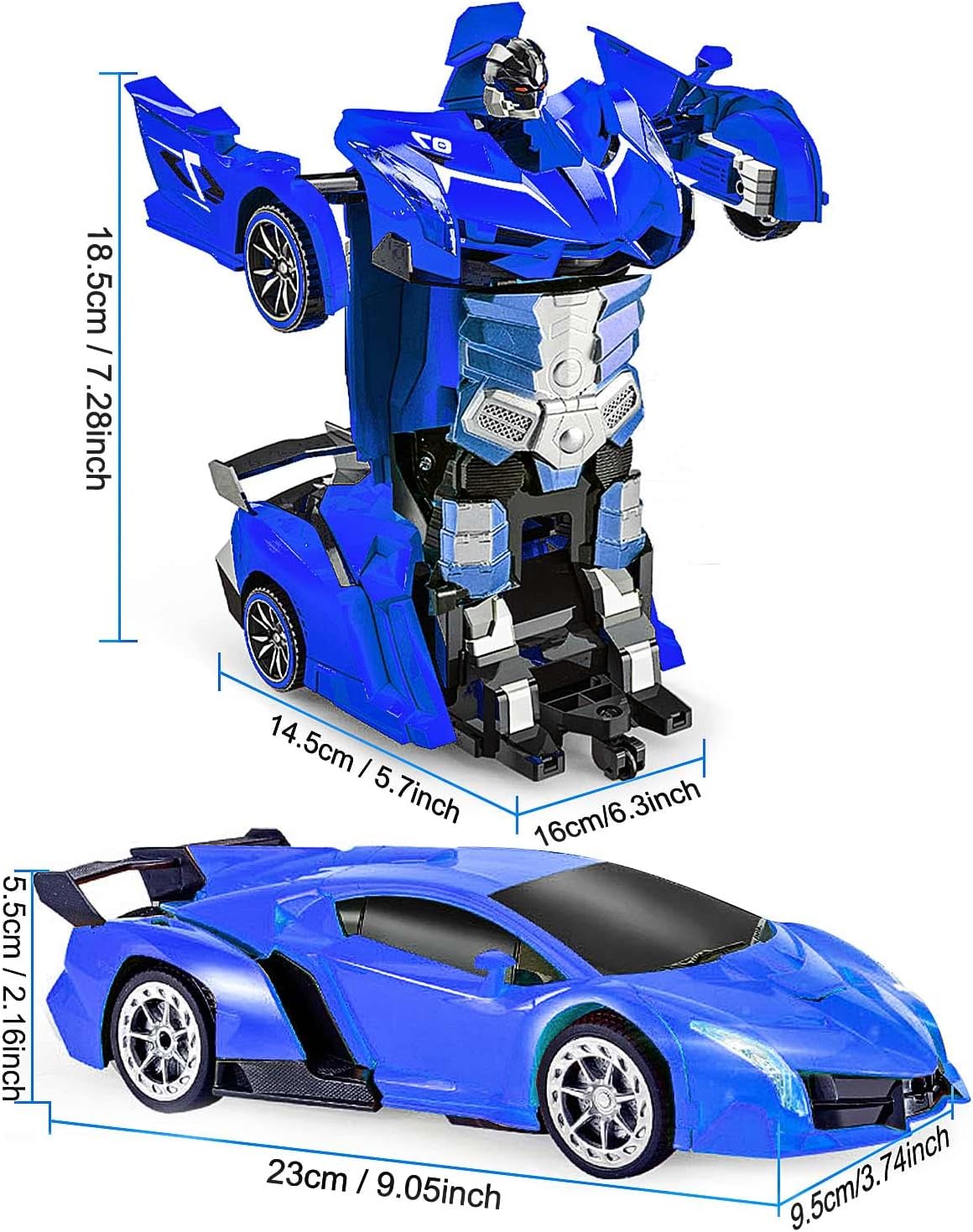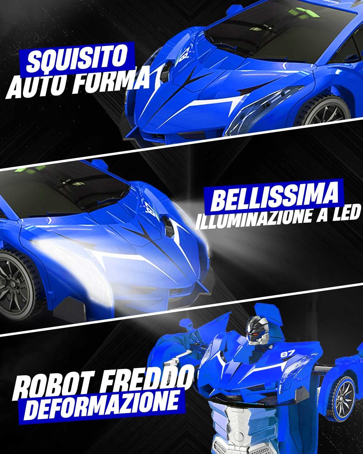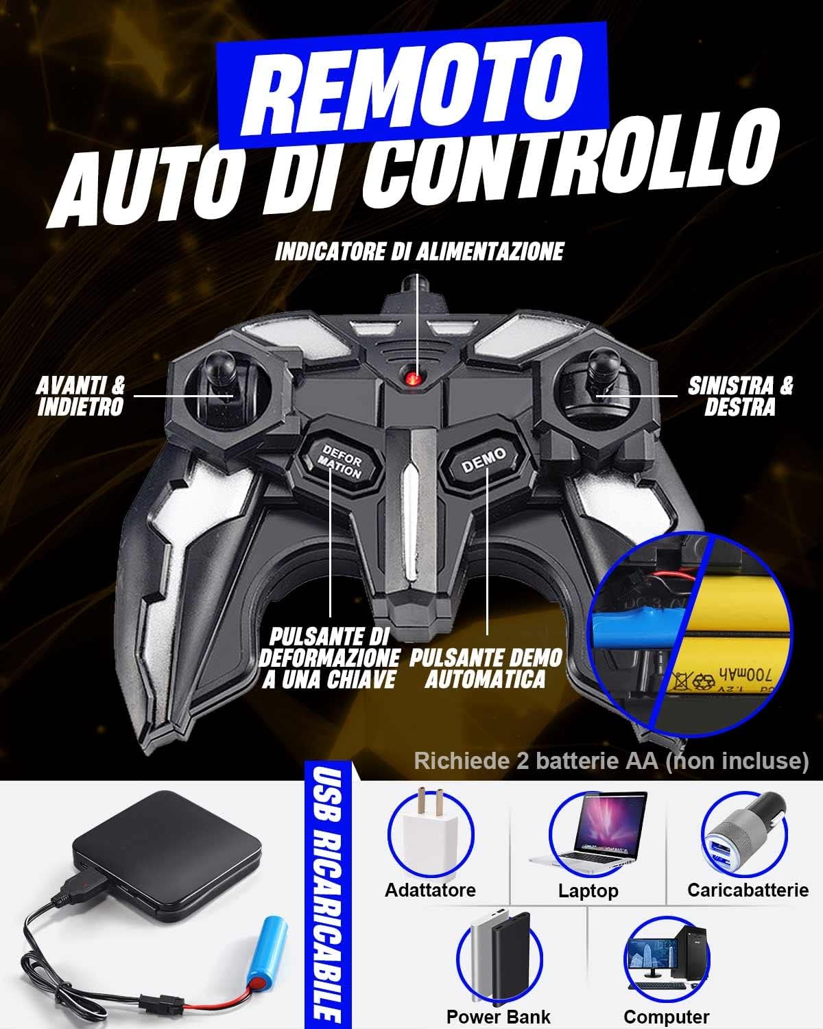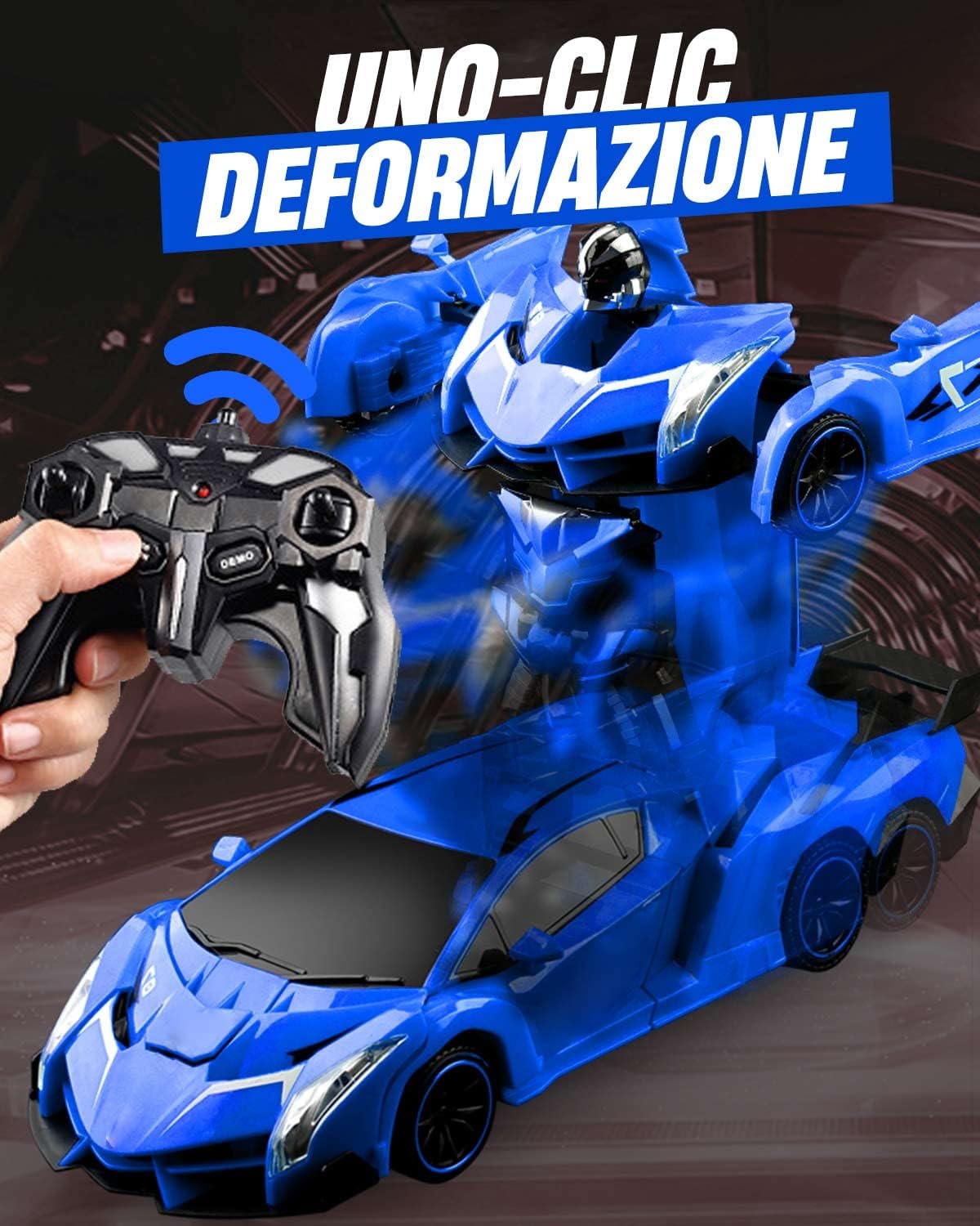 Esperienza di Guida Realistica: L’auto radiocomandata ha un sistema di radiotrasmissione da 2.4 GHz. Possiede luci a led con forte illuminazione al buio che assicura divertimento ai bambini. Splendido design. Il suono del motore è molto realistico e può compiere, anche in modalità robot, rotazioni di 360°. 2 Design in 1: l'automobile si trasforma in robot. La macchina radiocomandata è riprodotta in scala 1:18. Con un semplice click sul telecomando cambierà automaticamente da auto al robot. Quando premi il pulsante DEMO sul telecomando, c'e' una funzione di movimento. Facile da usare. Giocattolo RC Ricaricabile: l’auto è dotata di 1 Batteria al Litio Ricaricabile, tramite usb da 1.2 V AA, potenti e di grande capacità di durata e soprattutto adatta e sicura per i bambini. Ottimo per giocare all’interno e all’esterno. Il controller richiede 2 batteria da 1,5v AA (non comprese). Materiali Sicuri: il telecomando e la macchina sono di alta qualità , fatti con materie plastiche ABS, anti goccia, sicuri e non tossici. Assolutamente sicuri per i bambini. Ottimo Regalo per i Bambini: il nostro gioco è adatto per tenere i bambini lontani dal computer, dai telefoni cellulari e dalla TV; migliora la loro capacità di pensare. Il controllo a distanza che trasforma l'auto in robot può coltivare lo spirito avventuroso dei bambini e stimolare la loro immaginazione. Il giocattolo è il miglior regalo per ragazzi e ragazze per qualsiasi evenienza come compleanni e Natale.