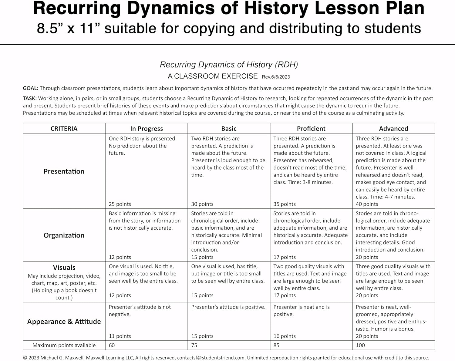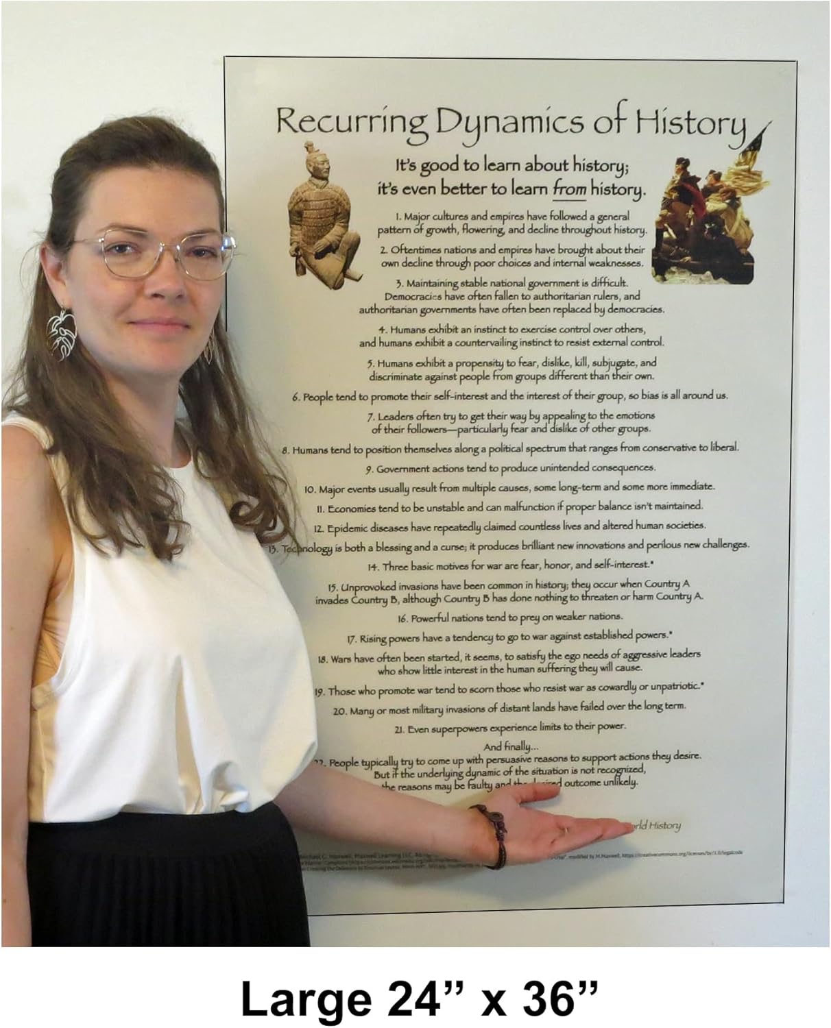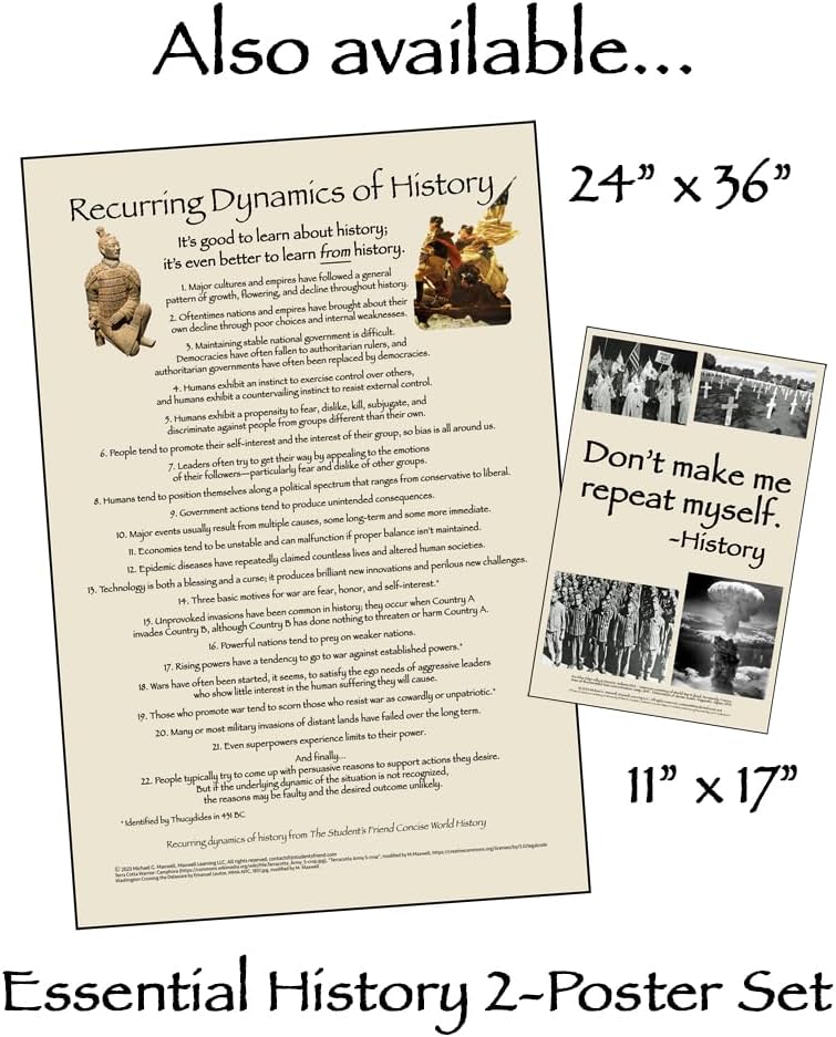 LA STORIA SI RIPETE. Questo grafico elenca ventidue delle più importanti Dinamiche ricorrenti della storia che si sono ripetute più volte in passato e probabilmente si ripeteranno di nuovo in futuro. Ma la storia non deve ripetersi. Possiamo imparare dagli errori del passato a fare scelte più saggie in futuro. QUESTA È LA CONOSCENZA STORICA DI BASE Nessuno studente o cittadino può comprendere adeguatamente il funzionamento del mondo senza la consapevolezza di queste dinamiche. INCLUSO ANCHE: un piano di lezione di Dinamica ricorrente della storia. Poster di alta qualità stampato offset su 54,4 kg di qualità. carta con finitura satinata. Pubblicato e stampato negli Stati Uniti da Maxwell Learning. U.S. Copyright TX9-255-671.
