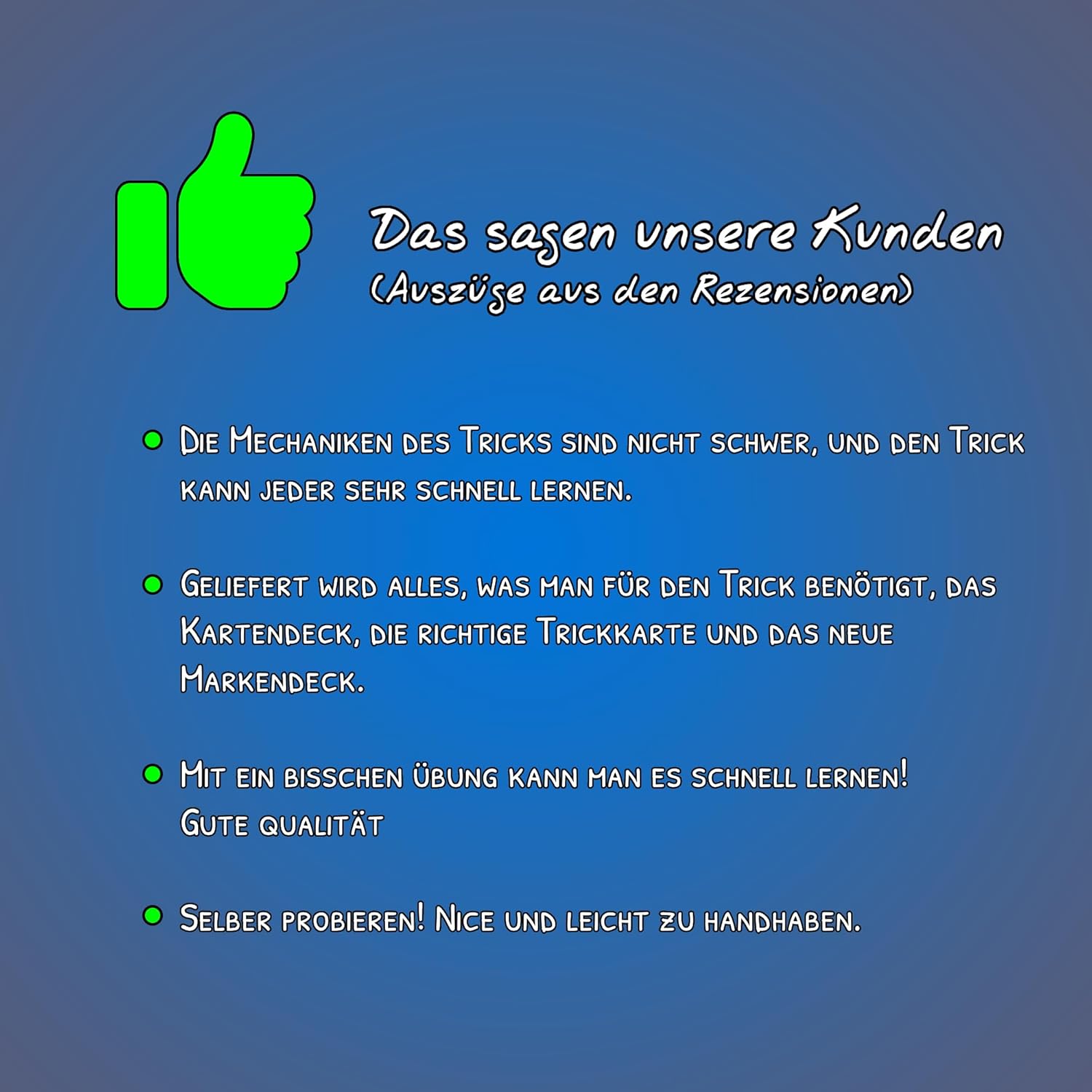 ✅ Stupisci i tuoi spettatori scegliendo il colore di un intero mazzo di carte INCL. Trasforma la scatola delle carte ✅ Vengono descritte due varianti dimostrative. Con uno di essi è possibile trasformare anche l'ultima carta in mano allo spettatore: questi effetti funzionano come una vera magia ✅ Questo trucco magico può essere imparato rapidamente con poca pratica ed è quindi adatto a principianti ambiziosi ✅ Viene fornito un mazzo di poker da bicicletta di alta qualità con espedienti, istruzioni video (inglese) e istruzioni scritte in tedesco. Questo contiene anche un effetto bonus leggermente diverso dall'effetto base e quindi ha un effetto ancora più forte ✅ NOTA IMPORTANTE su un malinteso comune - Purtroppo è stato spesso lamentato che la scatola delle carte è già aperta (senza cellophane). Questo è corretto ed essenziale perché è un mazzo di carte preparato. Affinché diventi questo gioco di carte trucco, il gioco normale deve prima essere aperto e preparato di conseguenza. Tuttavia, il mazzo è ovviamente COMPLETAMENTE NUOVO e non è usato o simile.