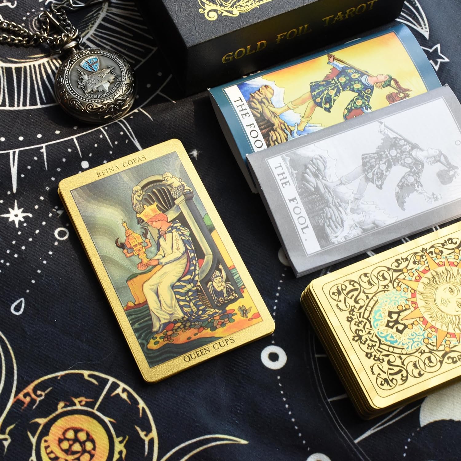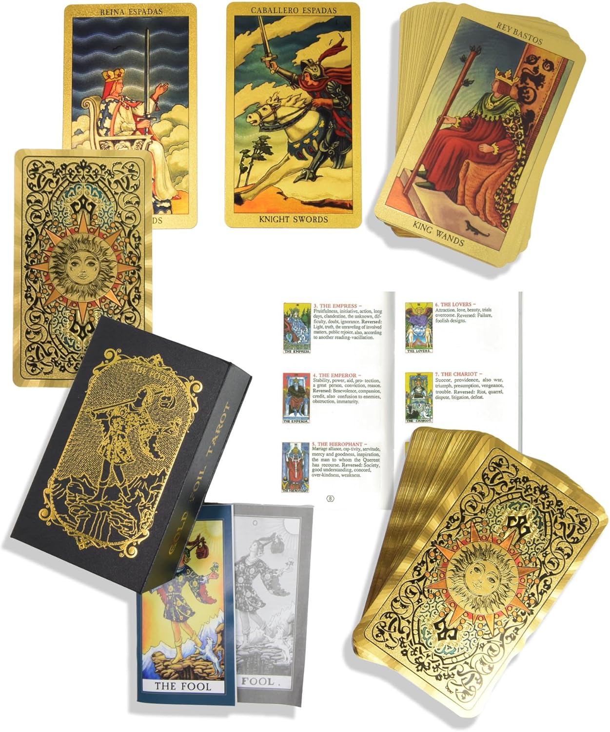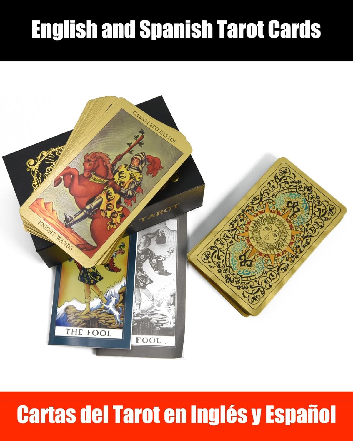 SET COMPLETO: mazzo di 78 carte dei tarocchi con testi in spagnolo e inglese, accompagnato da una guida bilingue a colori di 36 pagine Design premium: carte con elegante finitura dorata e intricati dettagli artistici, presentate in una scatola nera decorativa Materiale durevole: realizzato in PVC di alta qualità, resistente all'acqua e alle pieghe per garantire una lunga durata Guida dettagliata: manuale di istruzioni bilingue di 28 pagine che rende facile l'interpretazione di ogni carta per principianti ed esperti Formato versatile: carte con nomi in spagnolo e inglese Inglese che consente la lettura in entrambe le lingue, ideale per utenti bilingui